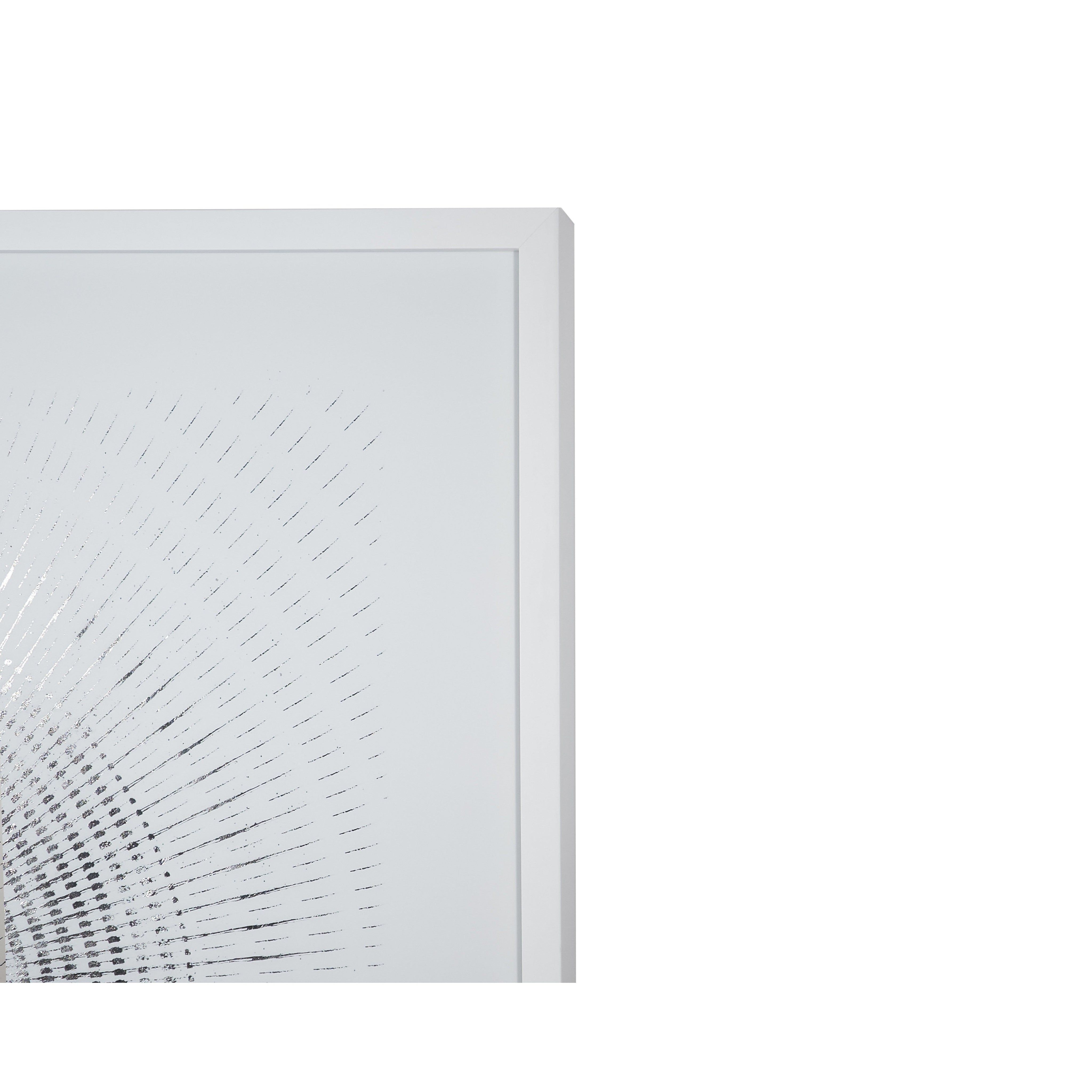 This ornate image from the Luxe Art collection has a mesmerizing effect. Printed on acrylic, it features a glossy white background with a silver leaf starburst. Silver leaf is carefully hand applied in a technique that allows the intricate texture to be visible to the naked eye. Finished with a white wood floater frame. Due to the reflective nature of acrylic and silver leaf, images on site may not capture the artisanal characteristics precisely. Hand-finished items will vary from piece to piece, resulting in a truly one-of-a-kind artwork.