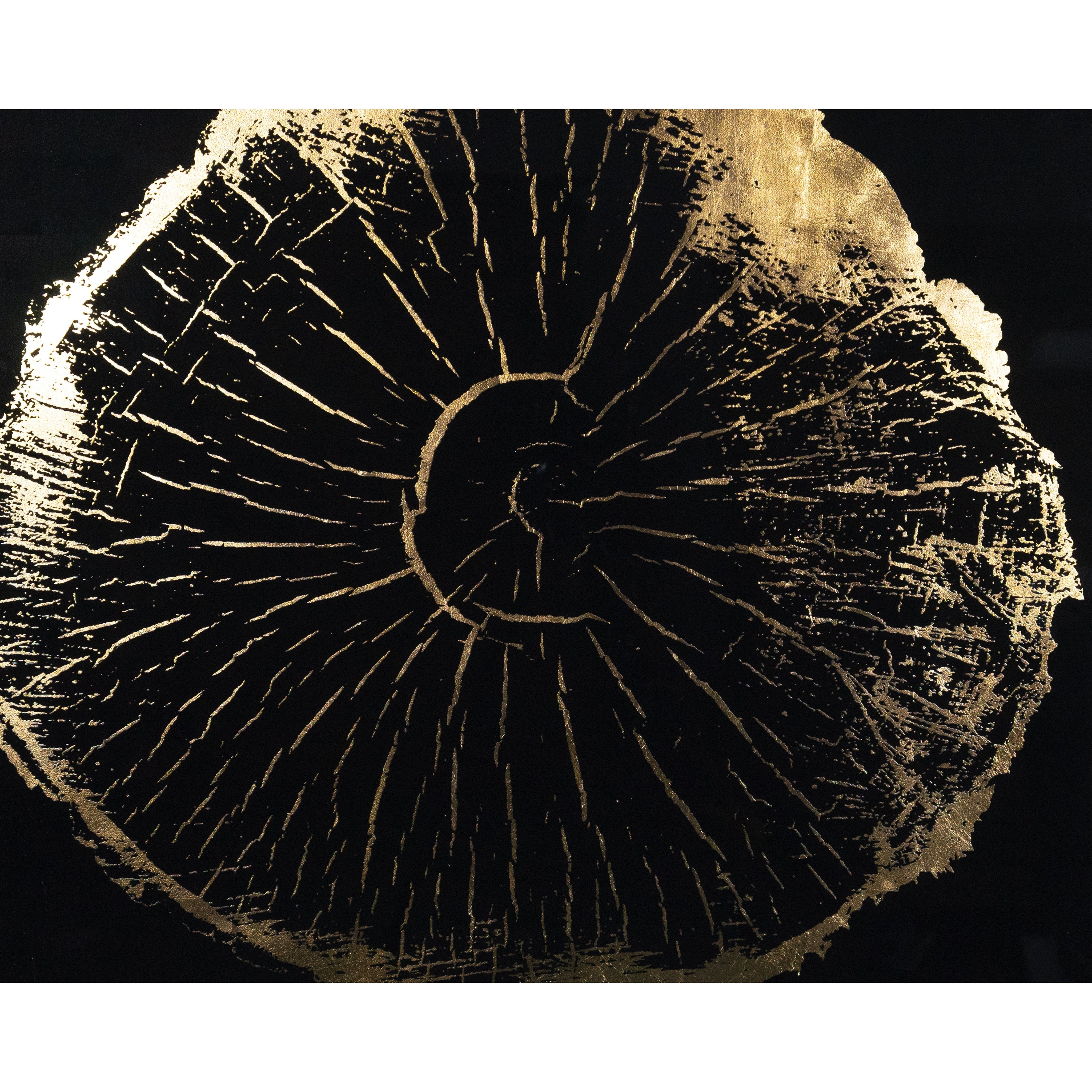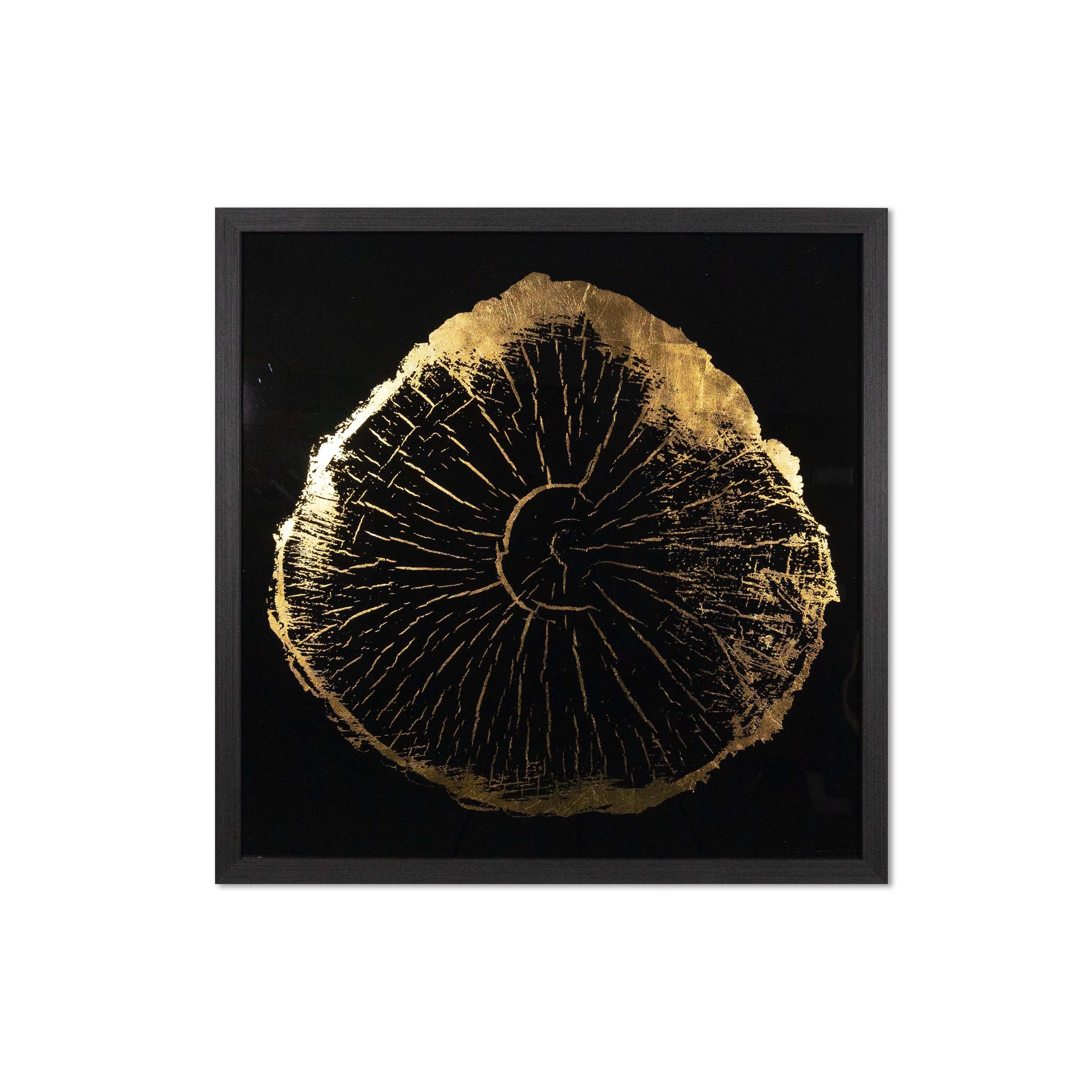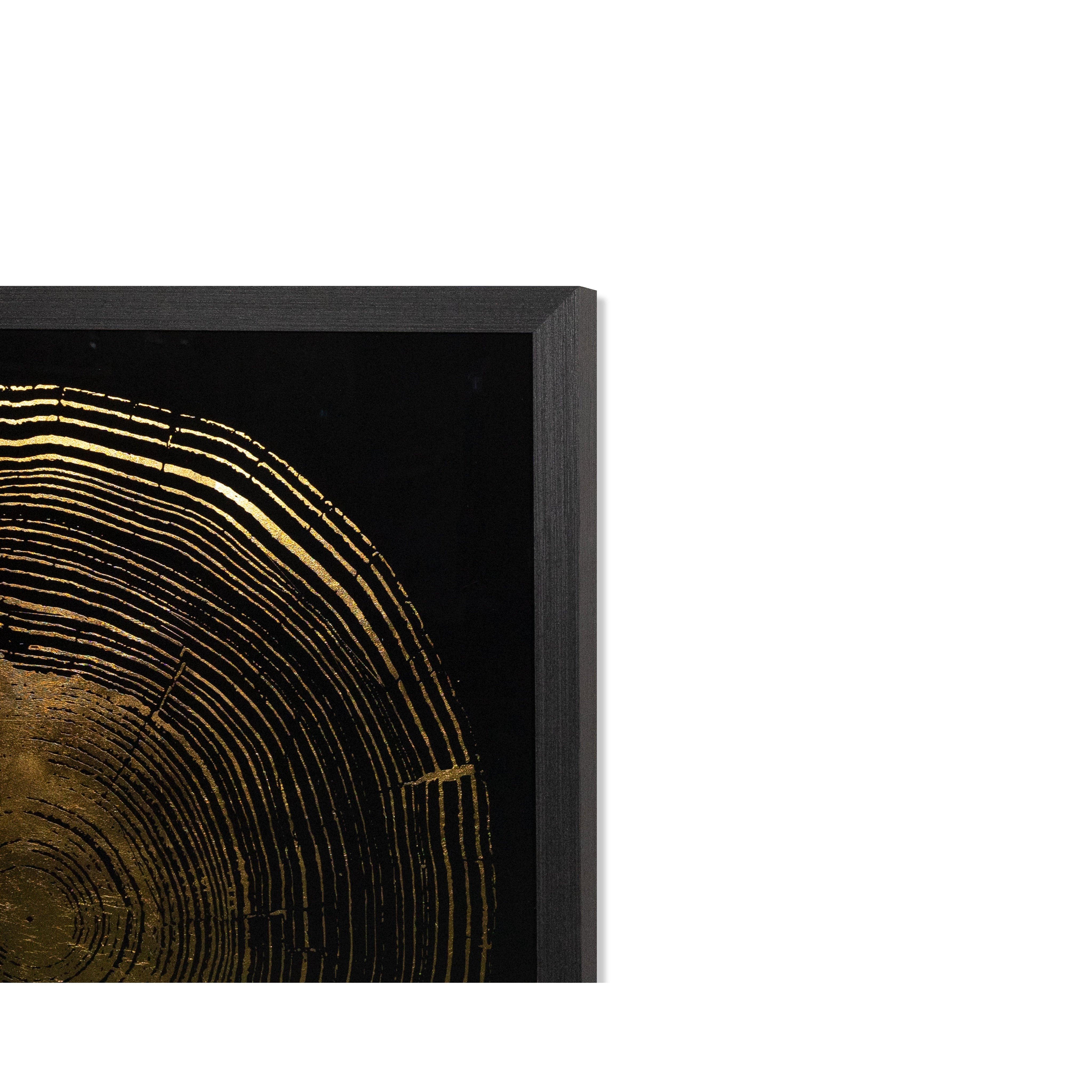 This set of four incredible pieces from the Luxe Art collection depicts the aging beauty of tree rings. Accentuated with gold highlights on a black background. Install in varying orientations for a unique effect. A part of our Luxe Art collection, these reverse printed acrylic paintings with gold leaf accents are completed with brushed solid wood frames in charcoal. Due to the reflective nature of acrylic and gold leaf, images on site may not capture the artisanal characteristics precisely.