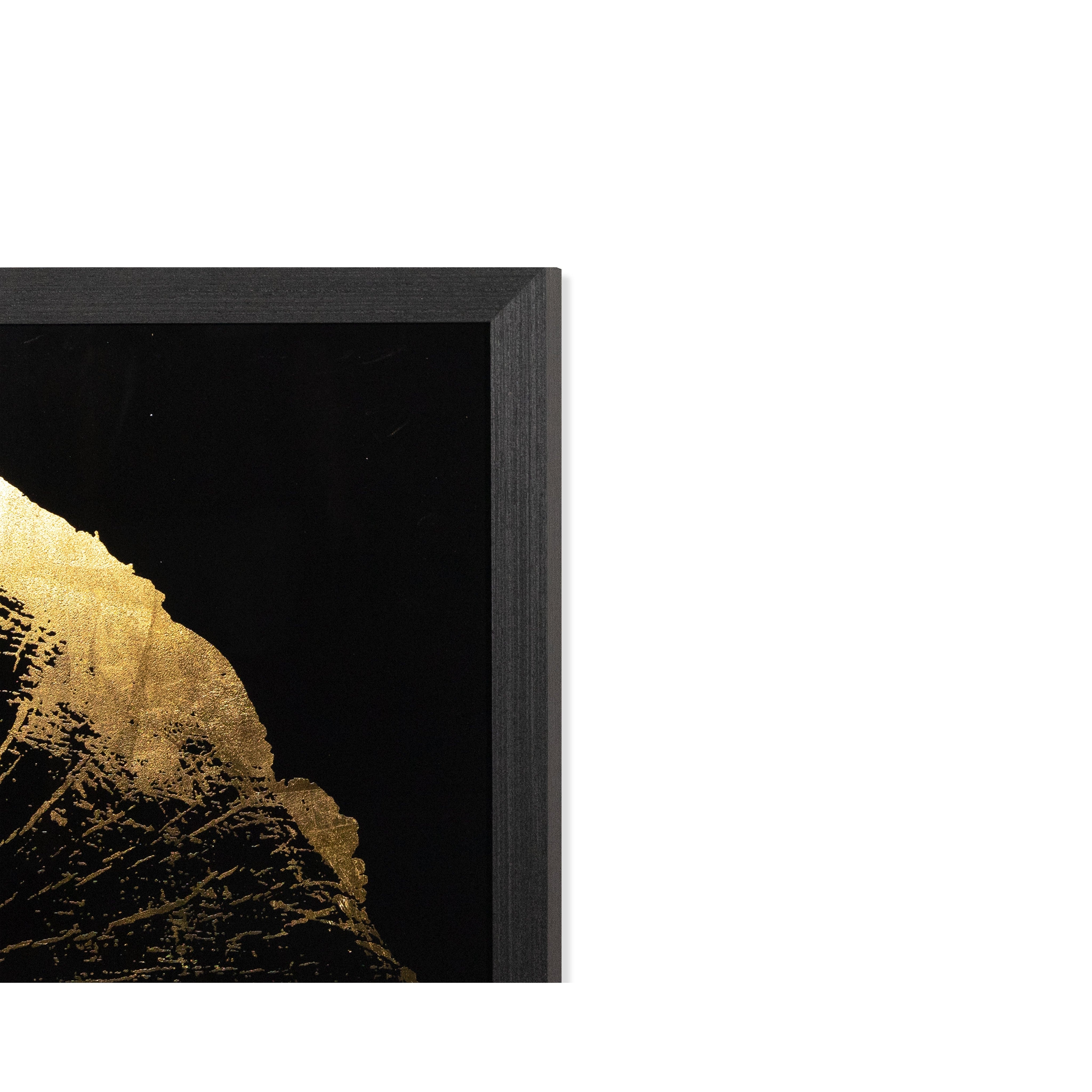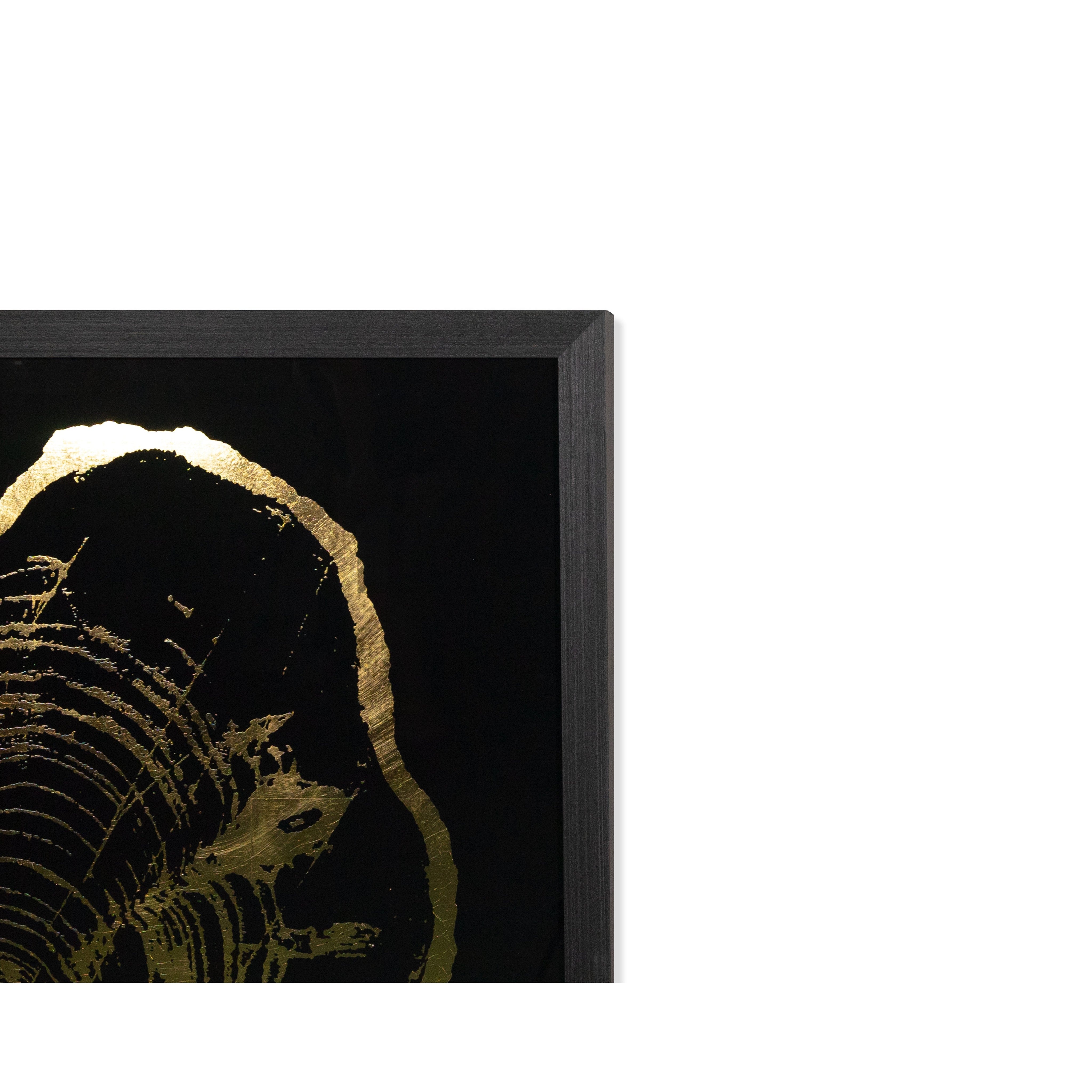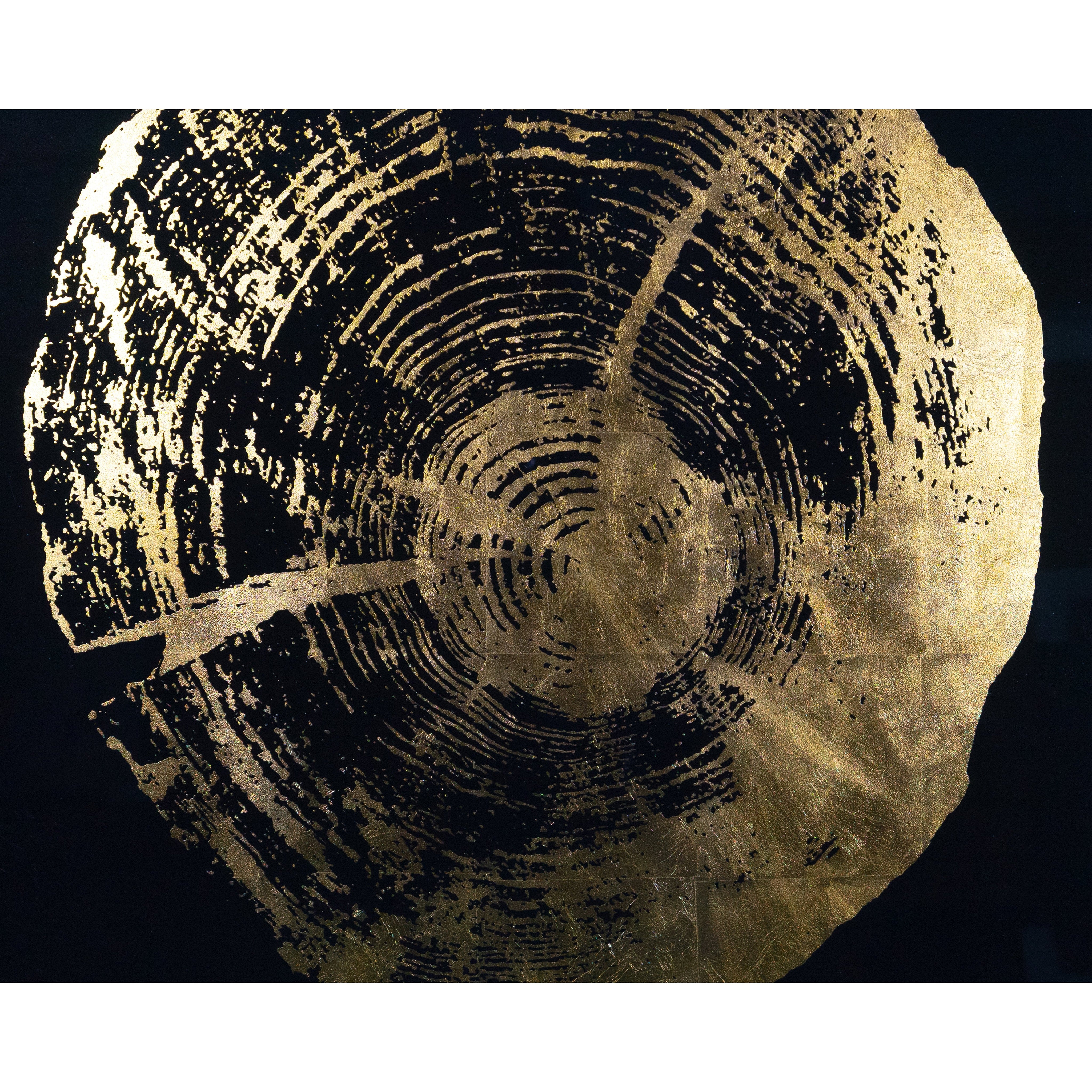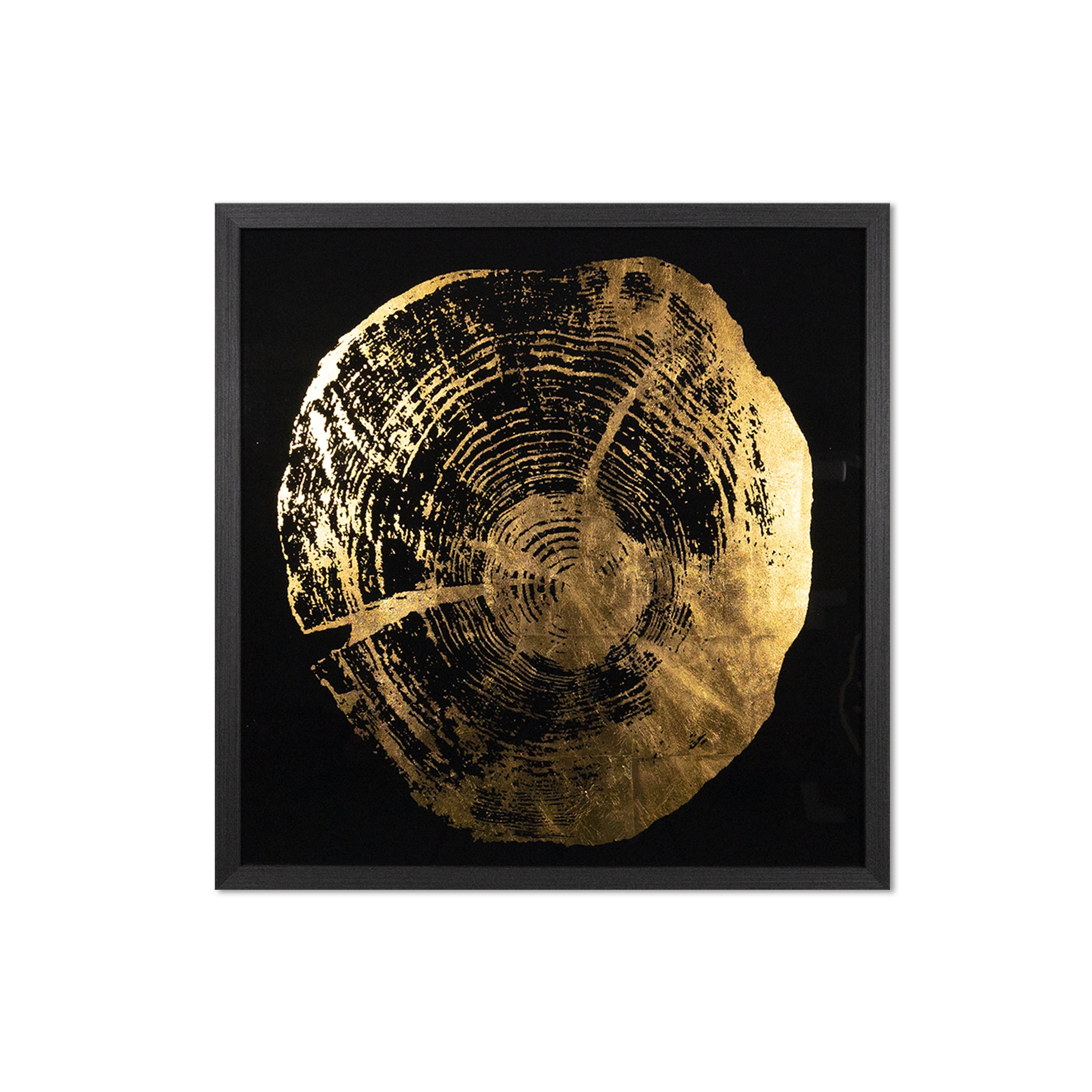 This set of four incredible pieces from the Luxe Art collection depicts the aging beauty of tree rings. Accentuated with gold highlights on a black background. Install in varying orientations for a unique effect. A part of our Luxe Art collection, these reverse printed acrylic paintings with gold leaf accents are completed with brushed solid wood frames in charcoal. Due to the reflective nature of acrylic and gold leaf, images on site may not capture the artisanal characteristics precisely.