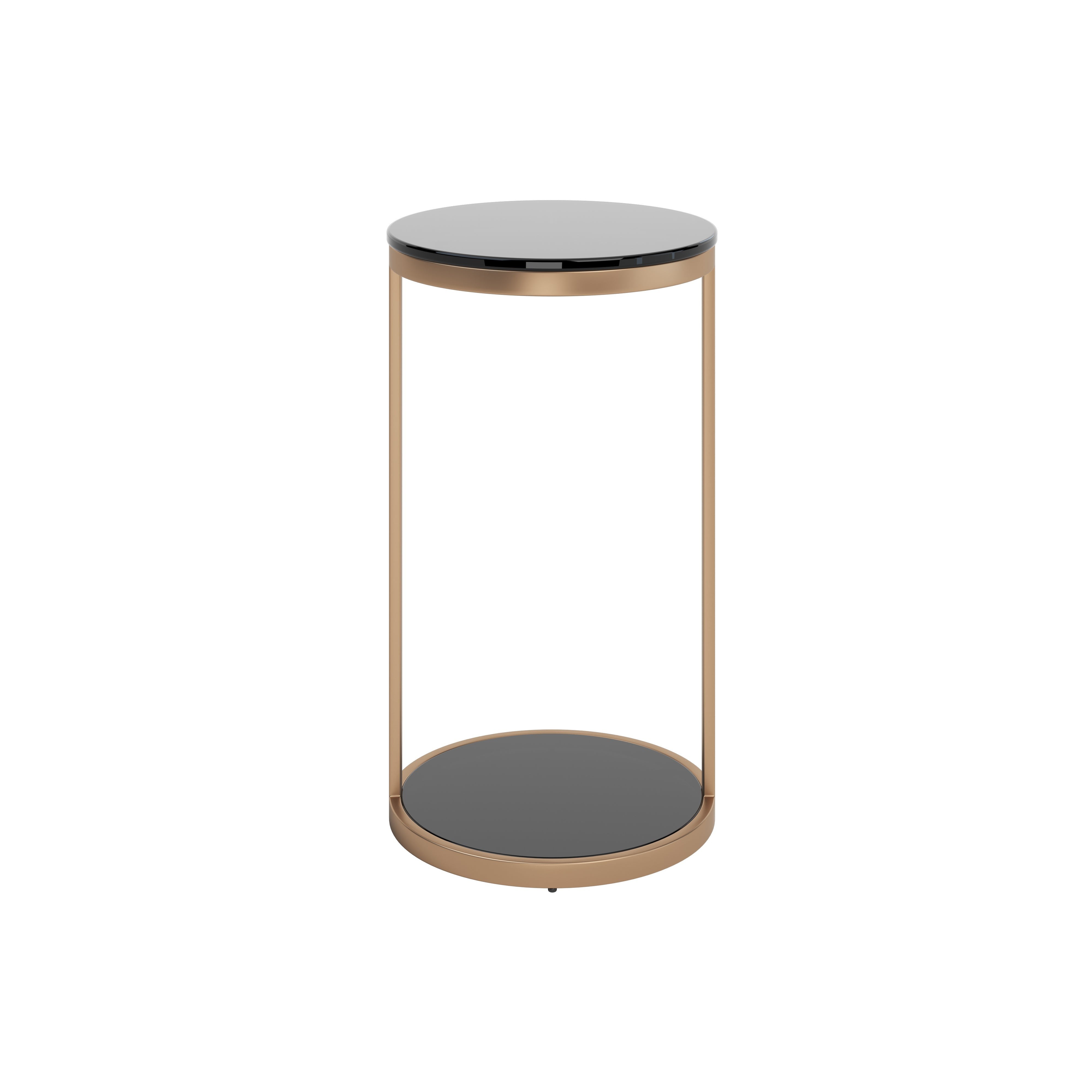 This end table features tempered black glass on an antique brass steel base. Perfect for compact spaces in both transitional and modern environments.