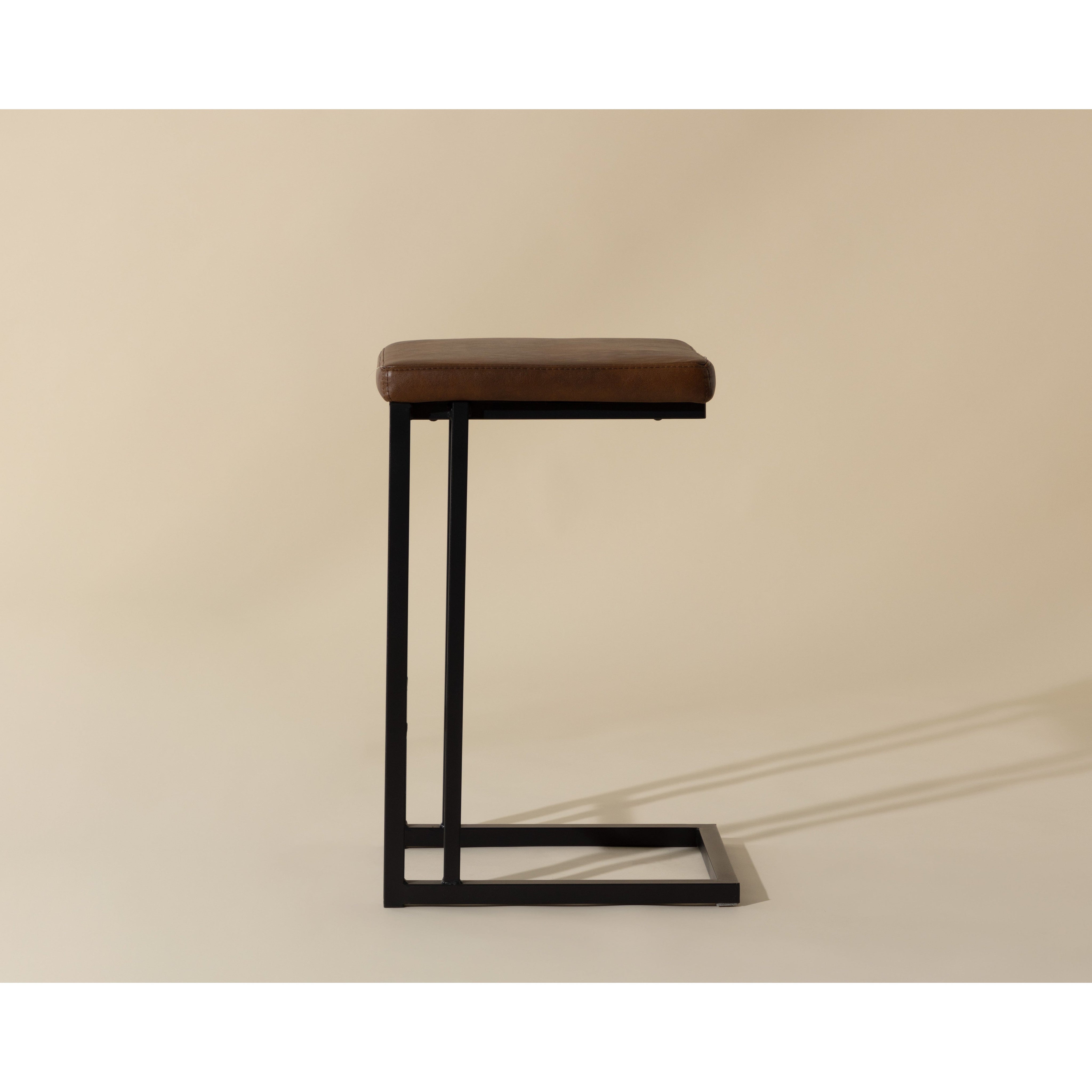 A modern industrial stool featuring a backless seat in onyx faux leather and a cantilever frame with footrest in grey powder-coated steel. Designed for residential and commercial environments. Suitable for various dining, kitchen and bar spaces of all sizes.