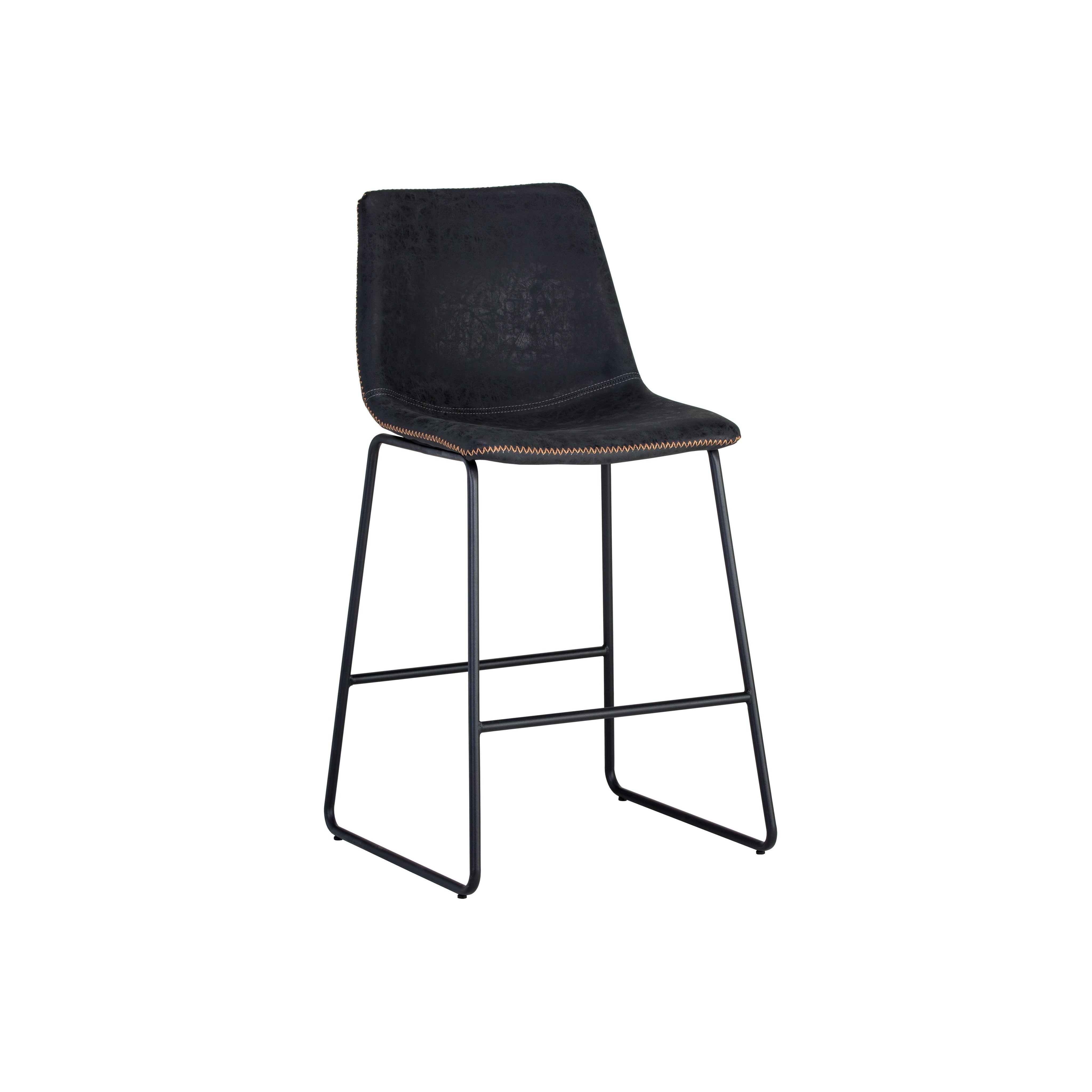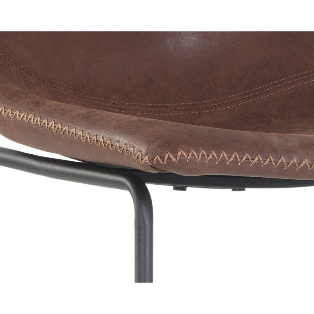 A comfortable and compact counter stool. Features a simple, mid-century silhouette and finished with a brushed black steel frame. Stocked in antique brown faux leather. Suitable for various dining, kitchen and bar spaces of all sizes.