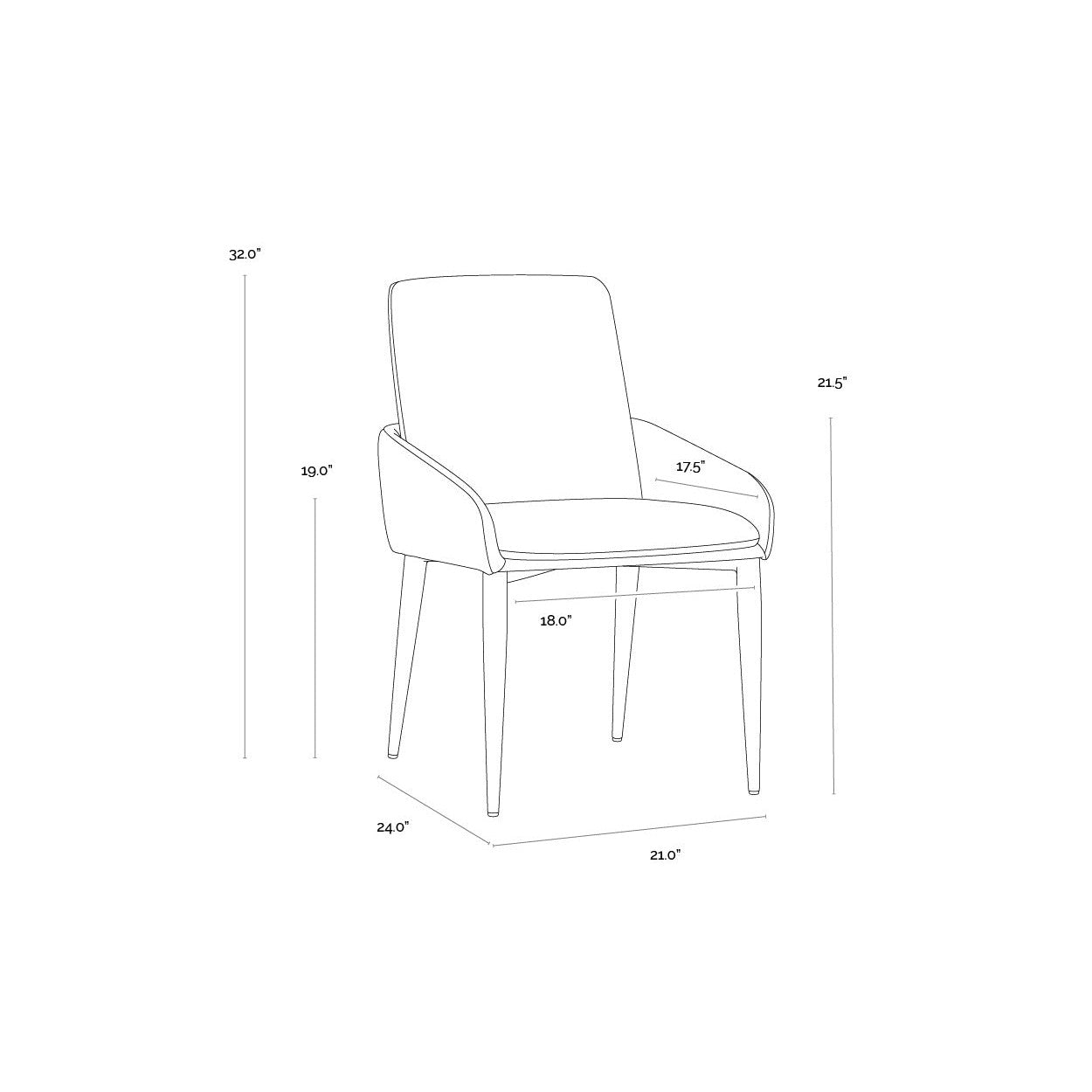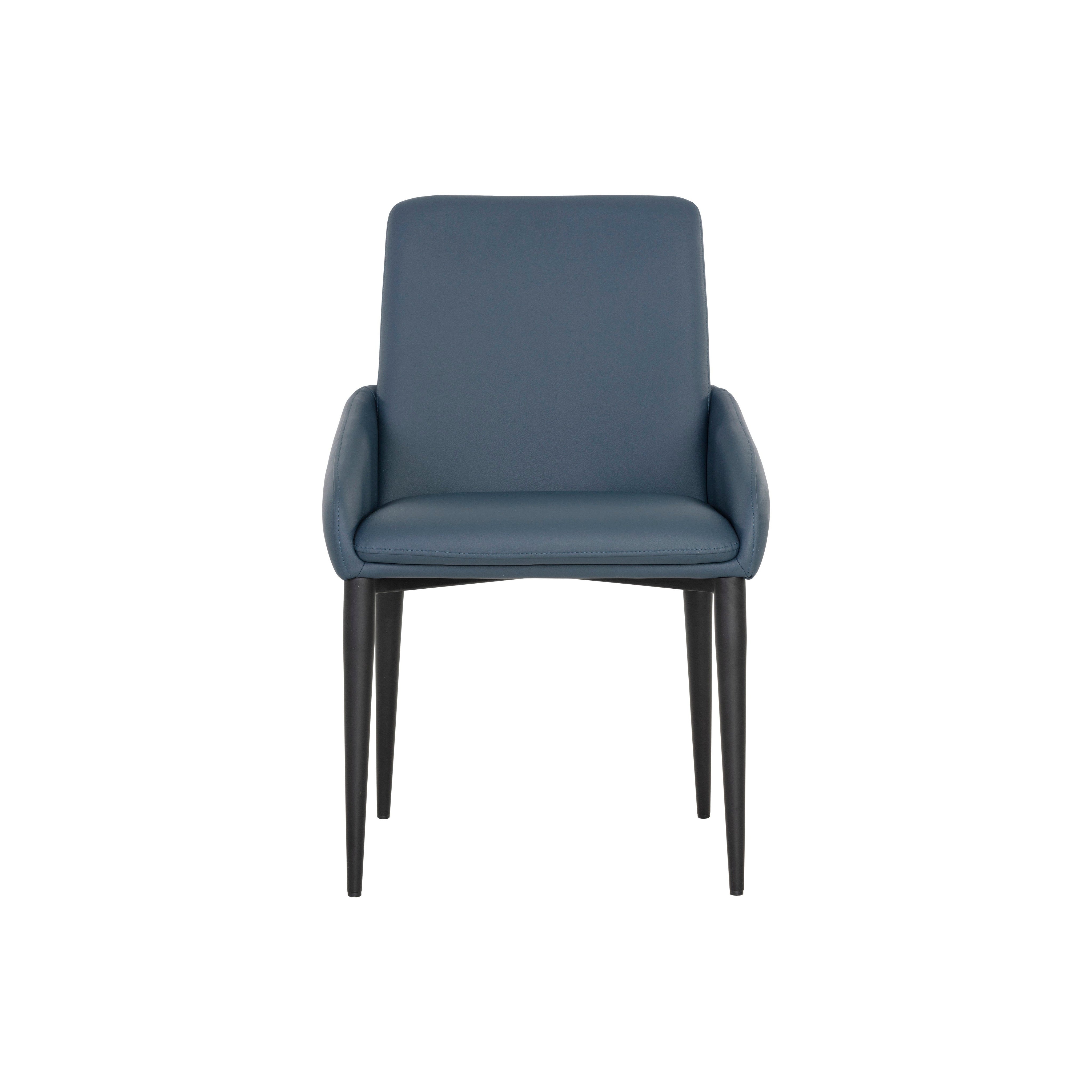 Add a touch of sophistication to dining spaces with this stylish dining armchair that features curved armrests. Upholstered in dillon thunder faux leather and features black powder-coated iron legs. Handle With Care: This design has been crafted with faux leather. Faux leather is manufactured to reflect the natural characteristics of leather; as such, colour variations, markings wrinkles, grooves, and light scratches are appreciated characteristics. No two pieces will be alike. Visit our Product Care page for more information on how to ensure the lasting beauty of this piece.