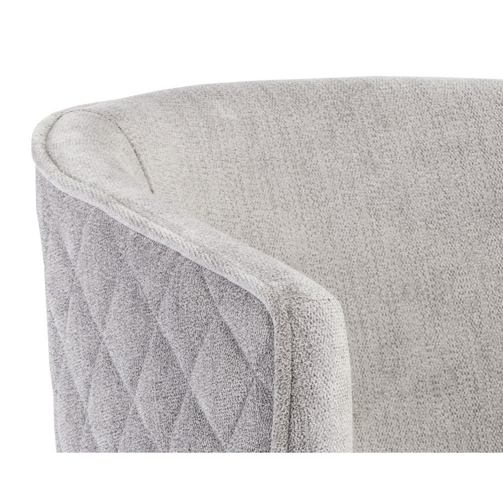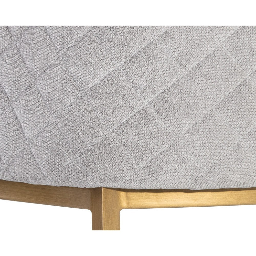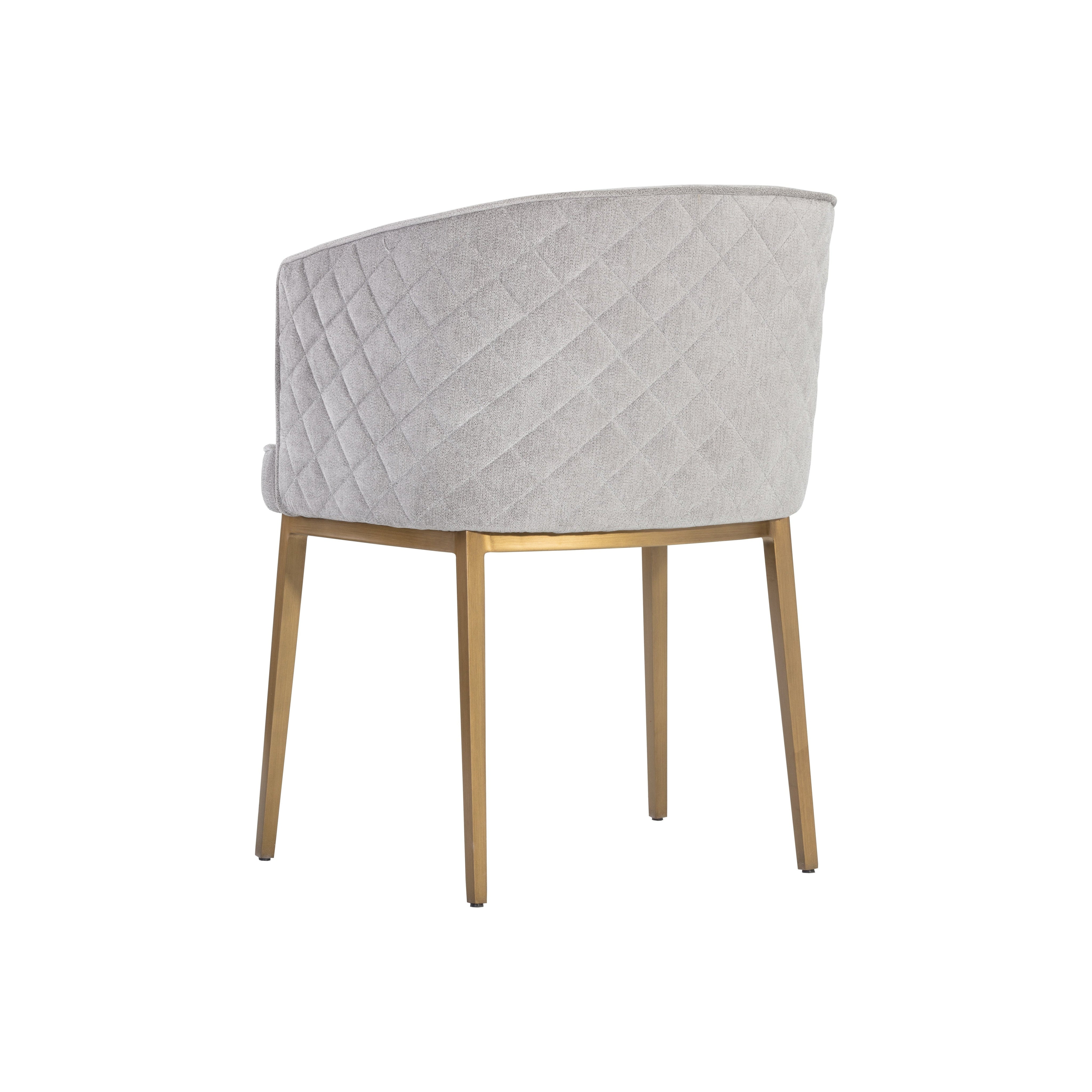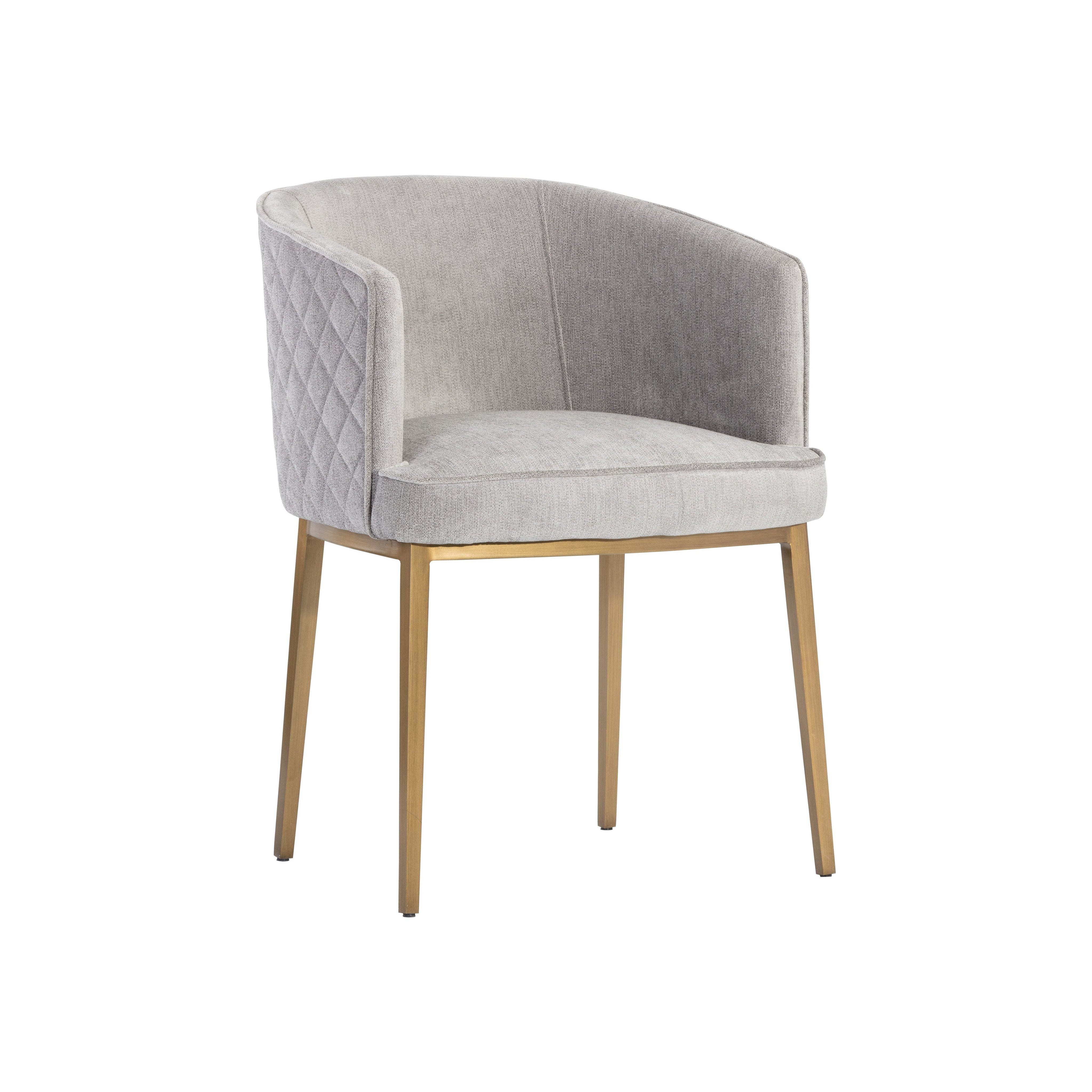 Feminine flair comes to life in this modern dining chair. Stocked in our polo club stone performance fabric with elegant diamond stitching on the exterior seatback. An antique brass steel frame completes the look. Performance fabric is moisture repellent, durable and easy to clean.