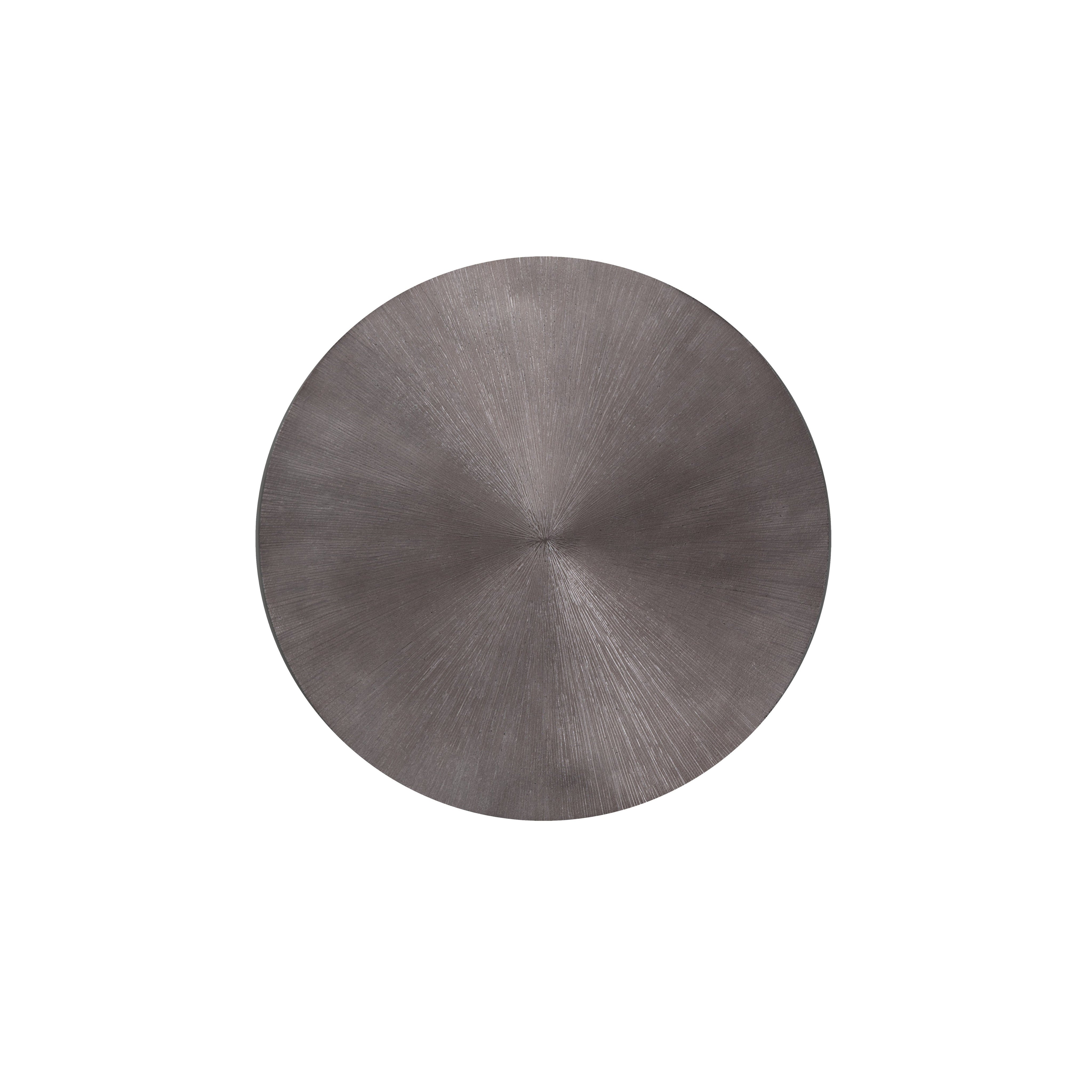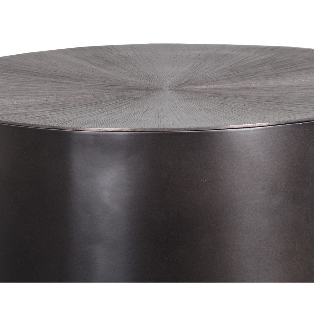 A captivating side table from the Ferrous collection with an alluring bronzed gunmetal finish. Features a hand-etched and hand-hammered top with a drum style base. This piece will add a contemporary flair to living, lounge and office spaces. Made in India. With refined craftsmanship, this design was brought to life by skilled local artisans. Due to the nature of handcraftsmanship, unique imperfections such as fissures, markings and variations in colour and shape are welcomed and appreciated characteristics for a truly one-of-a-kind piece.