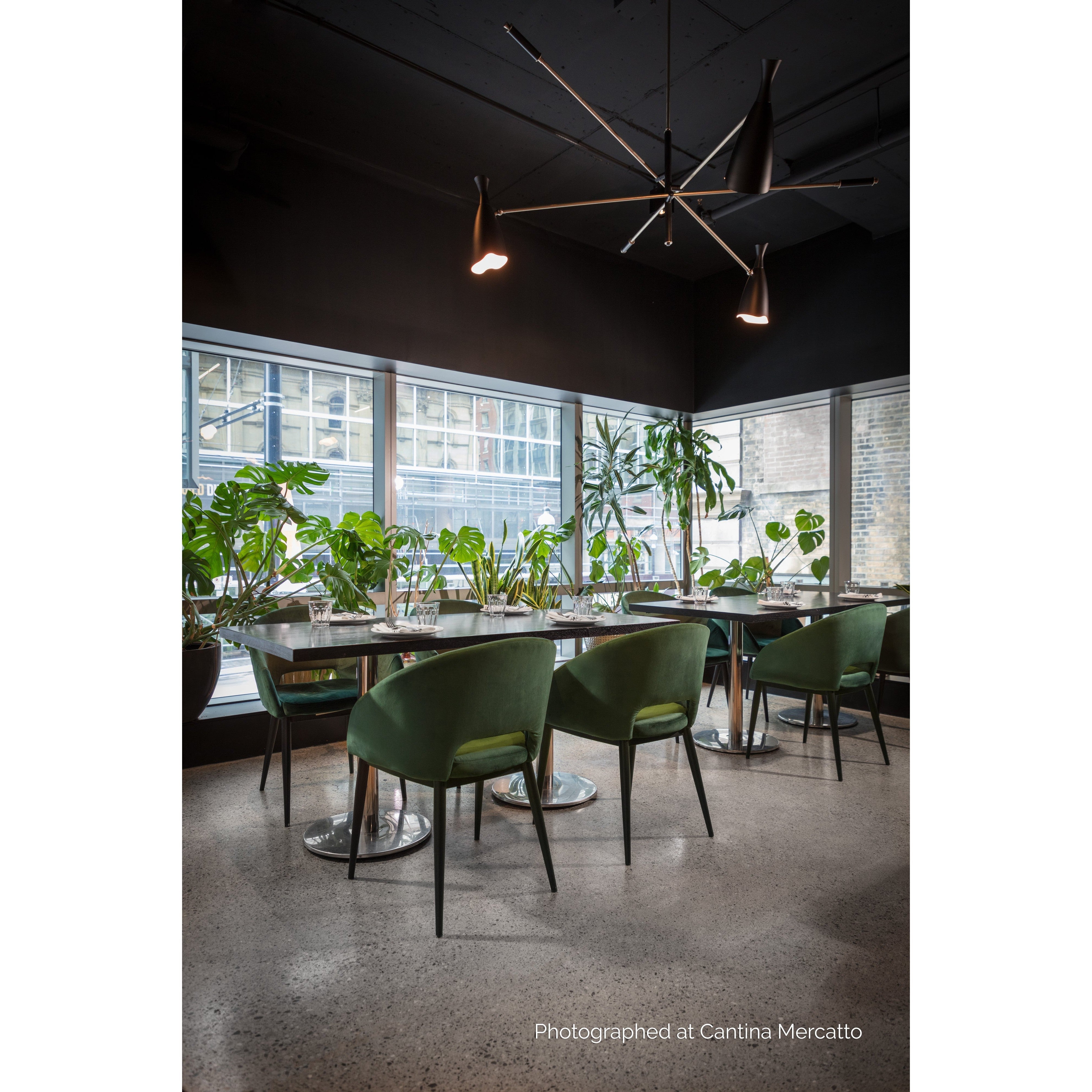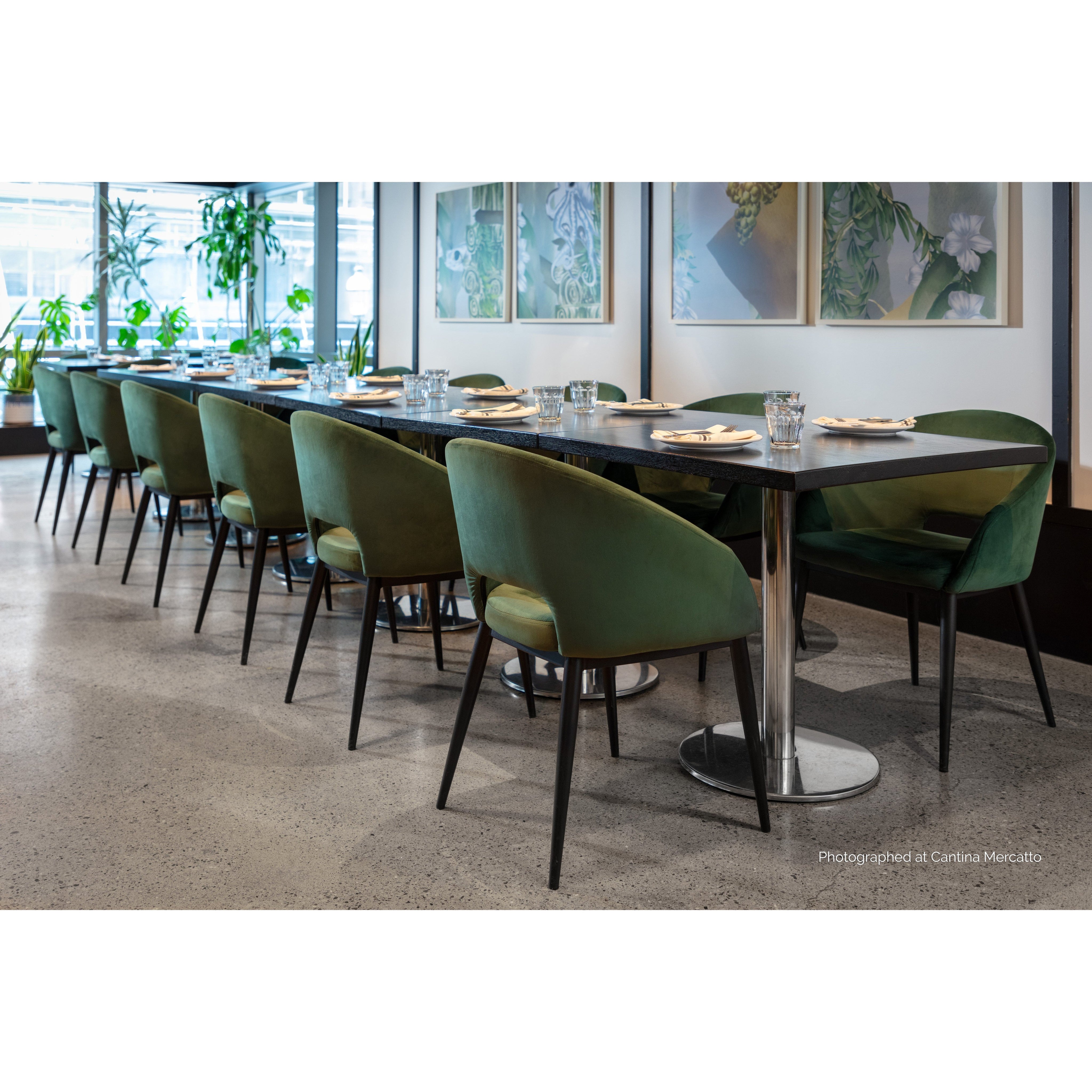 This compact barrel back dining armchair is effortlessly cool. Stocked in deep green sky fabric with a black powder-coated steel frame.