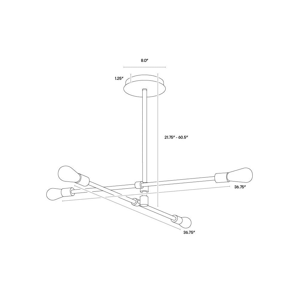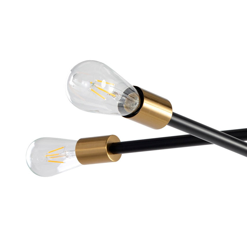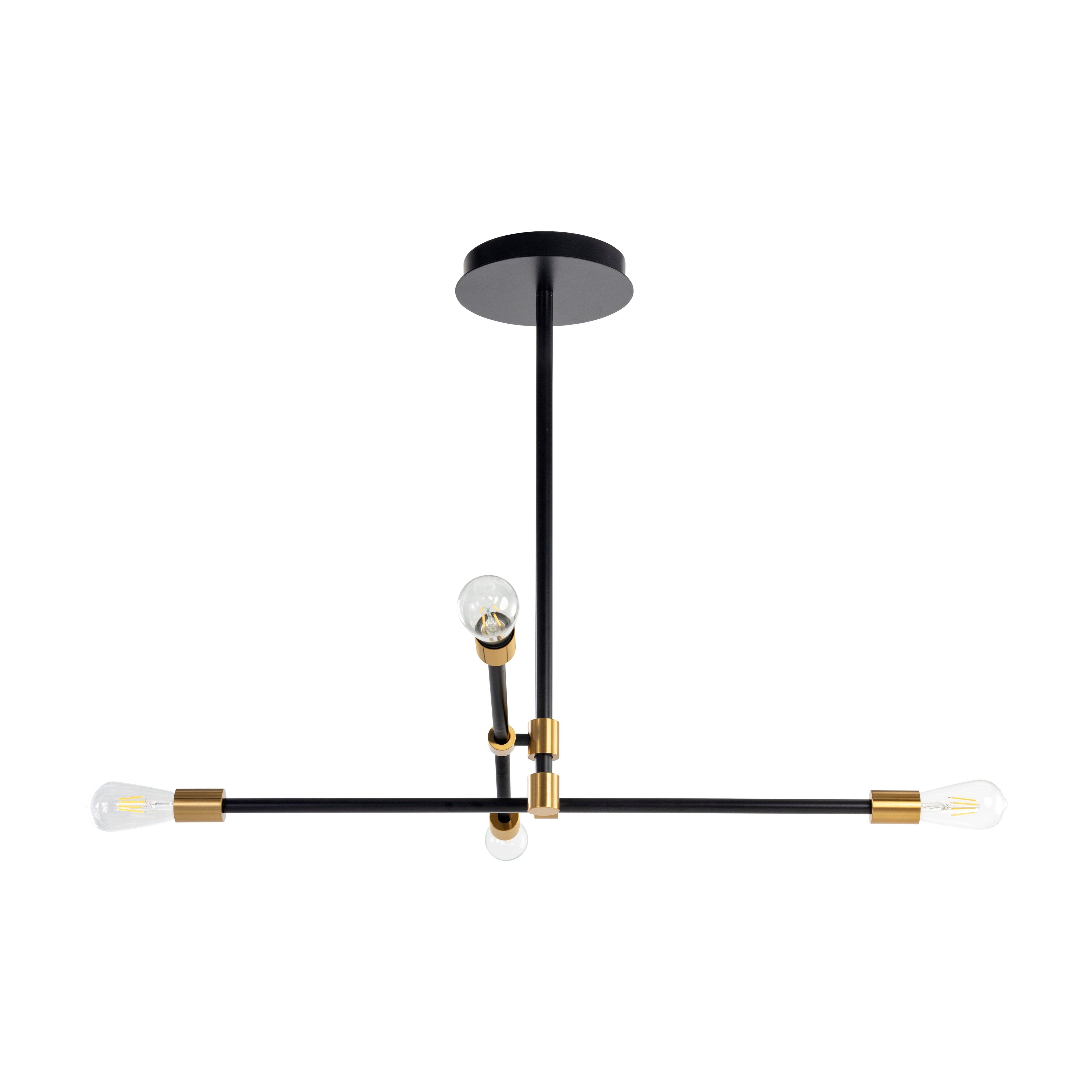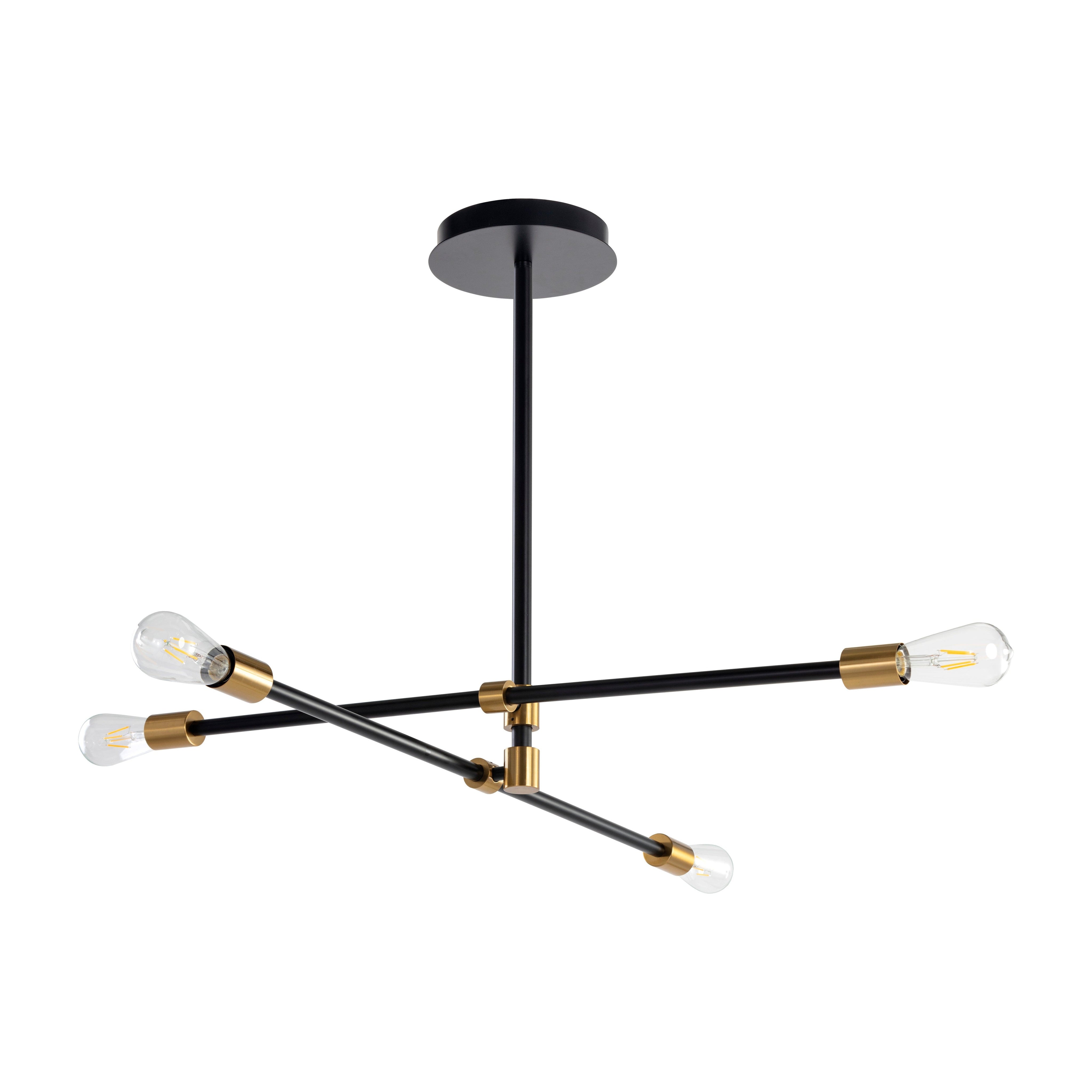 Complete an intriguing space with this modern sputnik-style chandelier. Features two adjustable crossing arms that can be rearranged. Crafted from iron with black and brass finishes. Install multiples for a dramatic look. Requires 4 light bulbs and maximum 40 watts each.