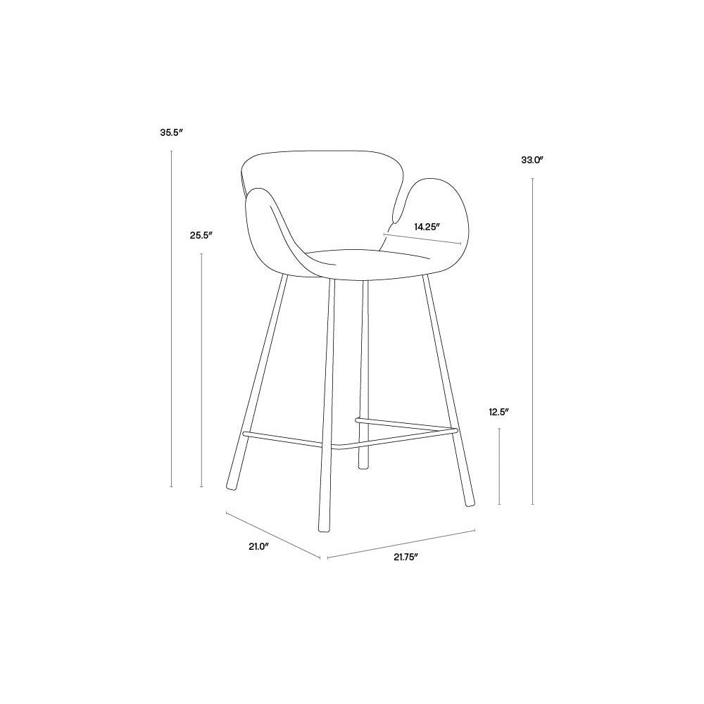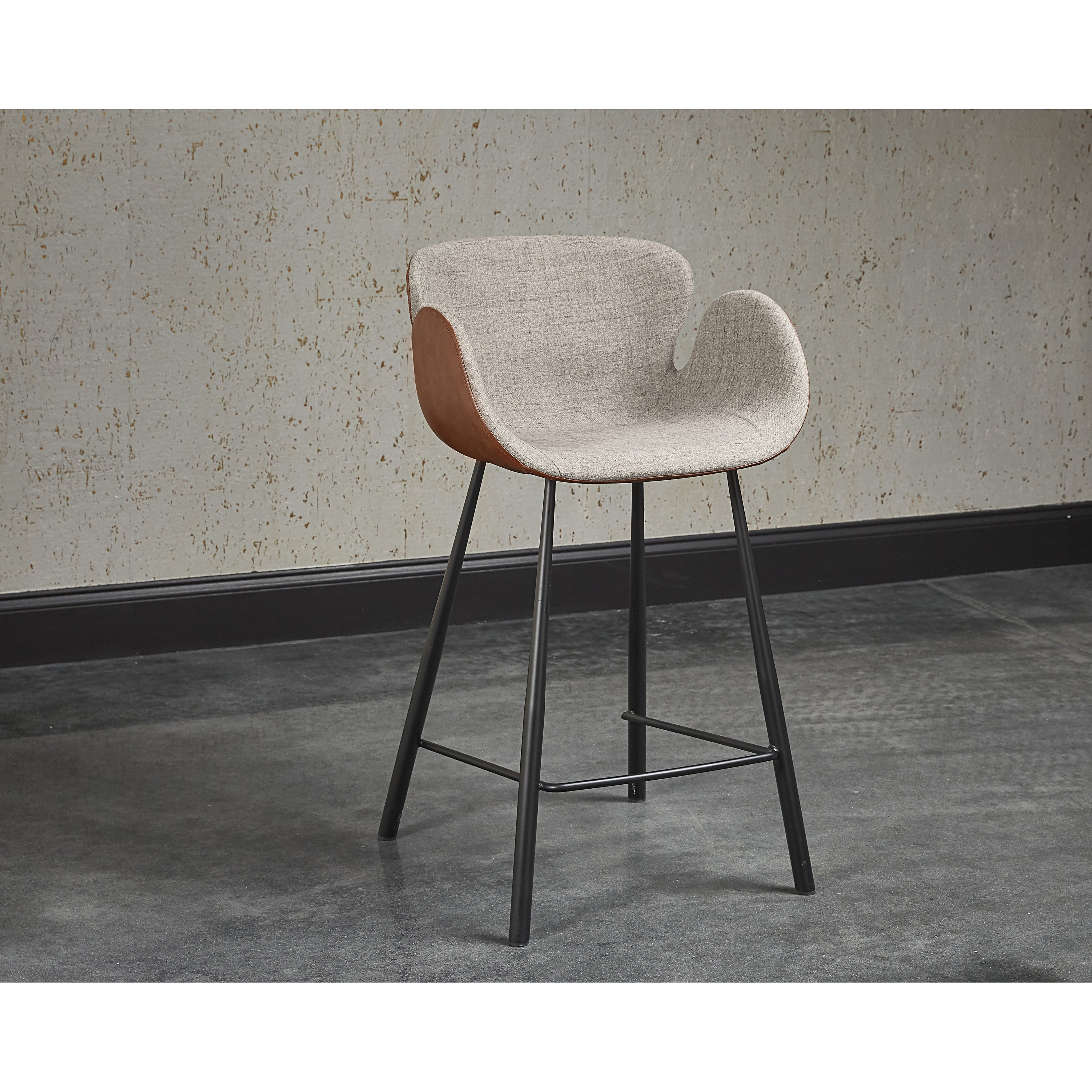 This comfortable counter stool combines mid-century modern style with urban design elements. Stocked in november grey fabric with a cinnamon brown bonded leather exterior, and black powder-coated iron legs and footrest. Suitable for various dining, kitchen and bar spaces of all sizes. Handle with Care: This design has been crafted with bonded leather. Bonded leather is a blend of reconstituted leather and synthetic materials crafted to reflect the natural characteristics of leather; as such, colour variations, markings, wrinkles, grooves and light scratches are acceptable and appreciated characteristics. No two pieces are alike. Visit our Product Care page for more information on how to ensure the lasting beauty of this piece.
