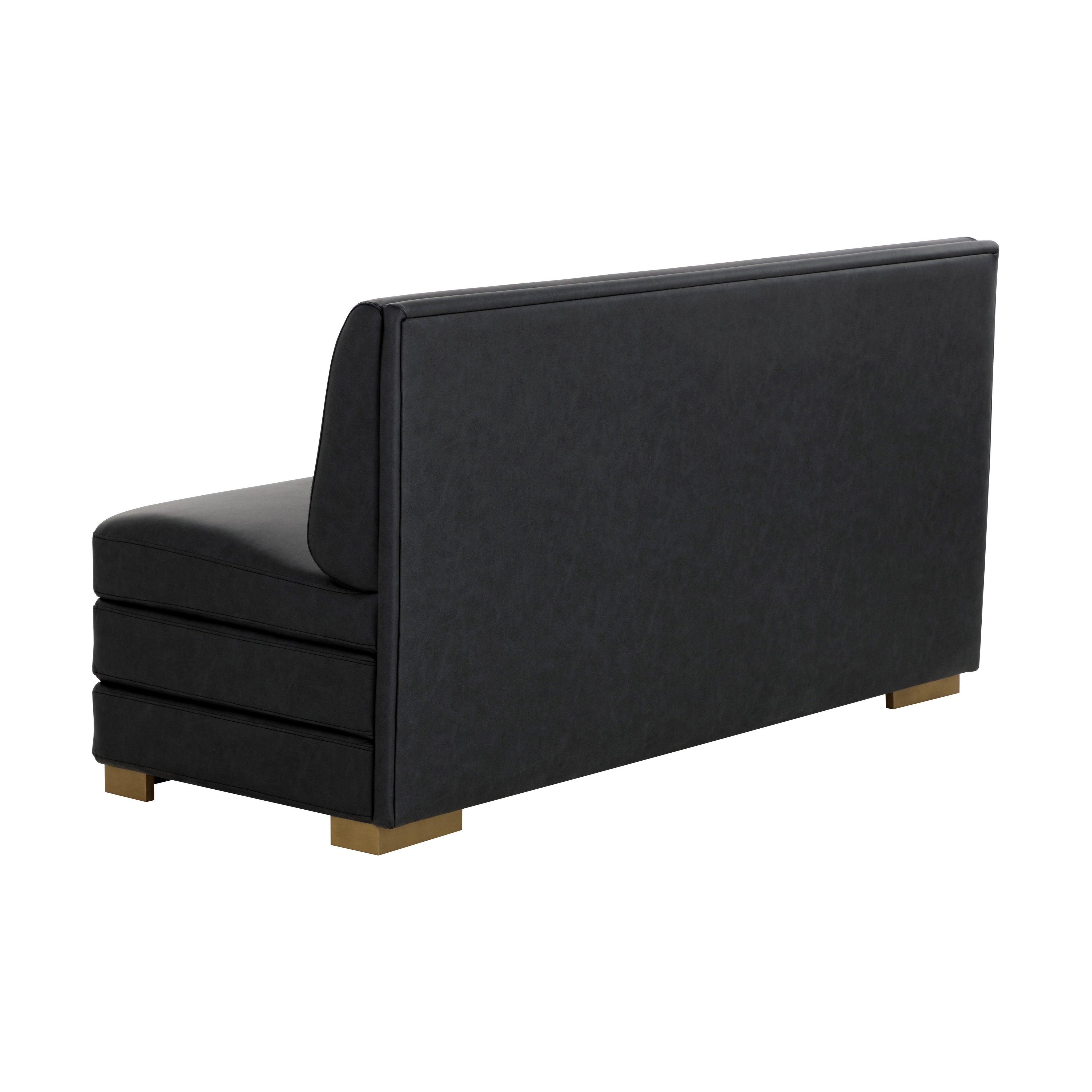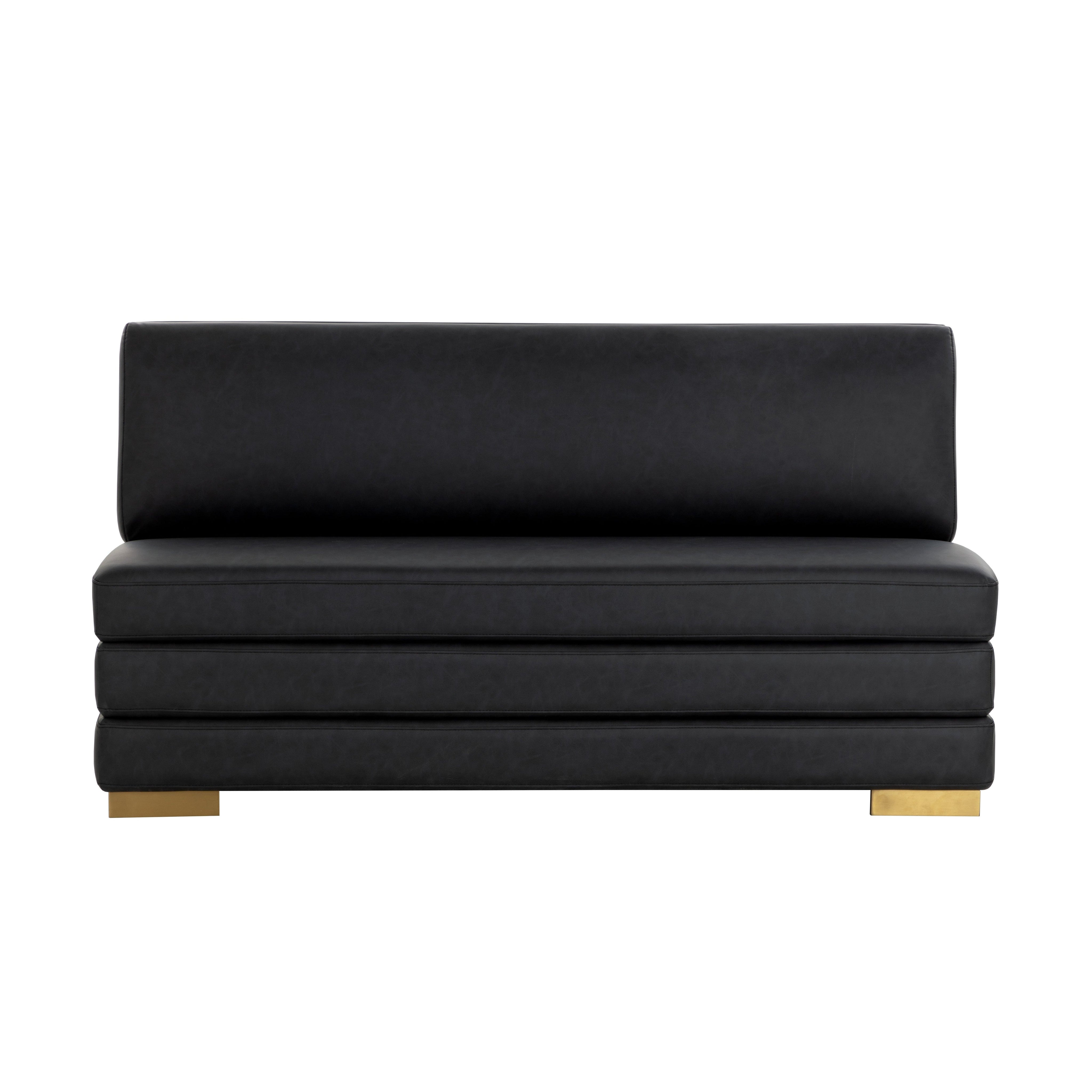 The streamlined design of the Radcliff Banquette enhances the elegance and comfort of your favourite nook. Upholstered in bravo black faux leather with gold stainless steel legs, it is a combination of durability and style. Handle With Care: This design has been crafted with faux leather. Faux leather is manufactured to reflect the natural characteristics of leather; as such, colour variations, markings, wrinkles, grooves, and light scratches are appreciated characteristics. No two pieces will be alike. Visit our Product Care page for more information on how to ensure the lasting beauty of this piece.