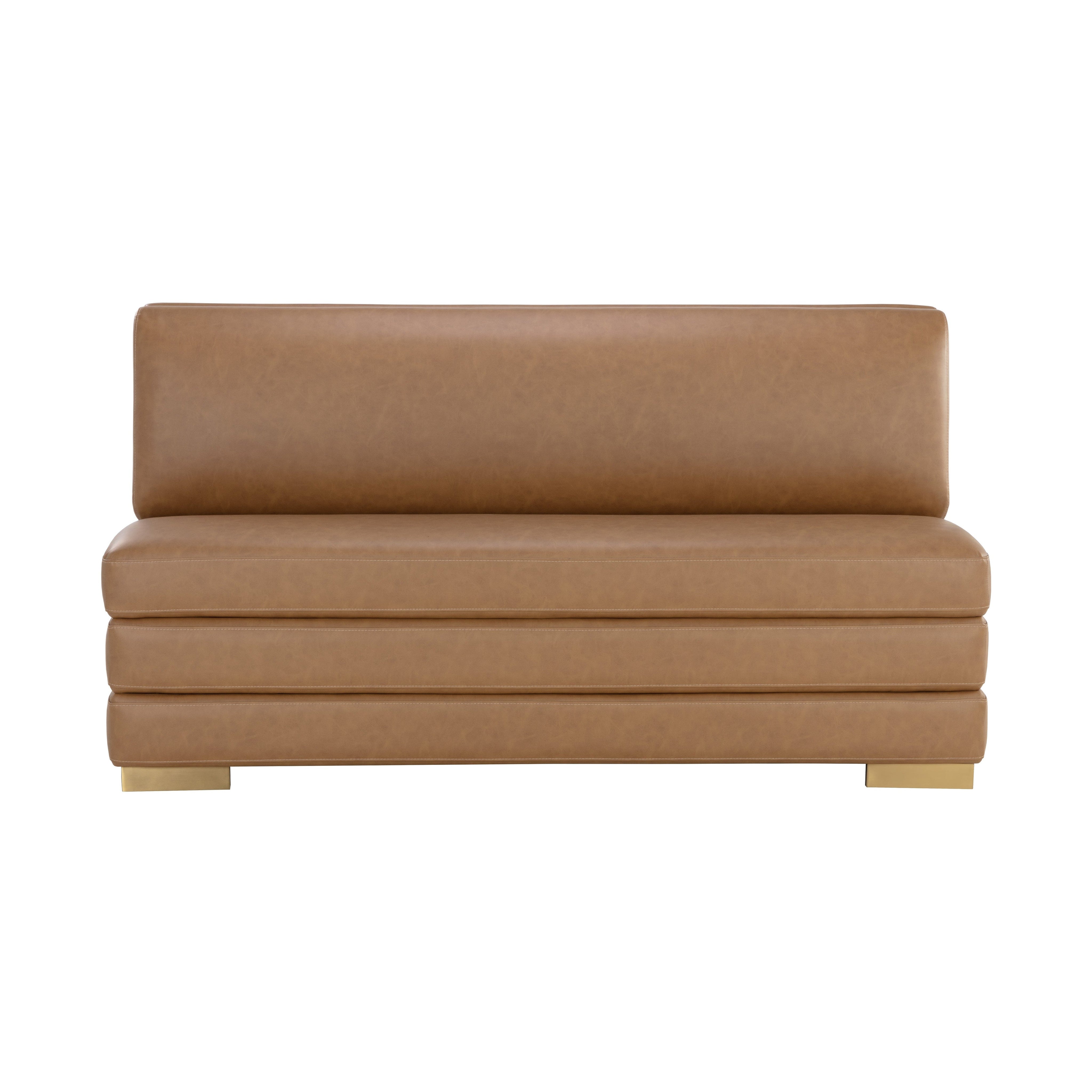The streamlined design of the Radcliff Banquette enhances the elegance and comfort of your favourite nook. Upholstered in milliken cognac faux leather with gold stainless steel legs, it is a combination of durability and style. Handle With Care: This design has been crafted with faux leather. Faux leather is manufactured to reflect the natural characteristics of leather; as such, colour variations, markings, wrinkles, grooves, and light scratches are appreciated characteristics. No two pieces will be alike. Visit our Product Care page for more information on how to ensure the lasting beauty of this piece.