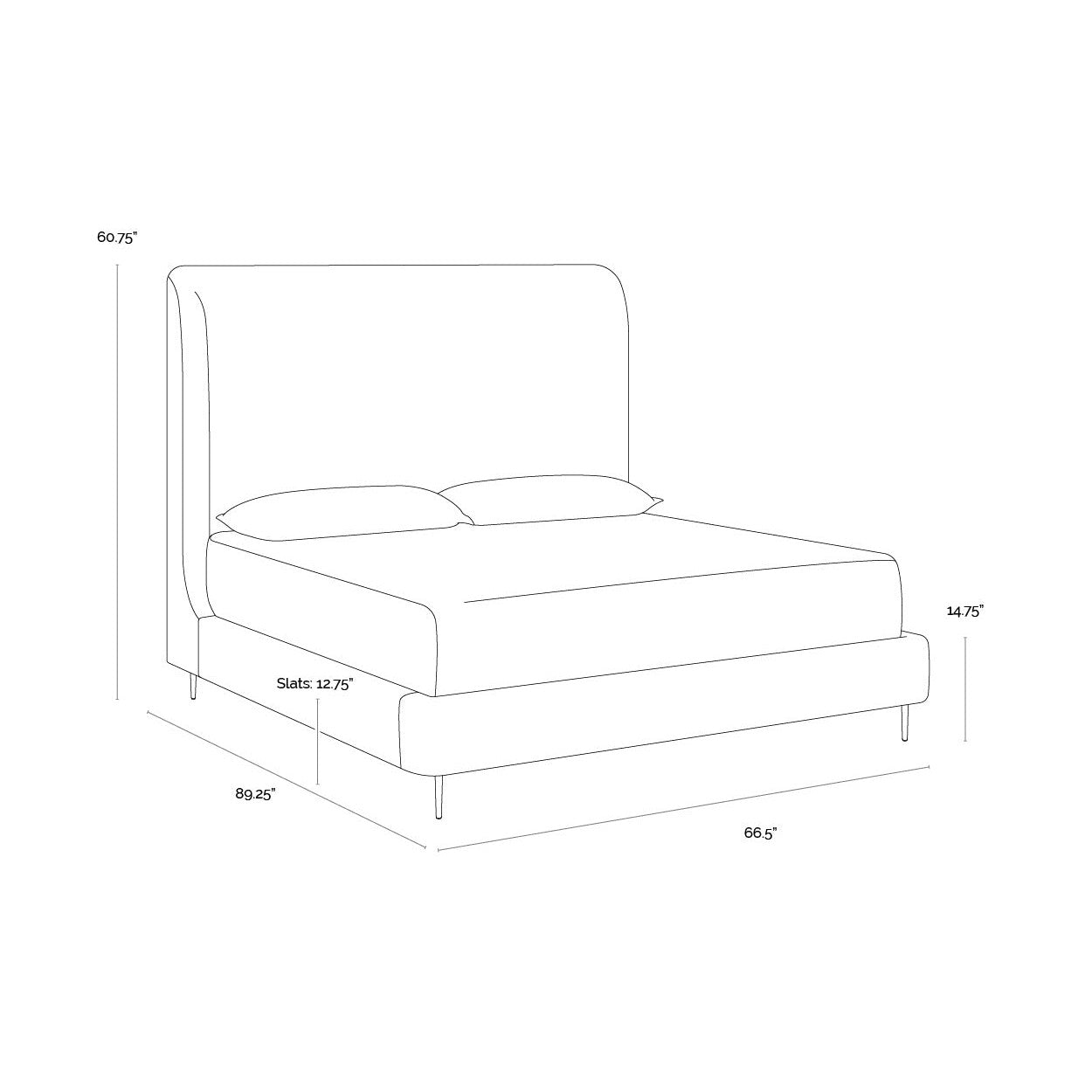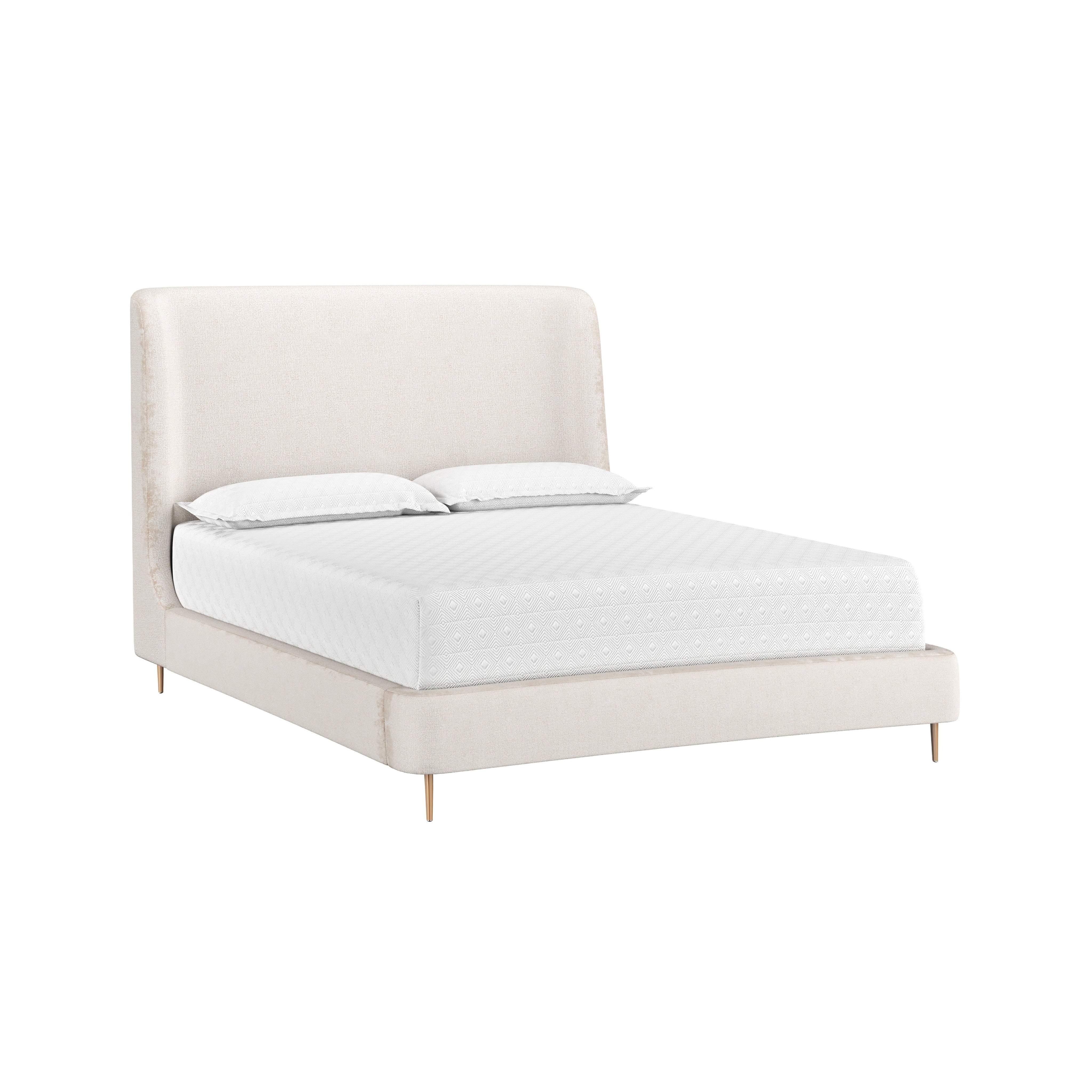 Boasting a stylish design with coastal influence, this beautiful bed exudes lavish comfort. A plush headboard with soft corners add an extra layer of coziness and fluidity. Upholstered in bergen taupe fabric and completed with minted copper steel legs. No box spring is required and slats are included.