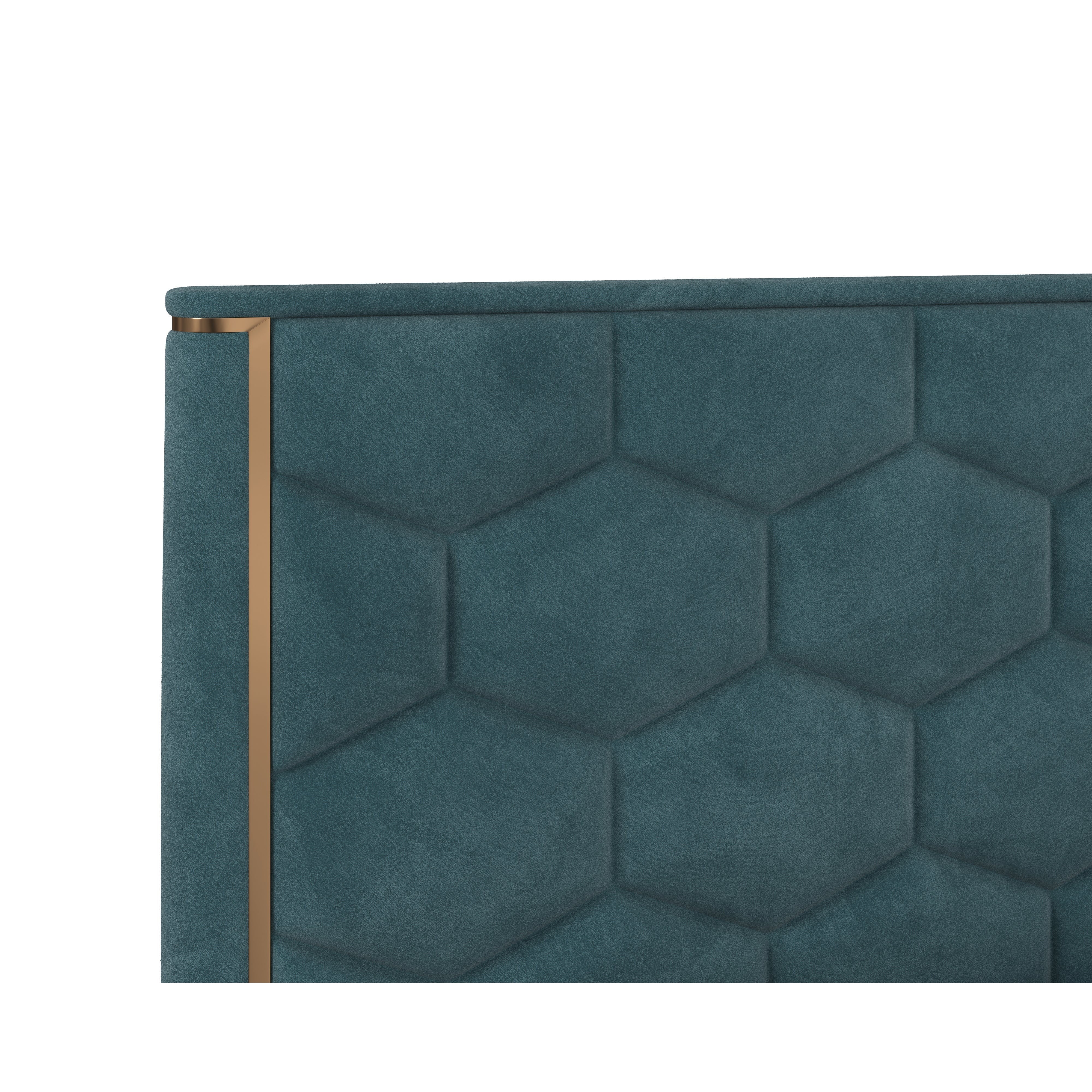 With a classic design that boasts opulence and supreme comfort, this luxurious bed will transform any bedroom space into a dreamy oasis. Upholstered in meg dusty teal fabric and features hexagonal tufting on the headboard. Completed with gold stainless steel accents. No box spring is required and slats are included. Due to the reflective nature of metal, some images on our website may not capture the artisanal characteristics of a product accurately.