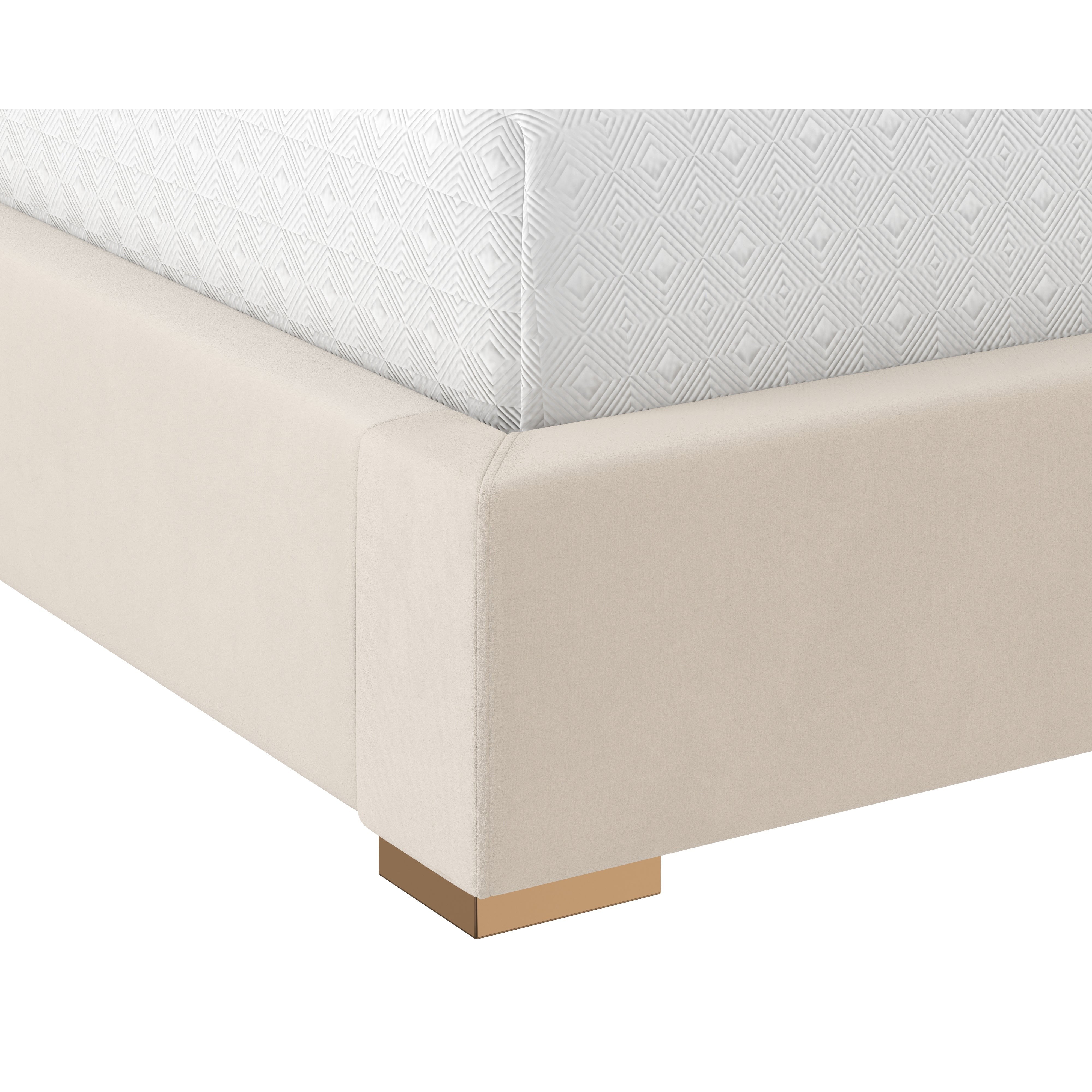 With a classic design that boasts opulence and supreme comfort, this luxurious bed will transform any bedroom space into a dreamy oasis. Upholstered in meg taupe fabric and features hexagonal tufting on the headboard. Completed with gold stainless steel accents. No box spring is required and slats are included. Due to the reflective nature of metal, some images on our website may not capture the artisanal characteristics of a product accurately.