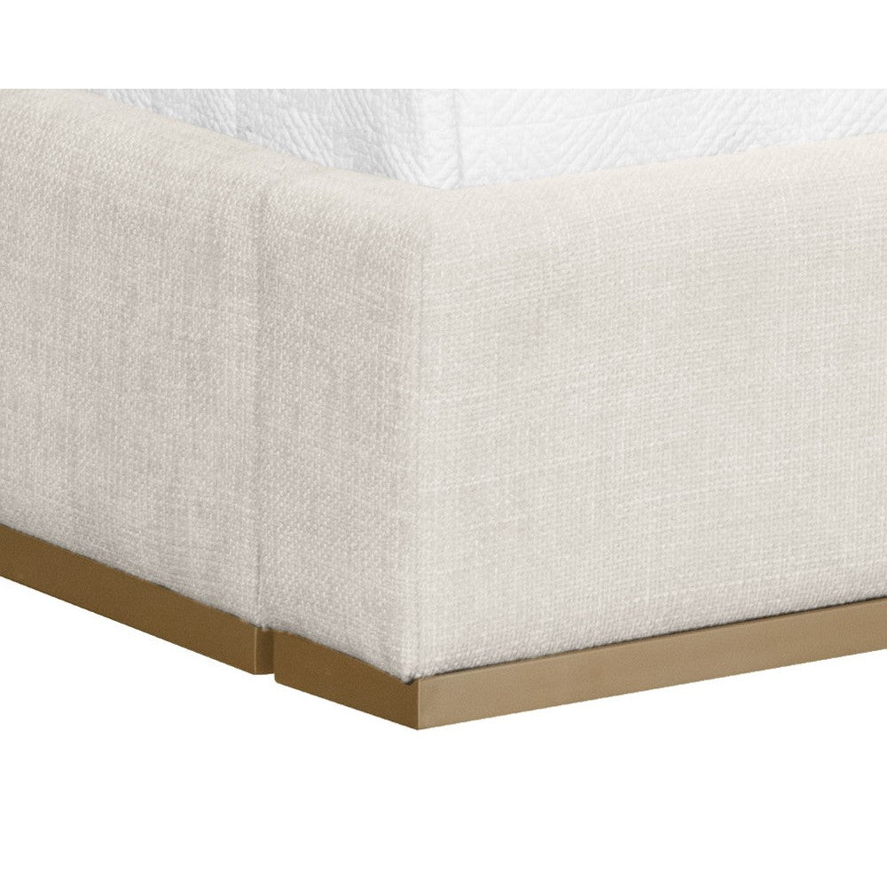 A stylish modern bed that features horizontal and vertical tufting on the headboard. Stocked in chacha cream fabric and complemented with a stainless steel base in an antique brass finish. No box spring is required and slats are included.