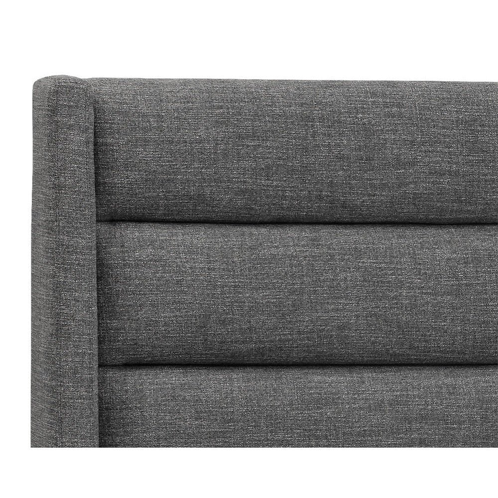 This upholstered bed features horizontal channel tufting for a modern look. Stocked in quarry fabric. No box spring is required and slats are included.