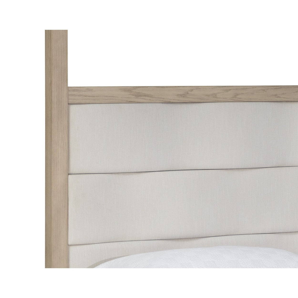 The Hoyos Bed is a study in simplicity. Gentle waves upholstered from topaz beige fabric give added definition to the headboard. Features a canopy frame crafted from poplar wood and oak veneer. No box spring is required and folding slats are included. As wood is an organic, porous material, these pieces will contain natural variation of texture and may also exhibit fine indentations and cracks. Wood pieces will also display a disparity of colour and grain, and visible knots and burls that add to the character of each piece.
