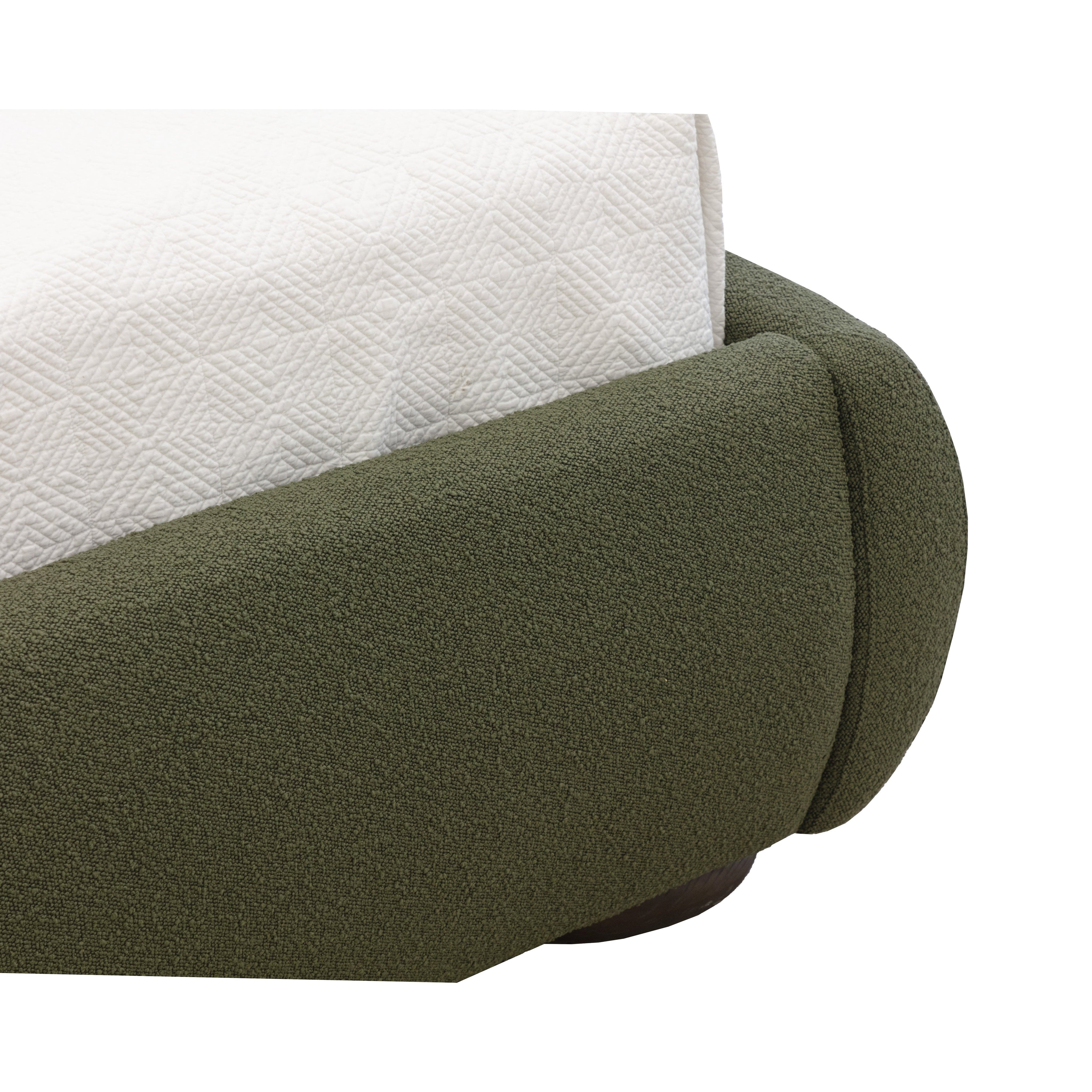 A visual embodiment of softness, the Marin Bed brings mesmerizing curves to the bedroom. Smooth to the touch with a well-padded headboard, this alluring bed is upholstered in textured copenhagen olive fabric with a low profile elevated on round solid oak wood legs.