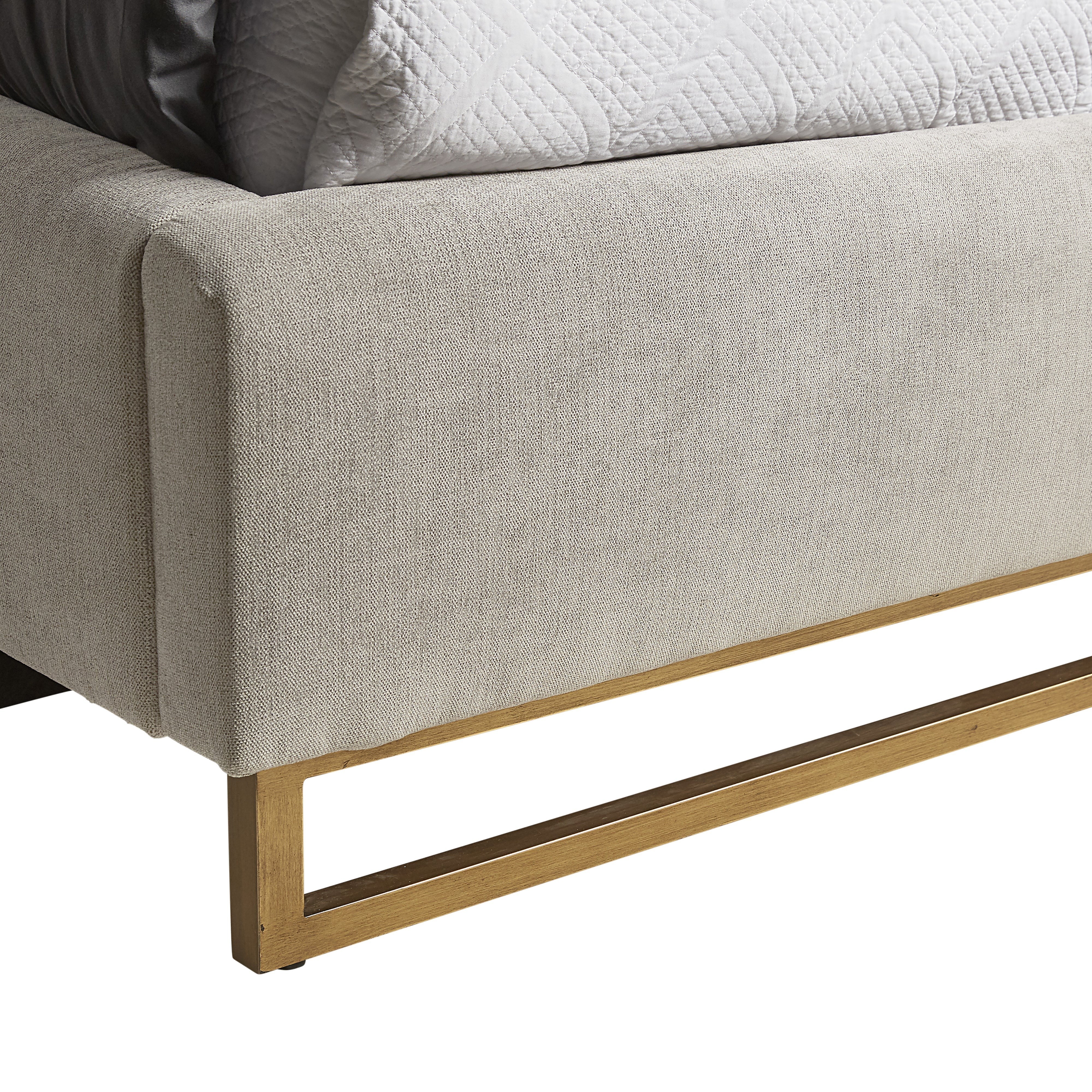 A modern platform bed that offers style and comfort. Features delicate ruching on the rounded headboard and exposed antique brass legs. Stocked in polo club stone performance fabric. Performance fabric is moisture repellent, durable and easy to clean. No box spring is required and folding slats are included.