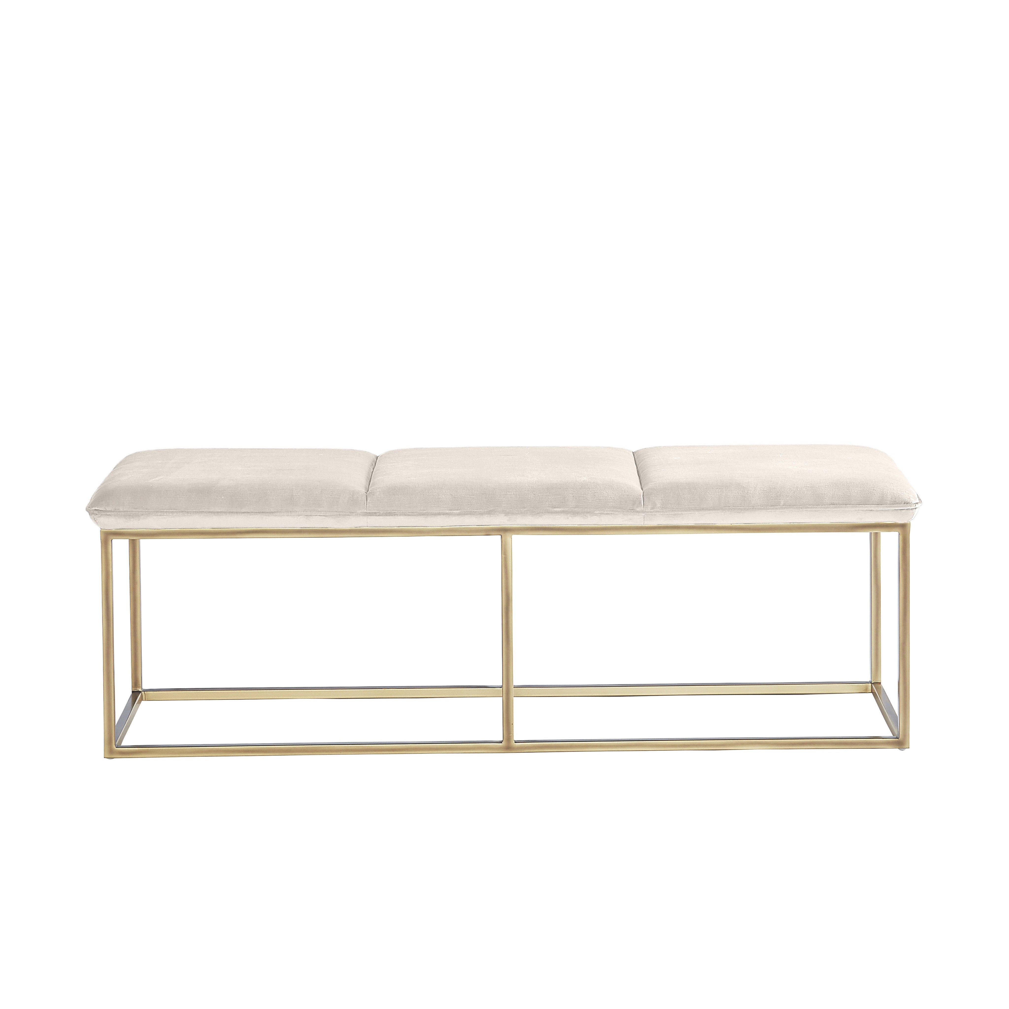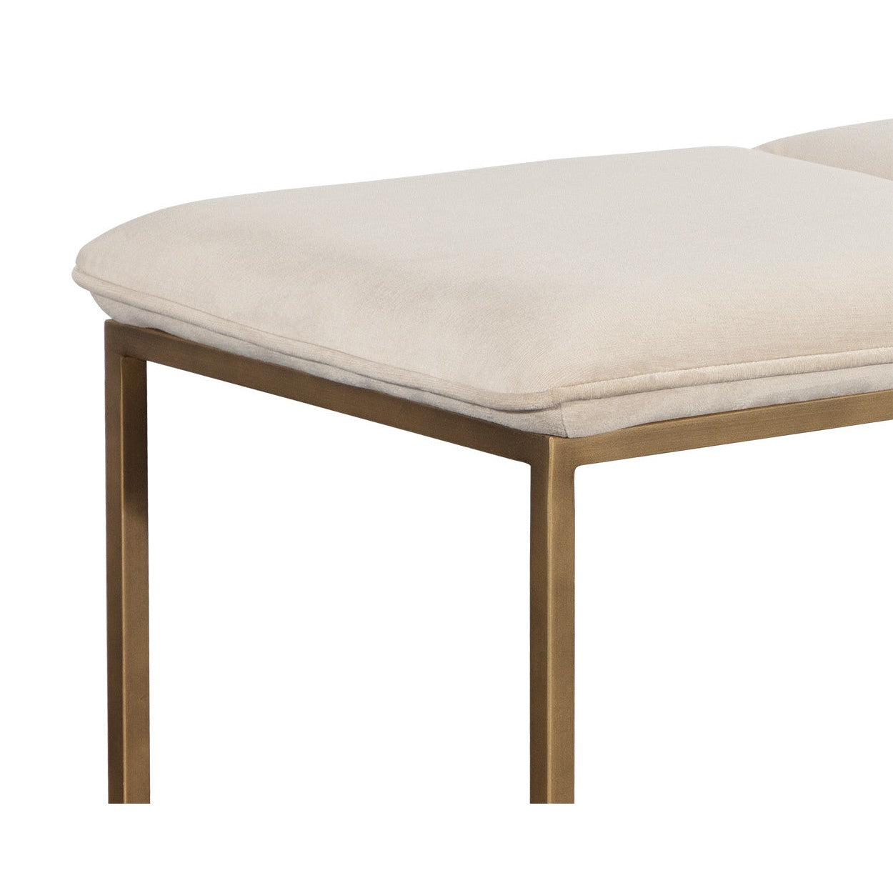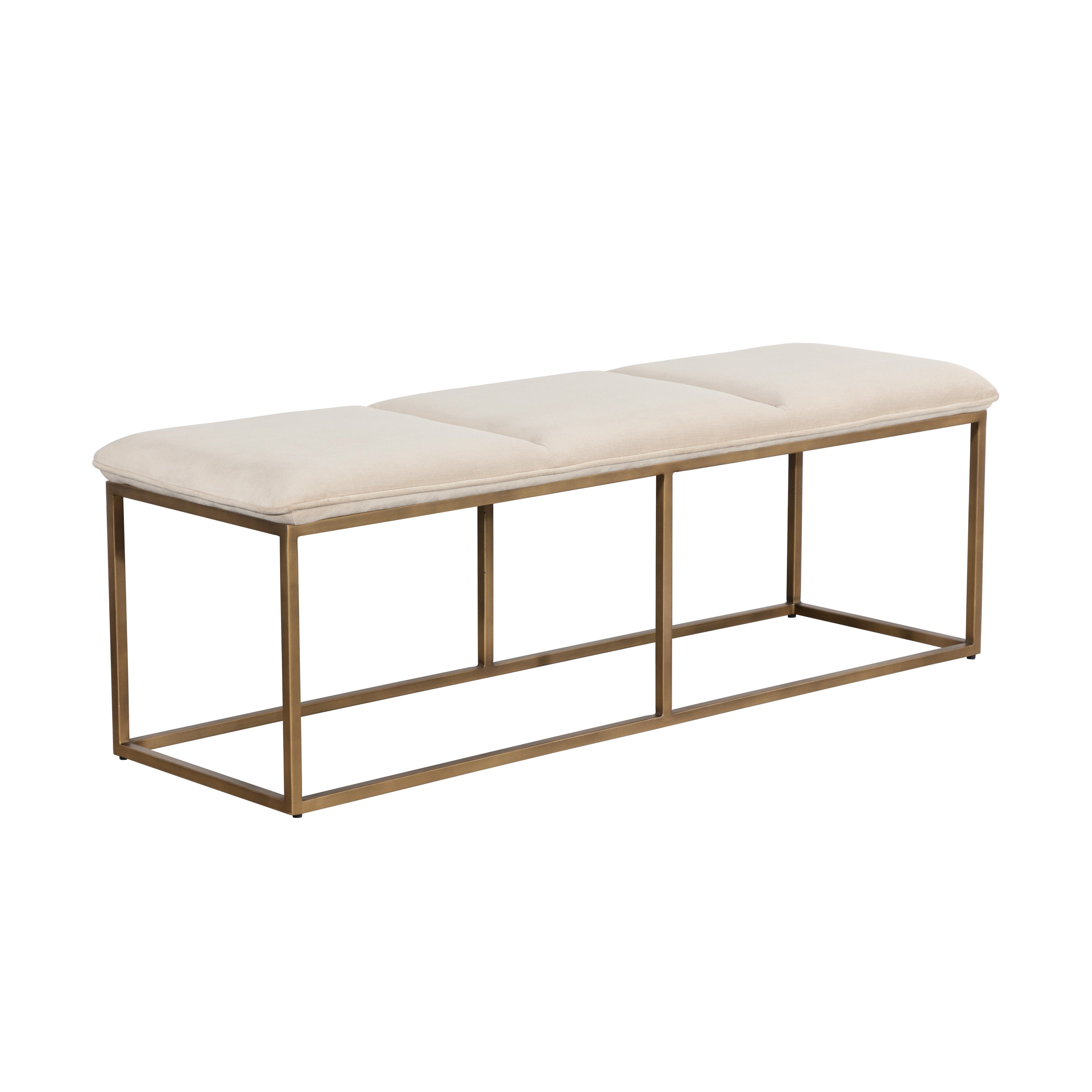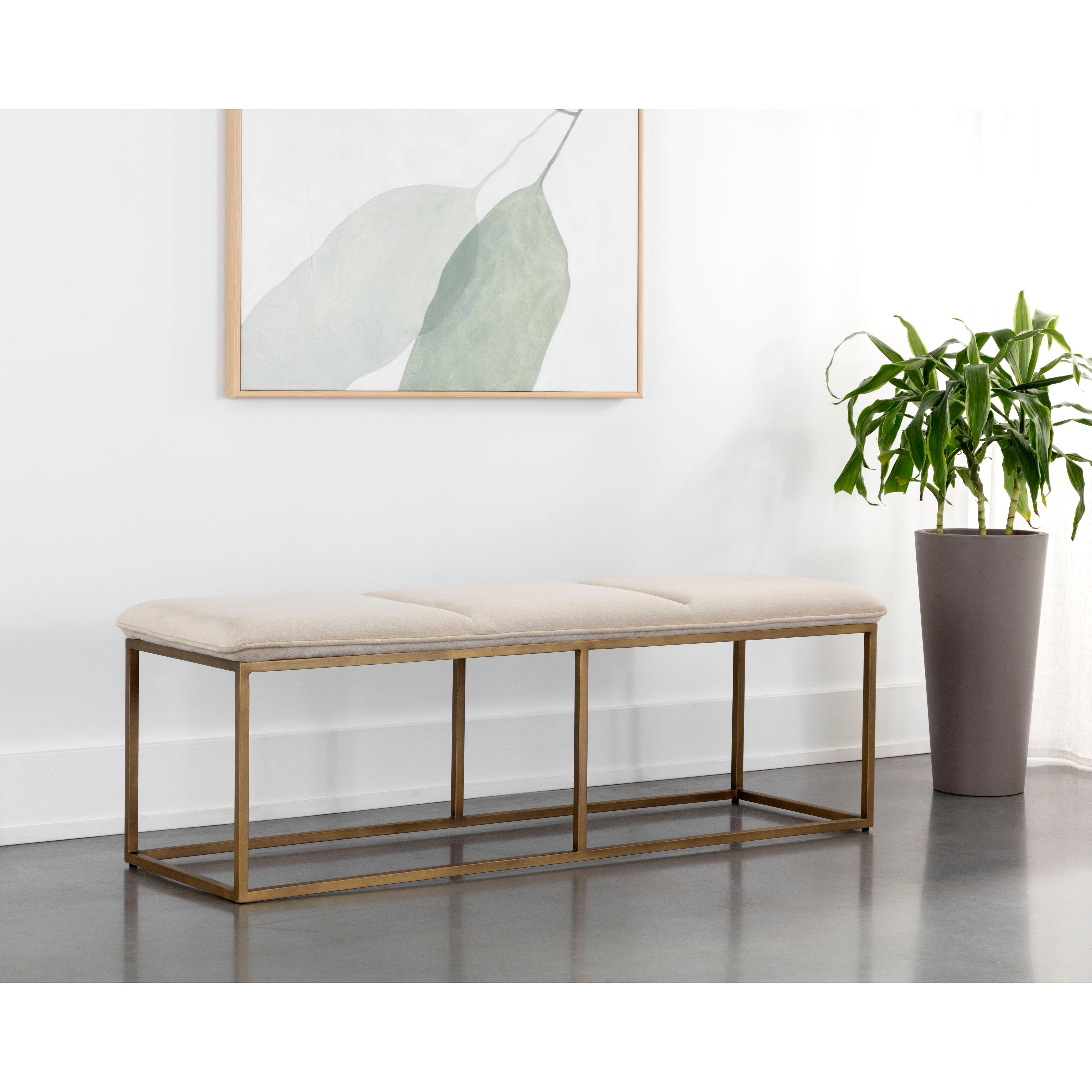 This bench combines transitional style with luxurious elements. Features an exposed rustic bronze steel frame and a piccolo prosecco performance fabric seat. Performance fabric is moisture repellent, durable and easy to clean.