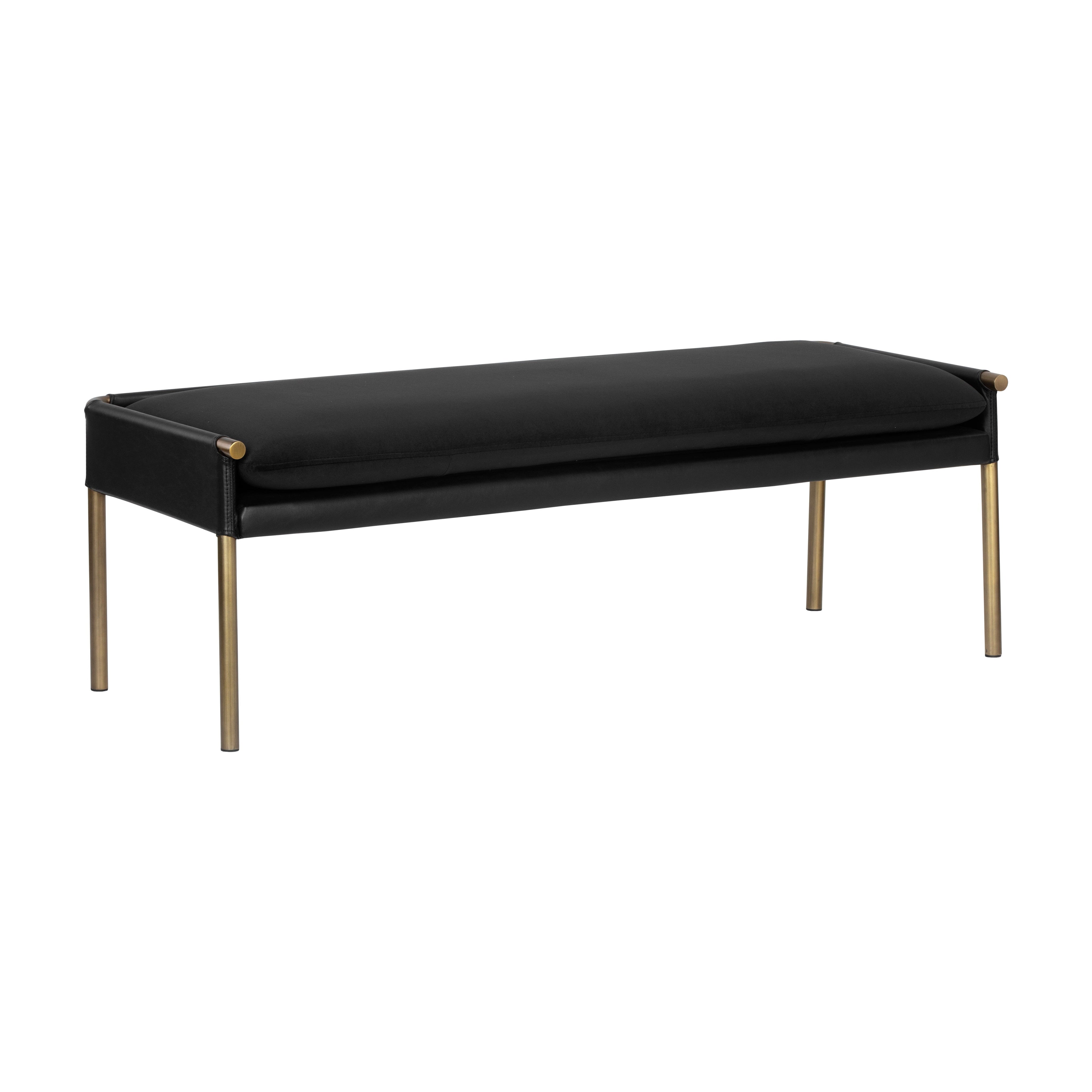 A beautiful upholstered bench crafted with an intriguing mixture of textures and materials. Features an abbington black fabric seat with a contrasting bravo black faux leather and antique brass frame.