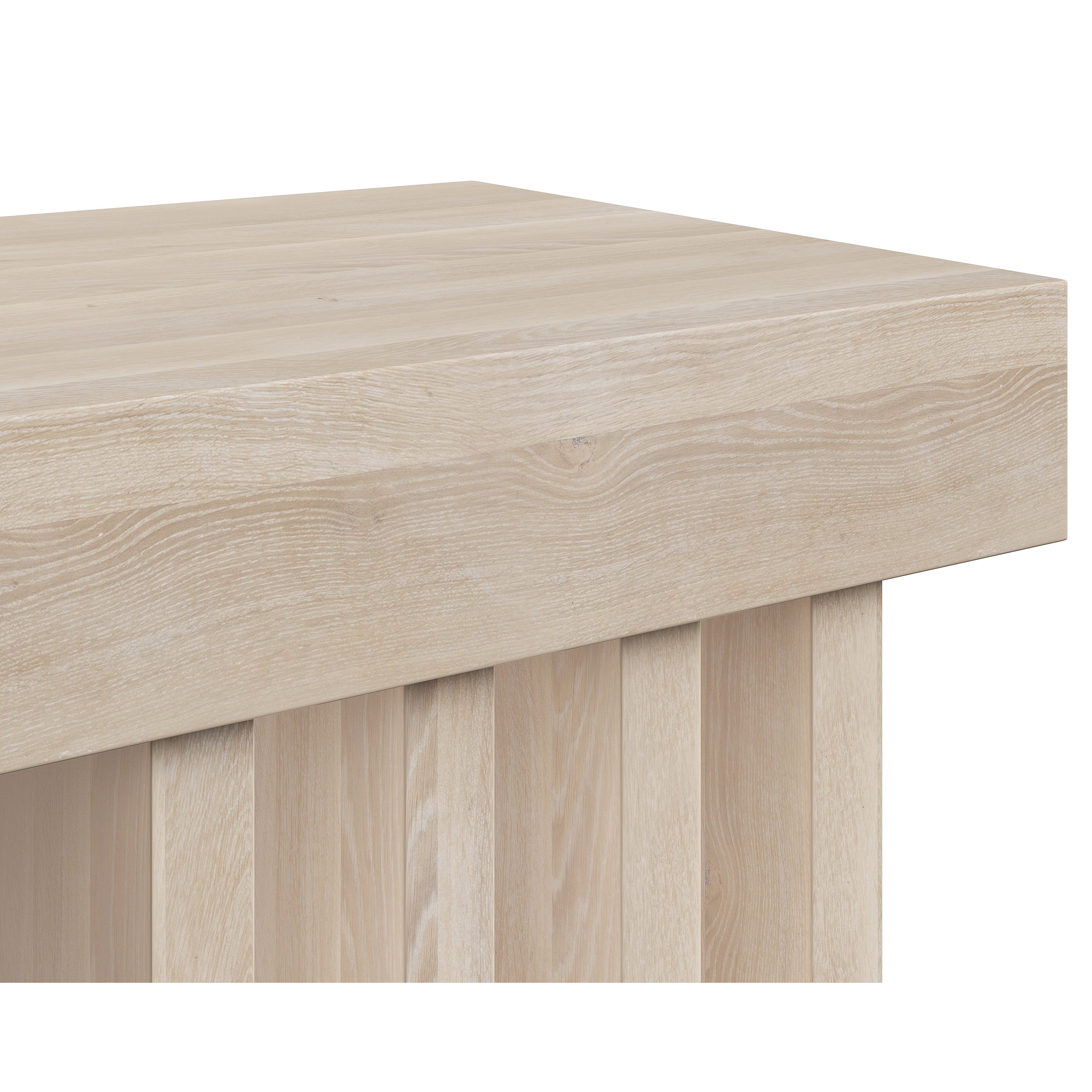 Boasting a bold, contemporary design, this unique bench features a captivating geometric base. Crafted from solid light oak wood with a whitewash finish. As wood is an organic, porous material, these pieces will contain natural variation of texture and may also exhibit fine indentations and cracks. Wood pieces will also display a disparity of colour and grain, and visible knots and burls that add to the character of each piece. Made in India. With refined craftsmanship, this design was brought to life by skilled local artisans. Due to the nature of handcraftsmanship, unique imperfections such as fissures, markings and variations in colour and shape are welcomed and appreciated characteristics for a truly one-of-a-kind piece.