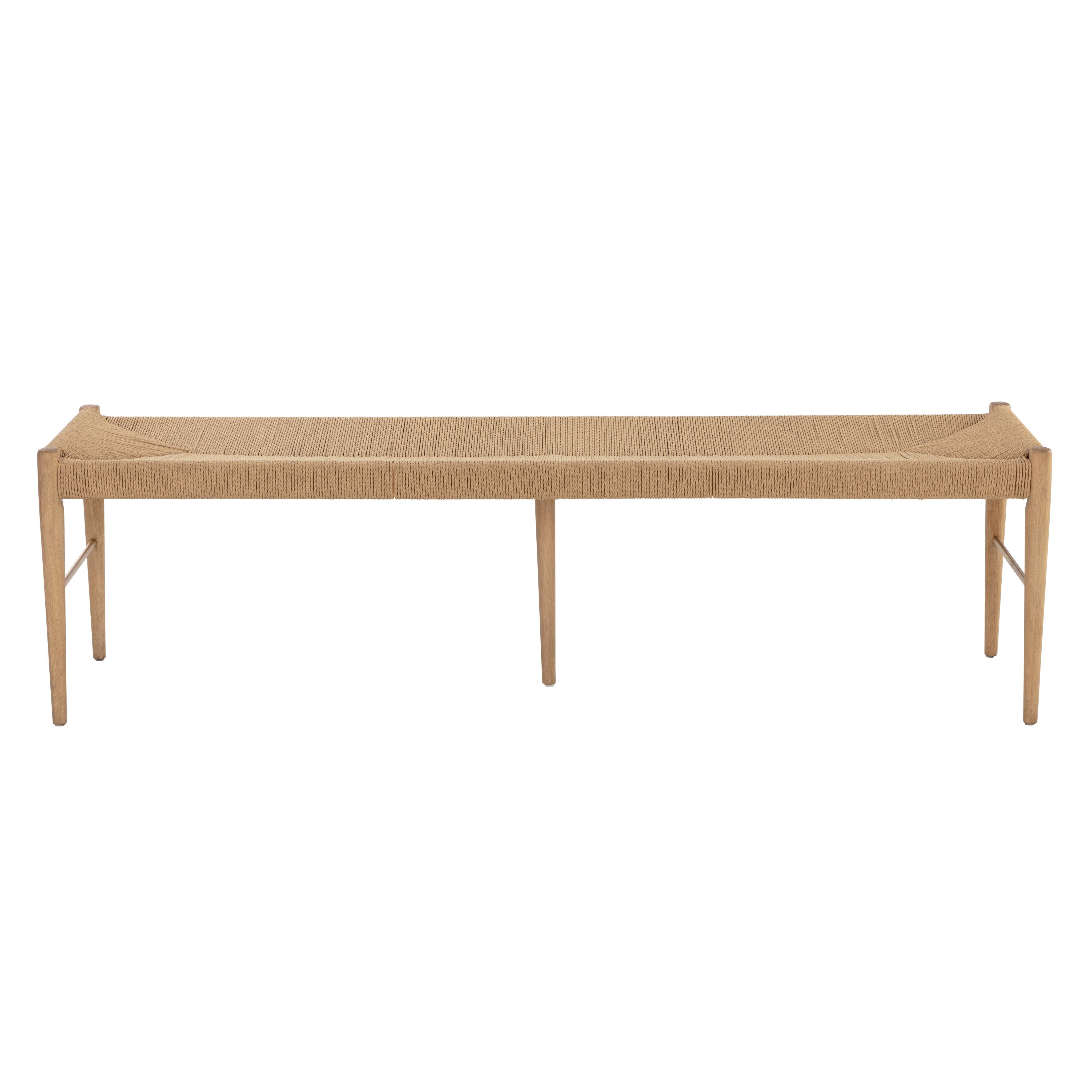 The Moira bench brings together a sleek modern silhouette with a coastal look. Features sturdy seating made from natural paper rope and a white wash oak frame. Brass painted stretcher bars complete the design. As wood is an organic, porous material, these pieces will contain natural variation of texture and may also exhibit fine indentations and cracks. Wood pieces will also display a disparity of colour and grain, and visible knots and burls that add to the character of each piece. Due to the natural contents of natural paper rope, it is advised to minimize contact with strongly dyed fabrics to avoid discolouration and/or colour transfer.