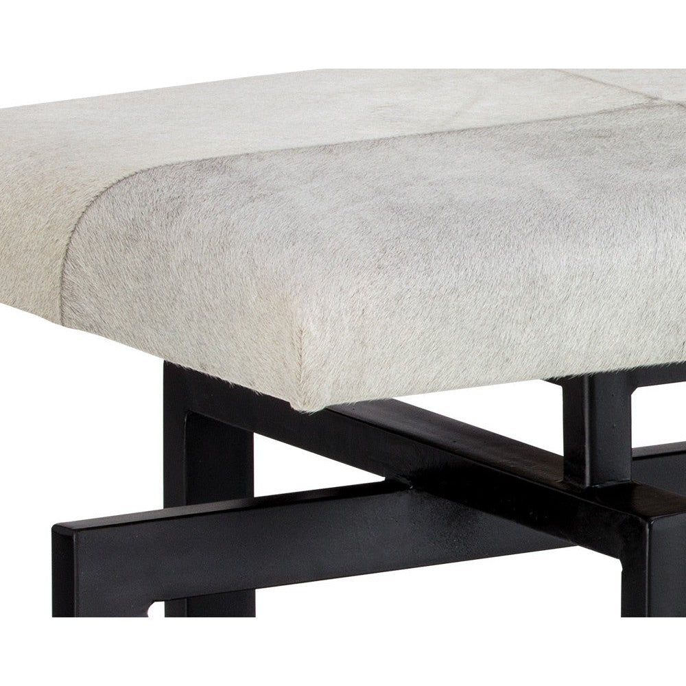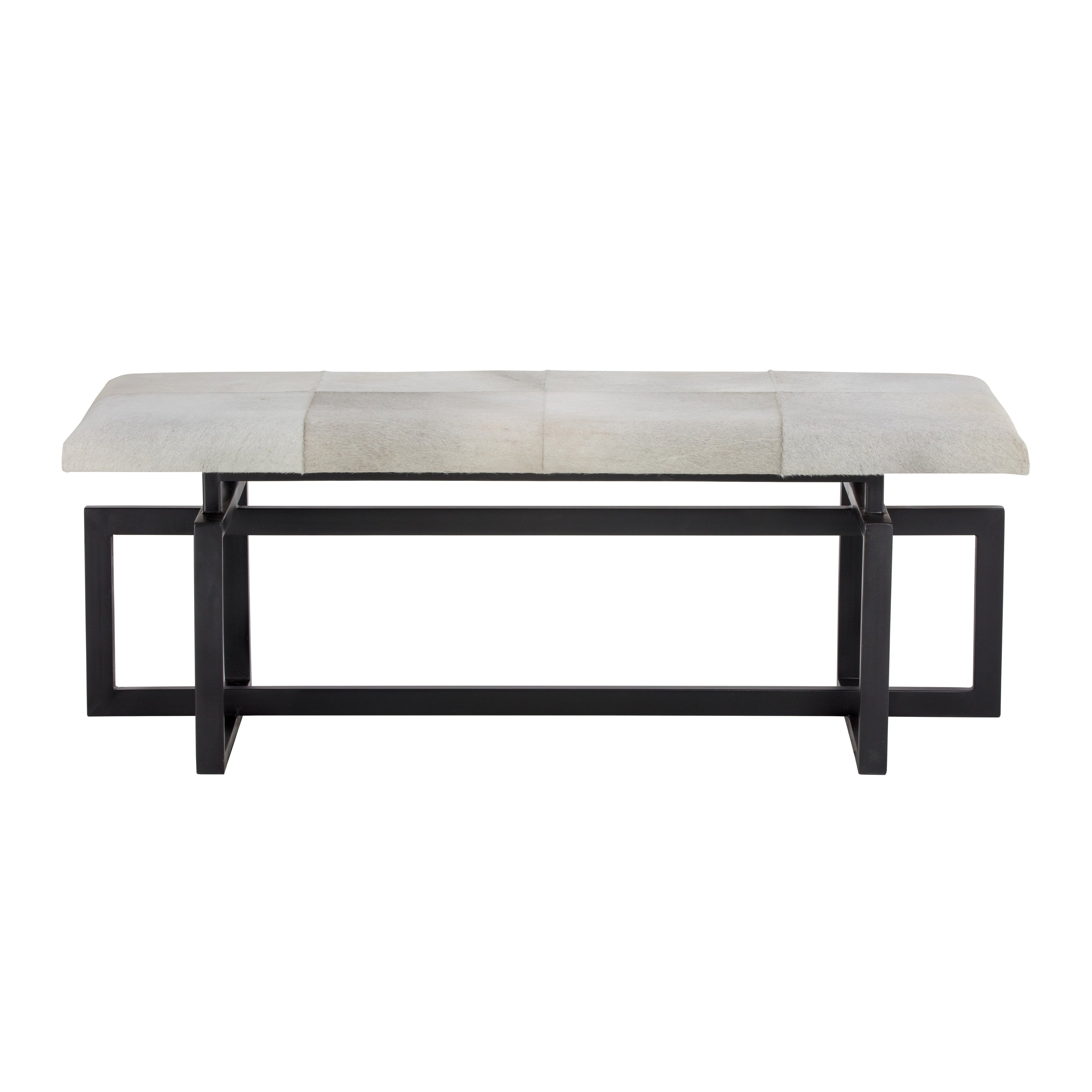 This stunning bench will bring style and comfort to transitional spaces. Features a hand-stitched genuine white cowhide seat with a sleek black iron frame. As cowhide is a natural material, organic markings on the animal may still be visible and there may be apparent differences in hair length, colour, and pattern. No two pieces are alike and images on site may not capture these qualities precisely. Made in India. With refined craftsmanship, this design was brought to life by skilled local artisans. By nature, these materials develop unique imperfections such as fissures, markings and colour variations for a truly one-of-a-kind piece.