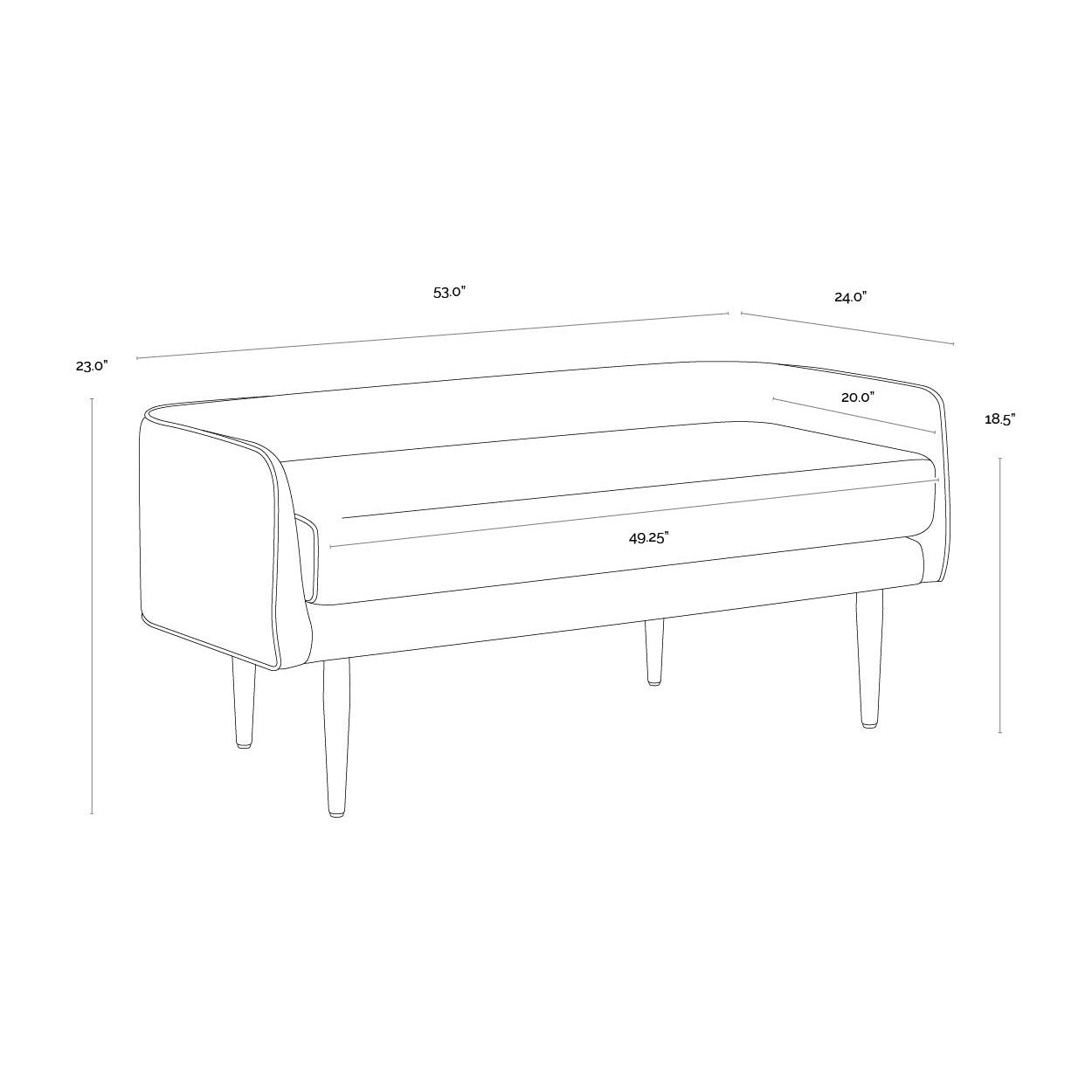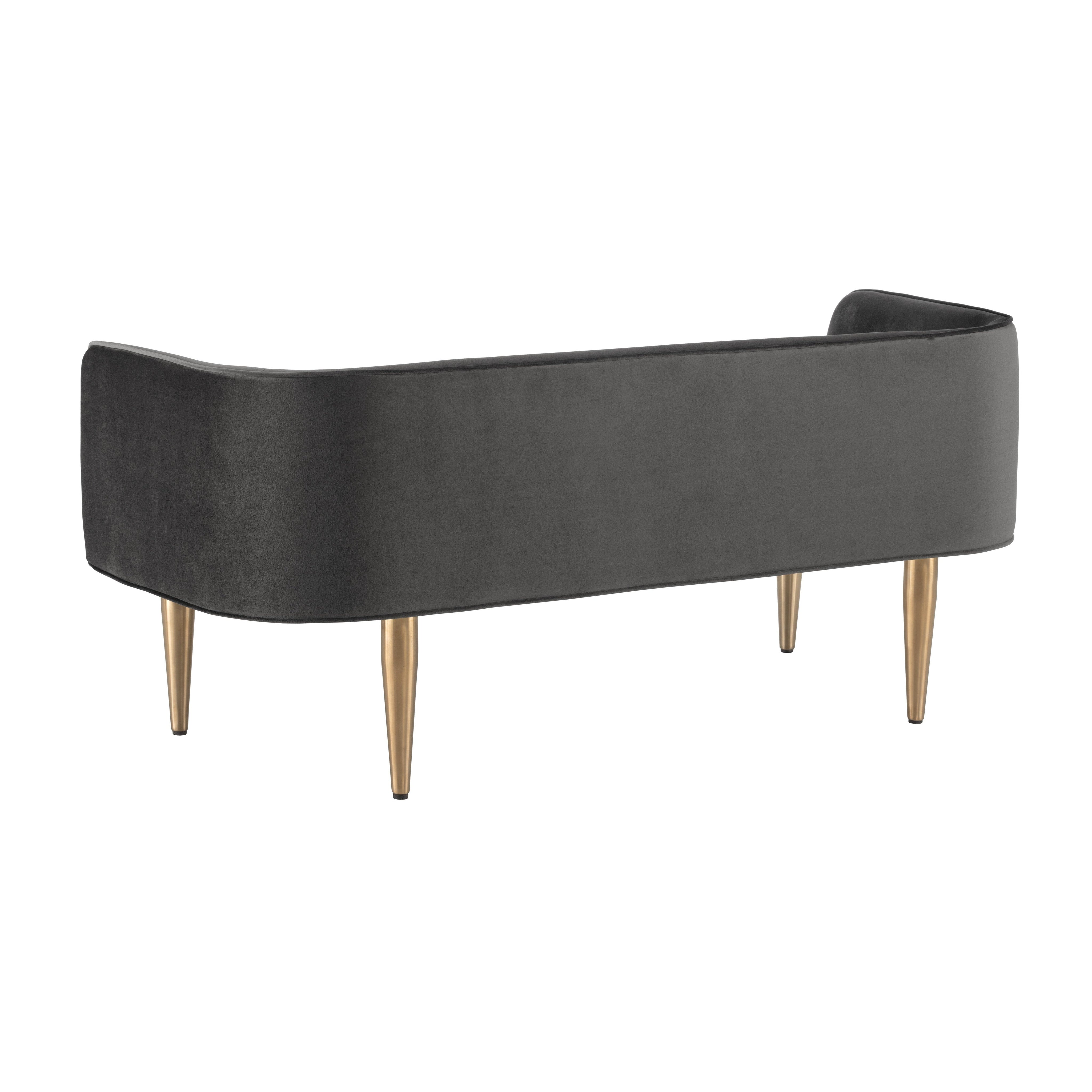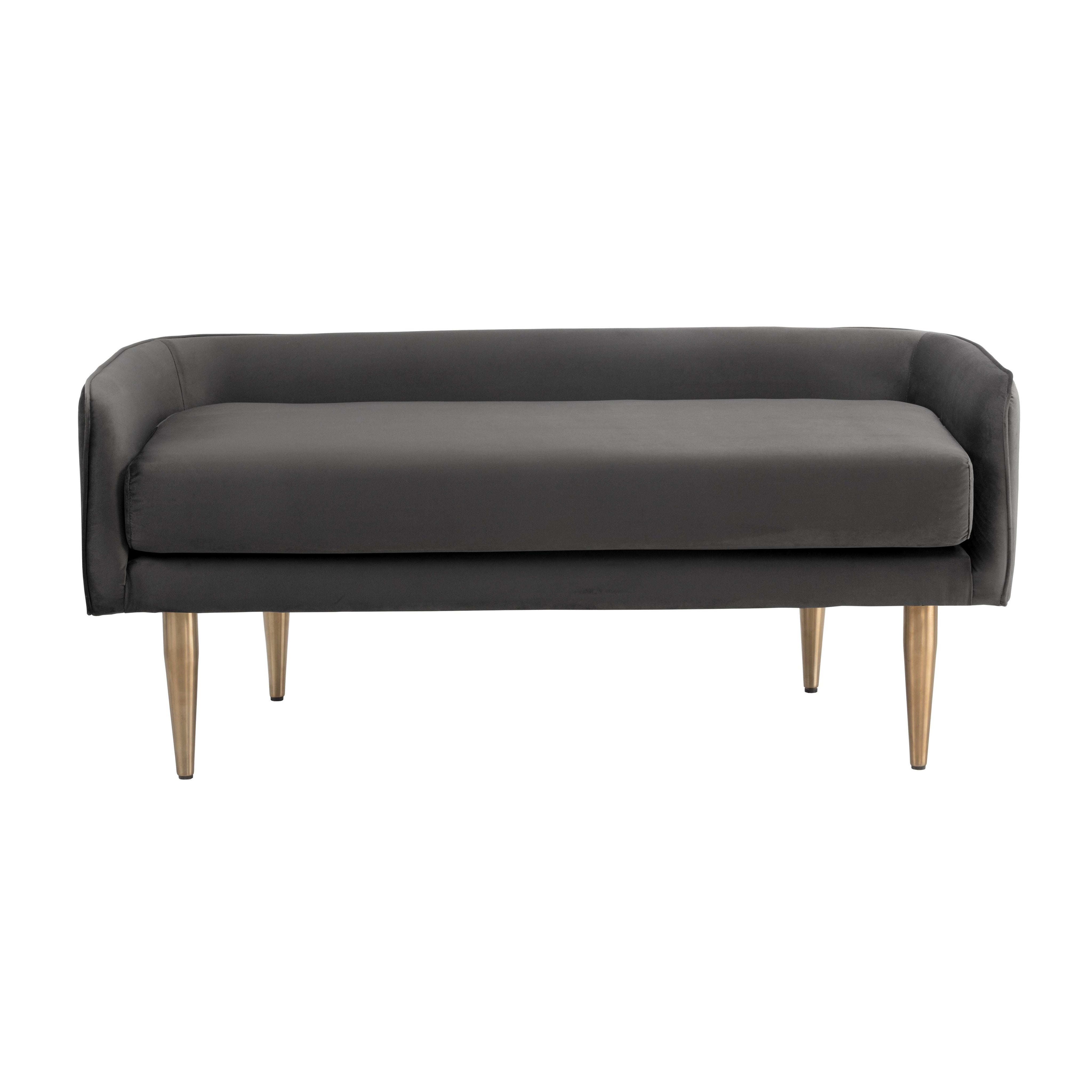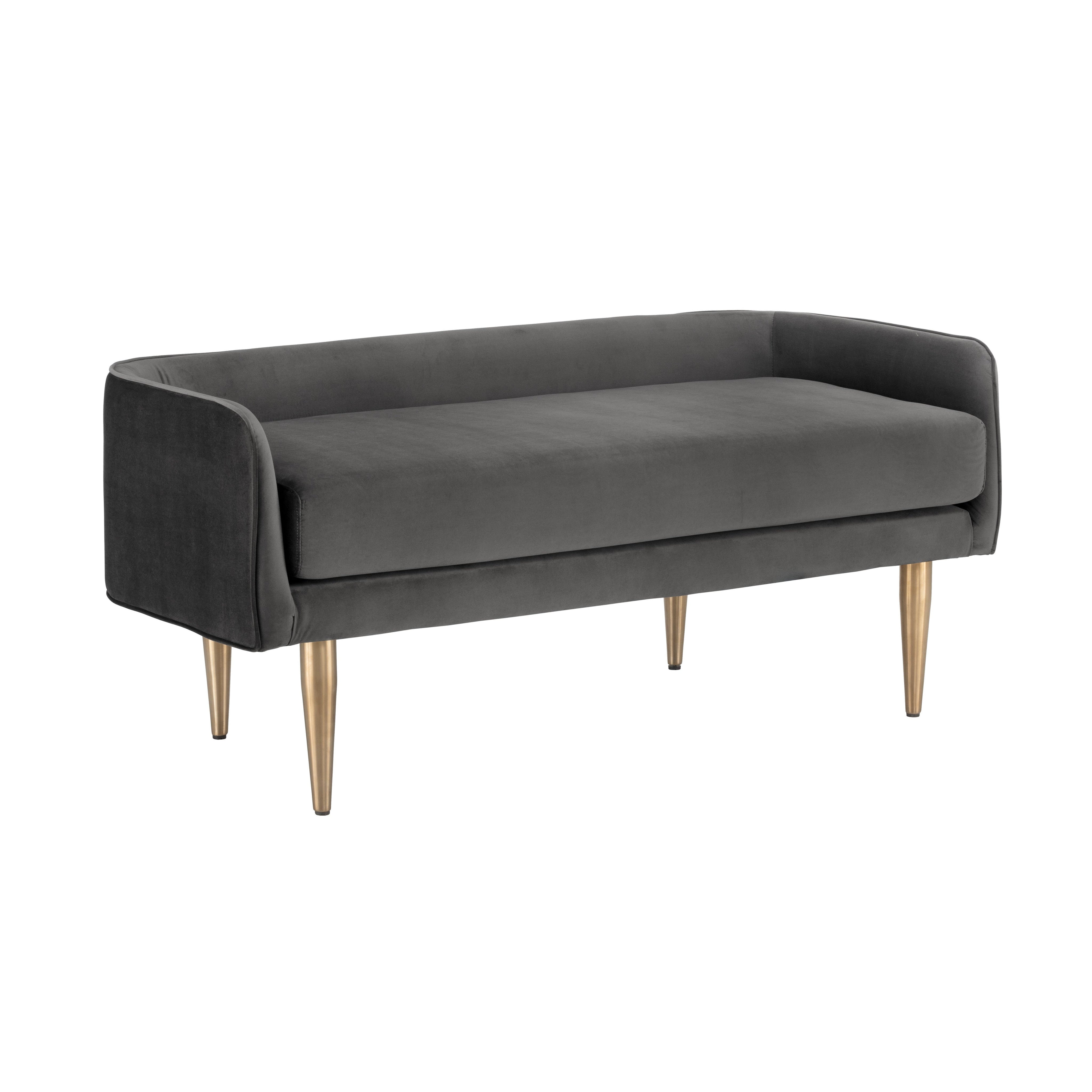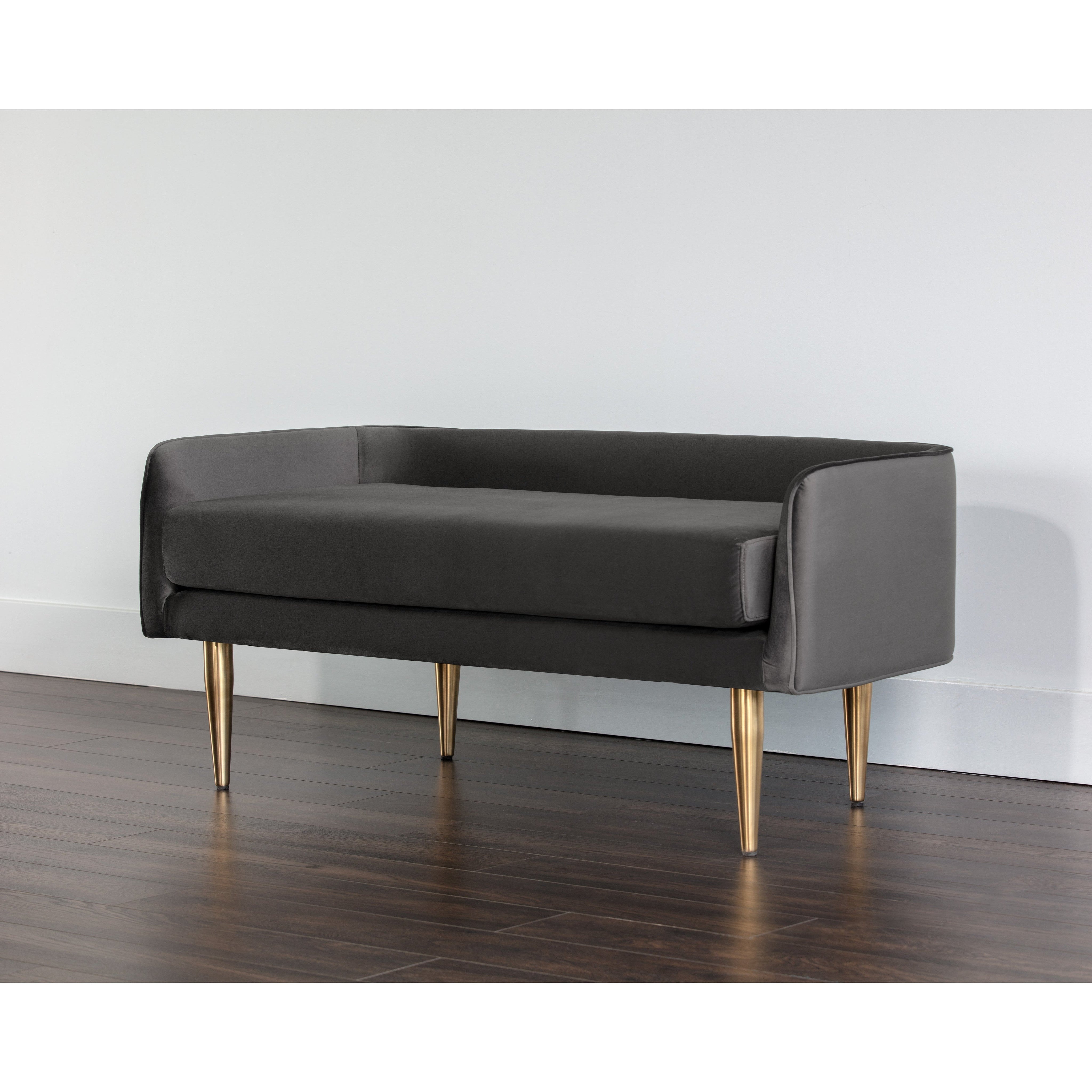 A delicately designed bench suitable for placement in a lobby or lounge, at the foot of a bed, or in an customized dressing room.