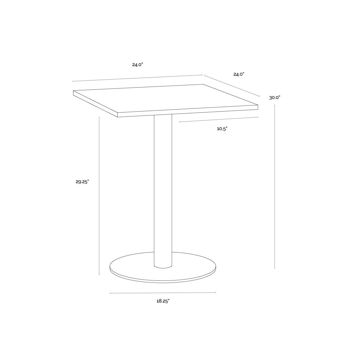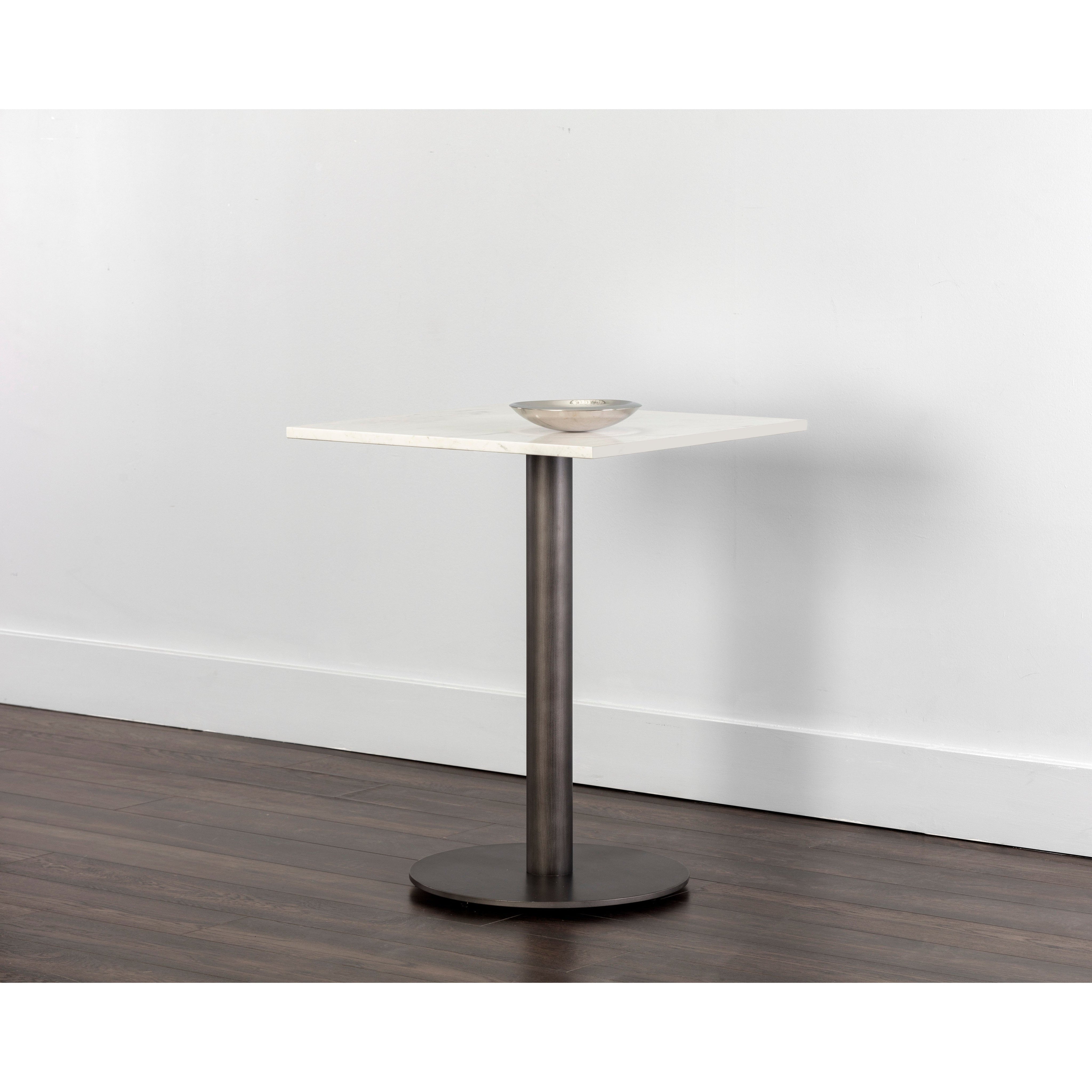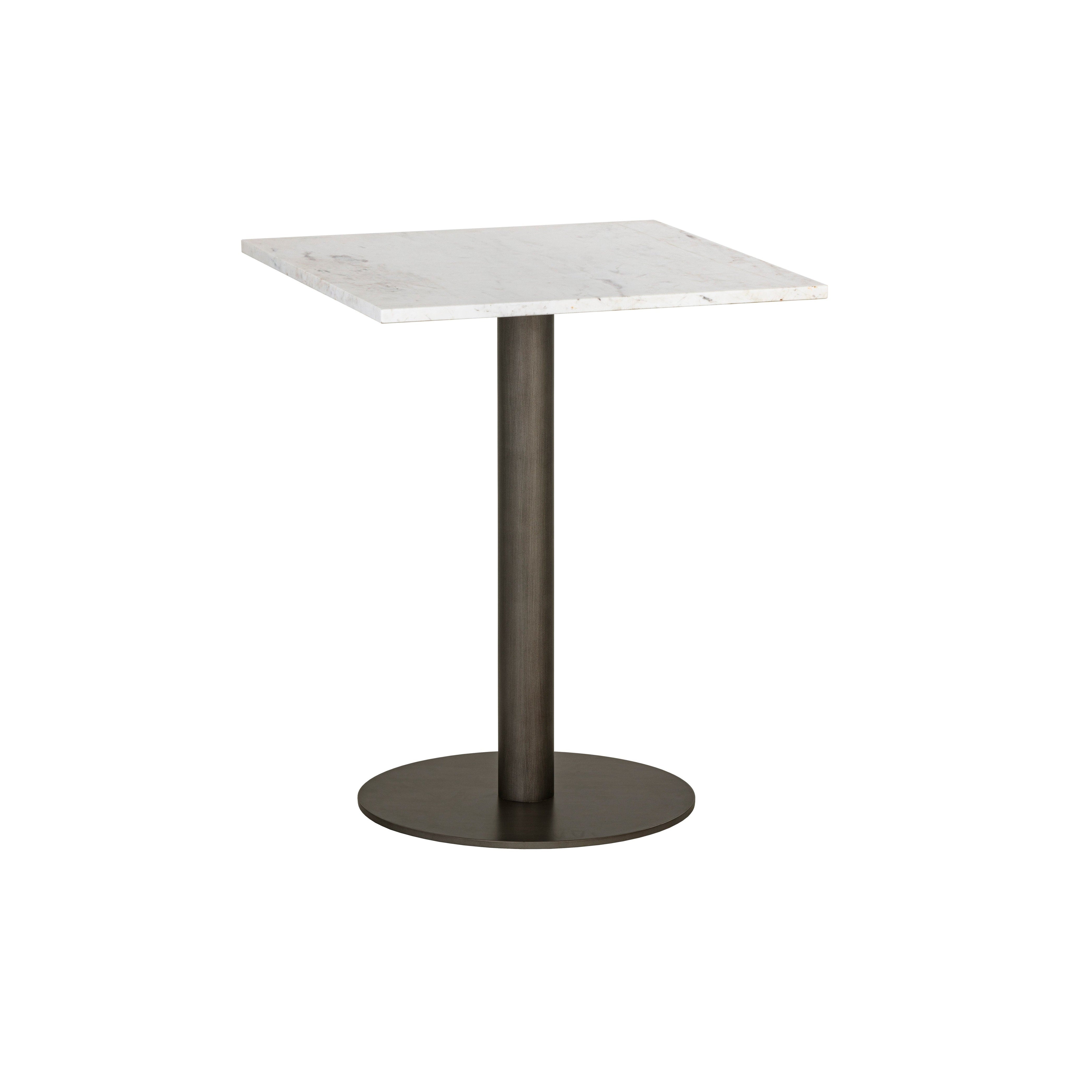 An Art Deco inspired 24" square bistro table featuring a white marble top with a pewter finished steel base. Perfect for restaurants and smaller dining spaces. As marble is a natural material, unique veining, pitting, fissures, micro-cracks and colour variations are all characteristics that add to the uniqueness and beauty of each piece.