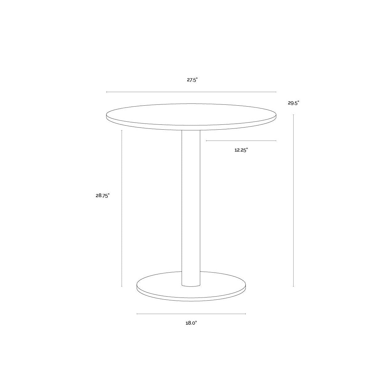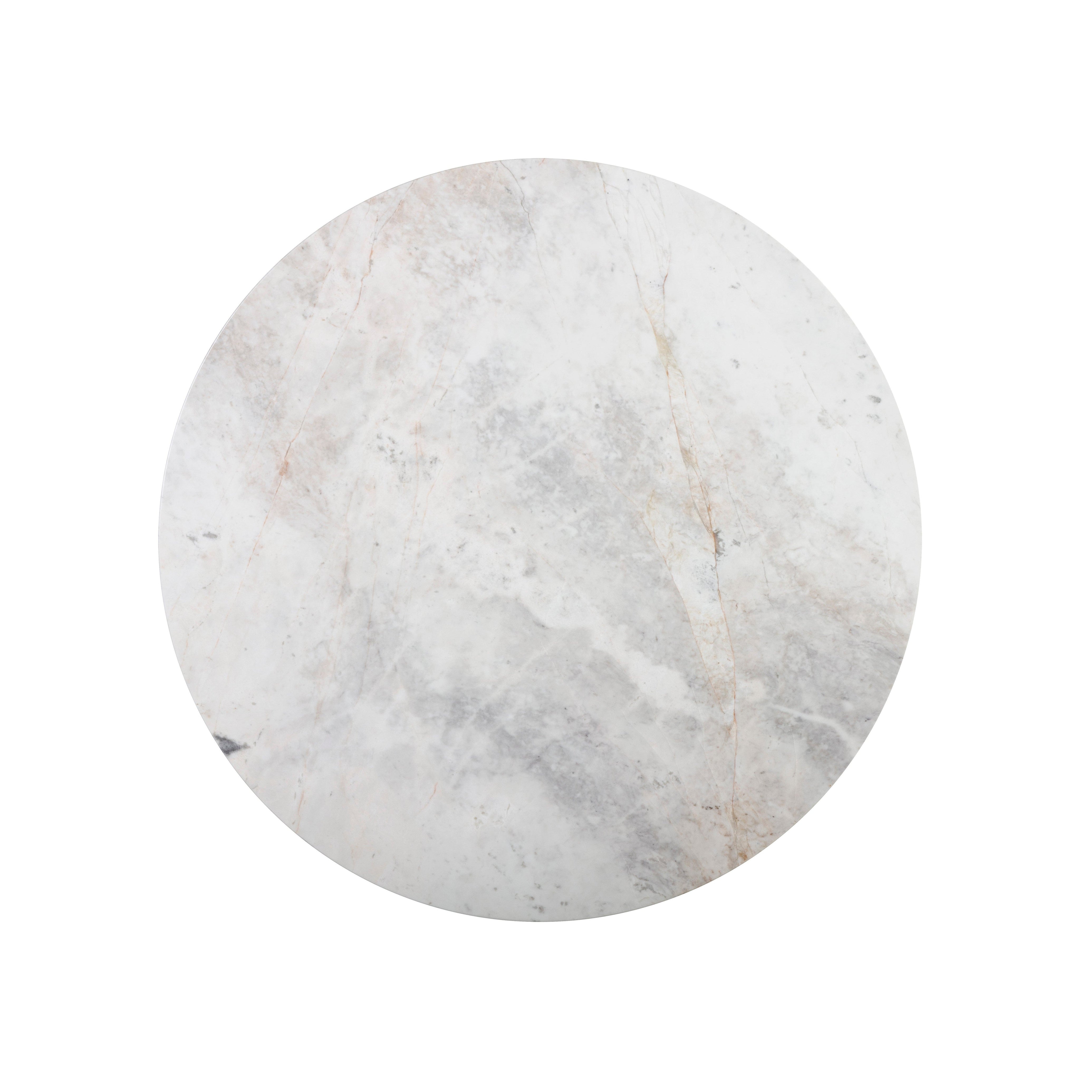 An Art Deco inspired 27.5" round bistro table featuring a white marble top with a pewter finished steel base. Perfect for restaurants and smaller dining spaces. As marble is a natural material, unique veining, pitting, fissures, micro-cracks and colour variations are all characteristics that add to the uniqueness and beauty of each piece.