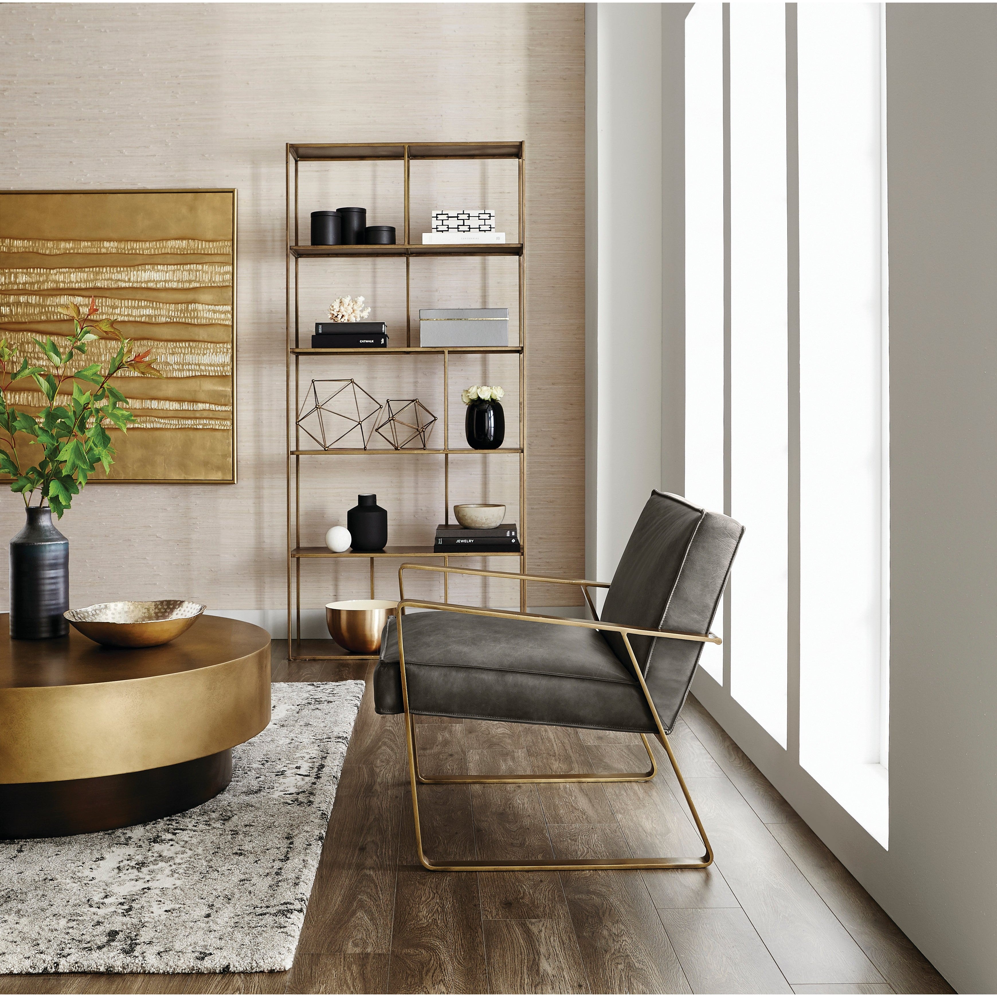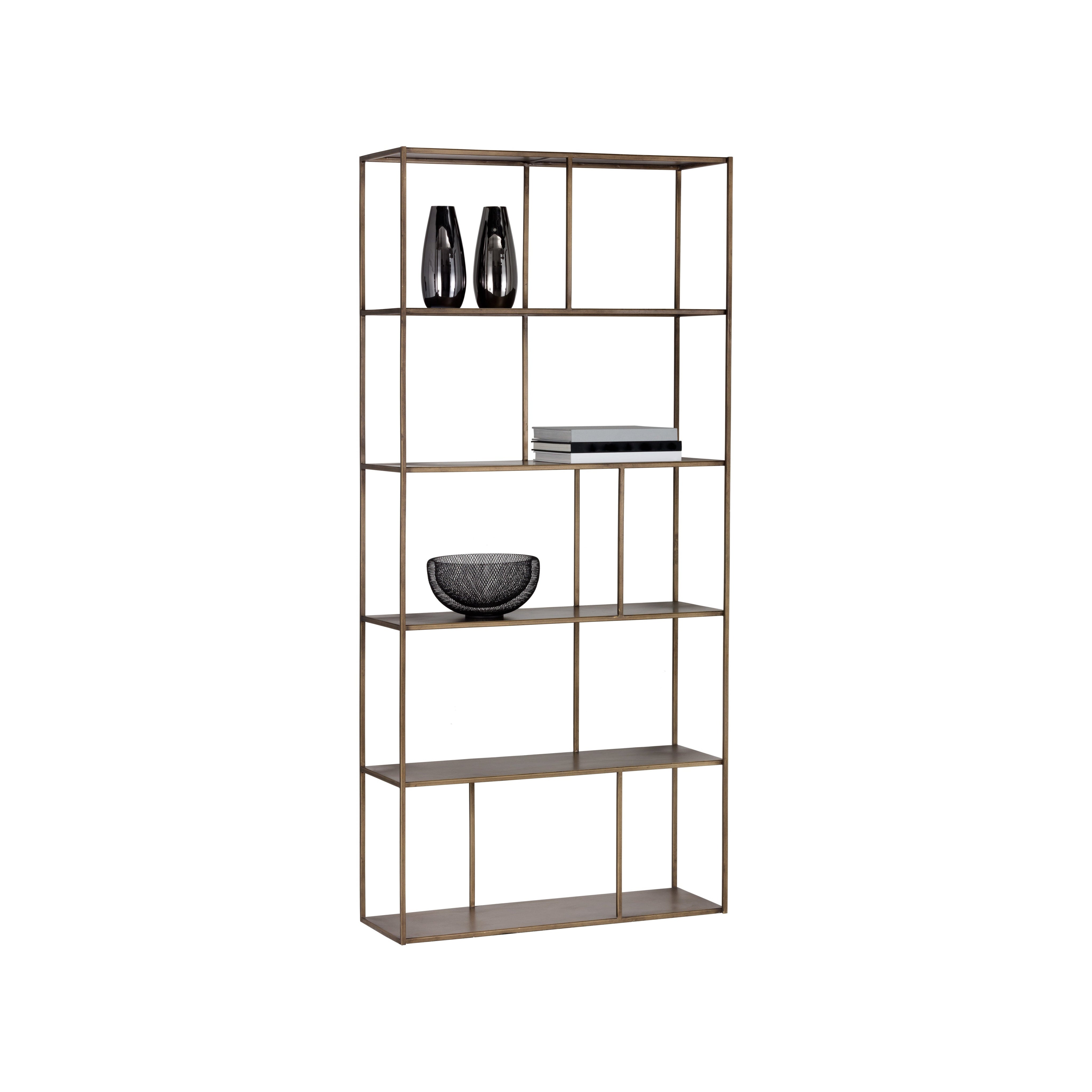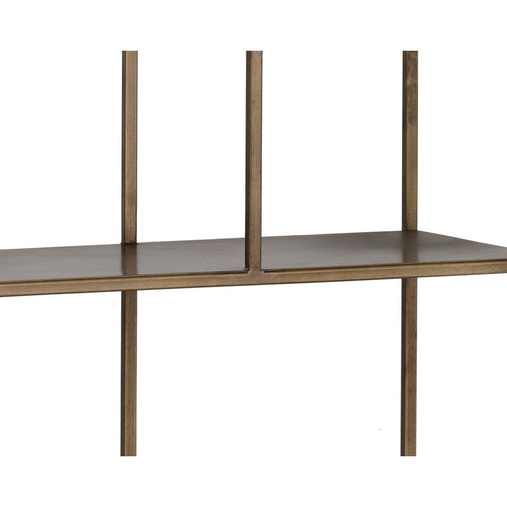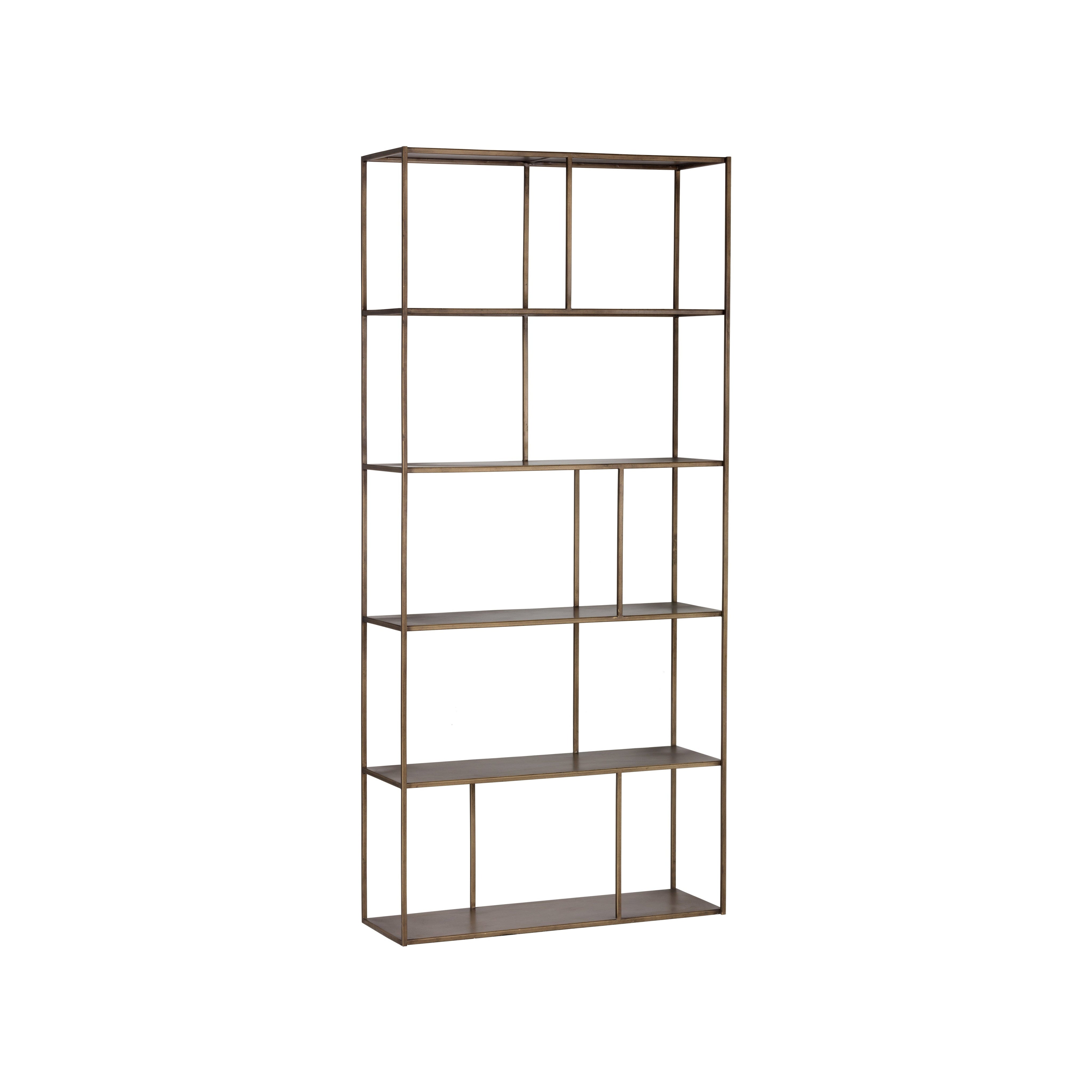 Add style and warmth to living and office spaces with this well-designed iron bookcase in a brushed antique brass finish. Can be placed in pairs or multiples for added impact and functionality. Anti-tipping kit included.