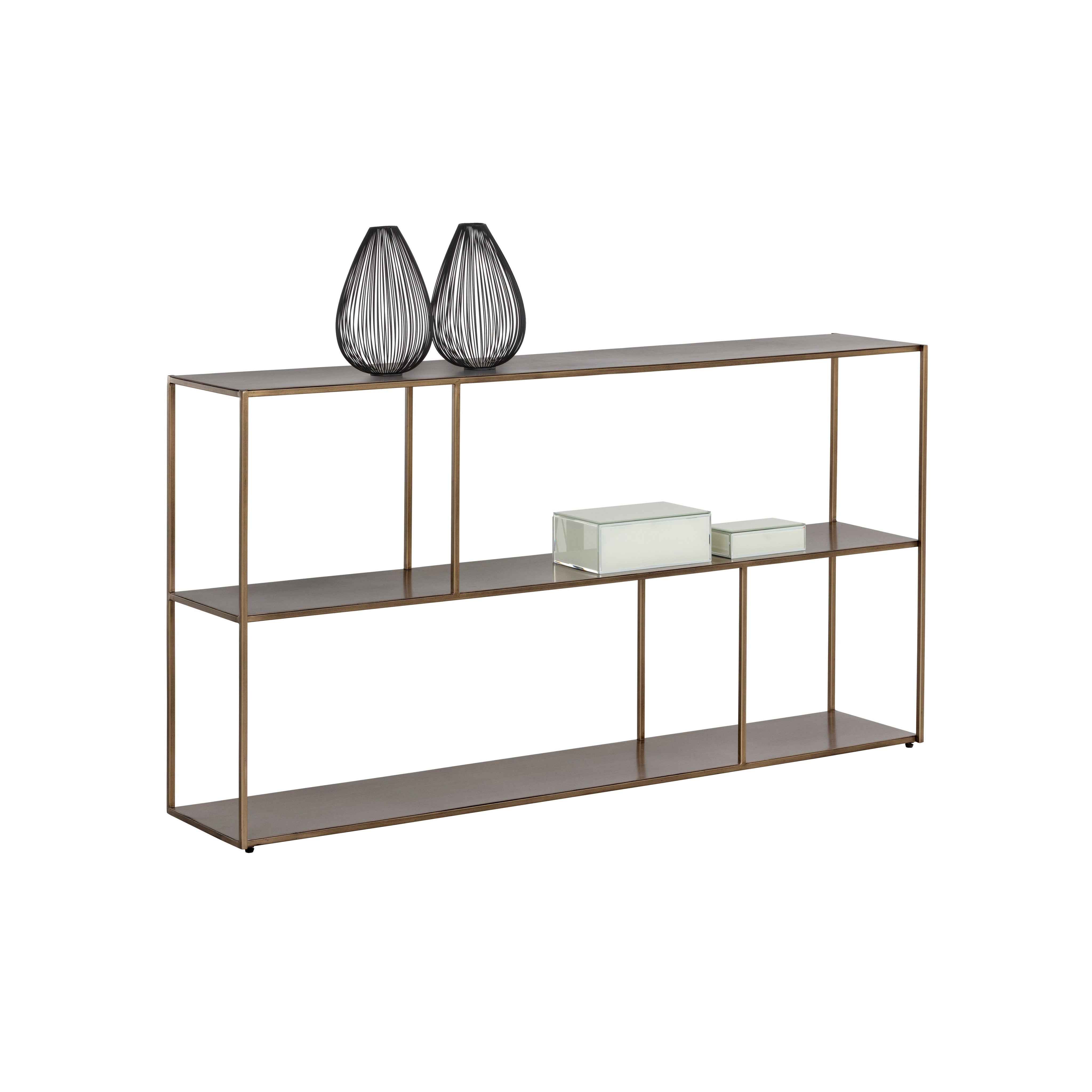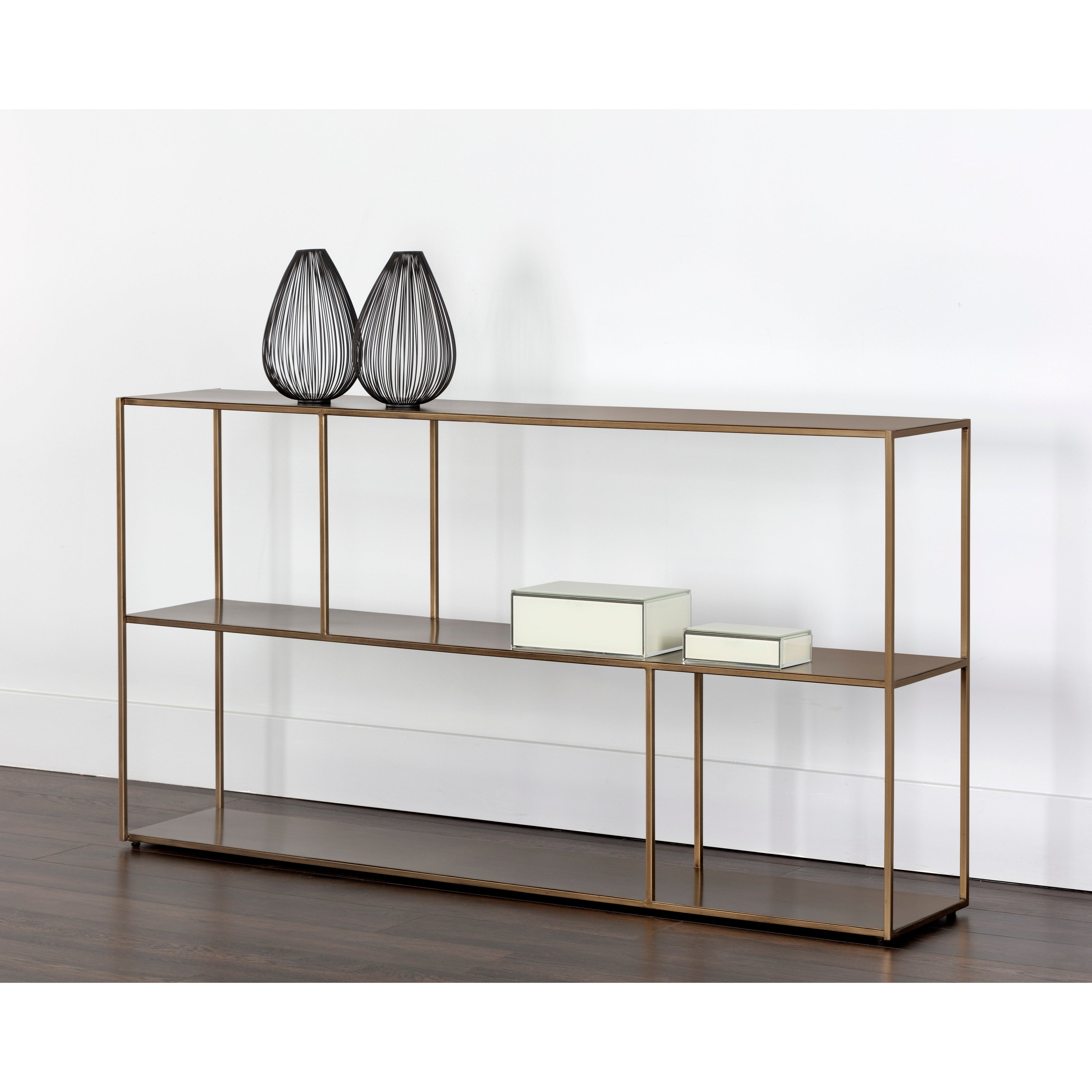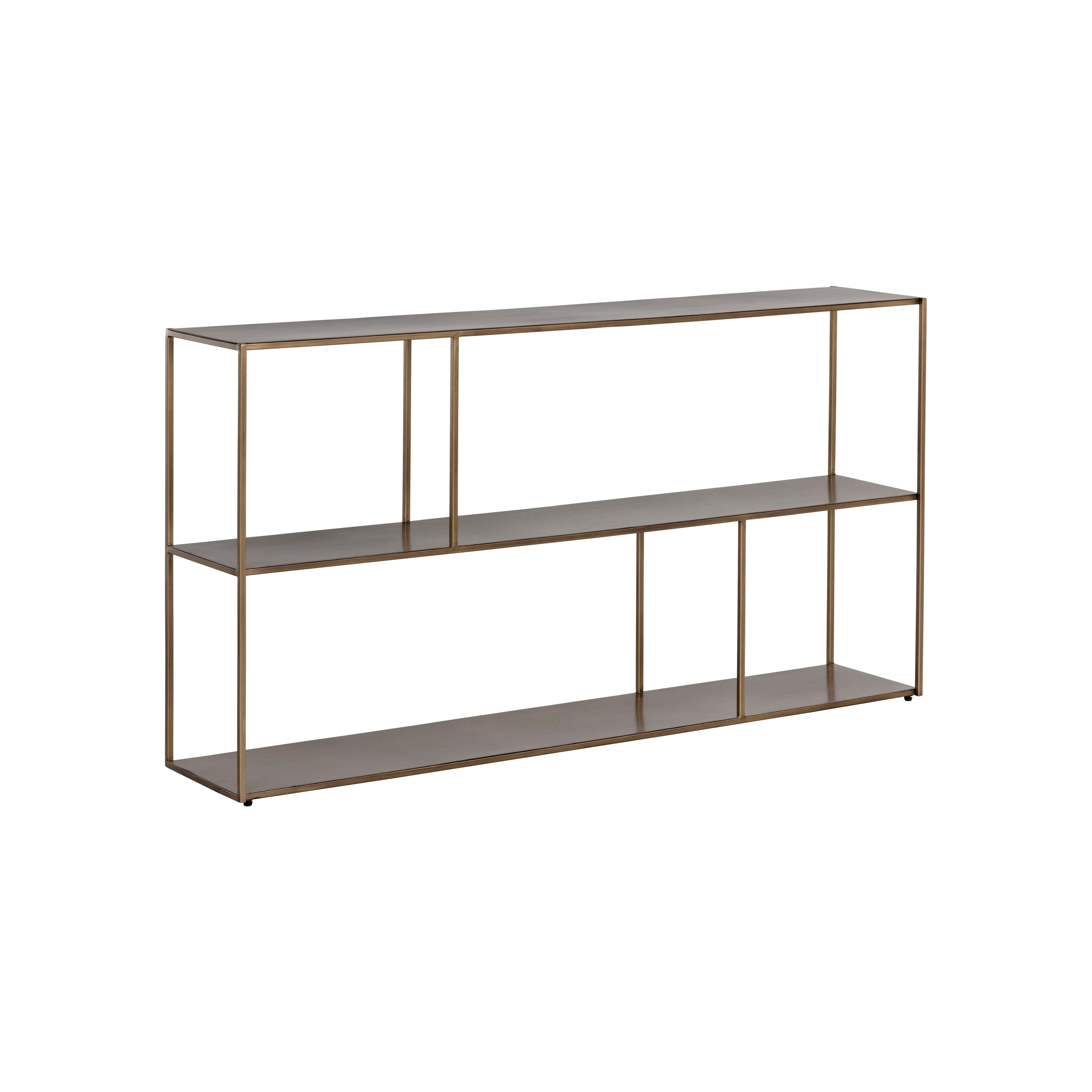 Add style and warmth to living and office spaces with this well-designed low bookcase in antique brass iron. Can be placed in pairs or multiples for added impact and functionality. Anti-tipping kit included.