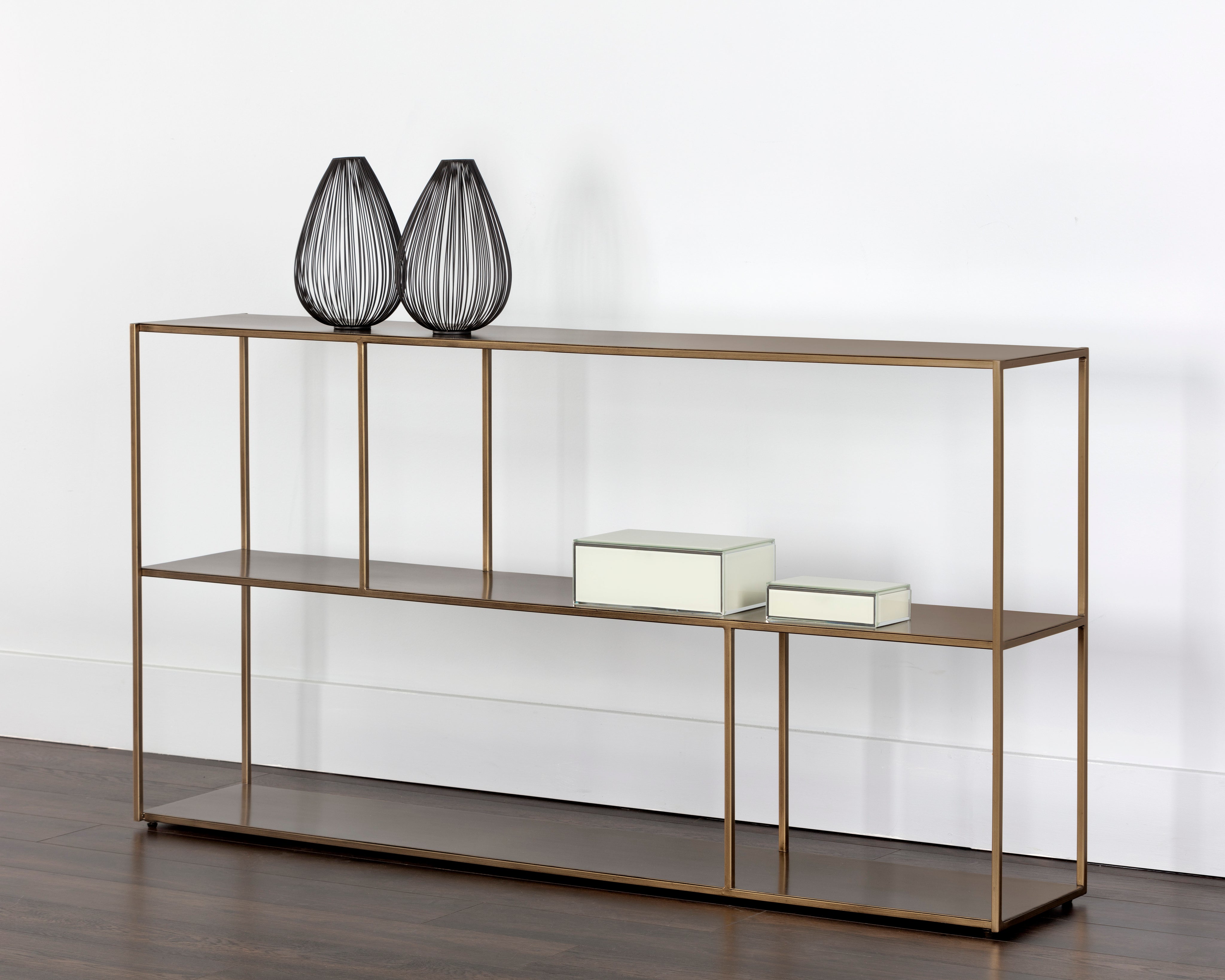 Add style and warmth to living and office spaces with this well-designed low bookcase in antique brass iron. Can be placed in pairs or multiples for added impact and functionality. Anti-tipping kit included.