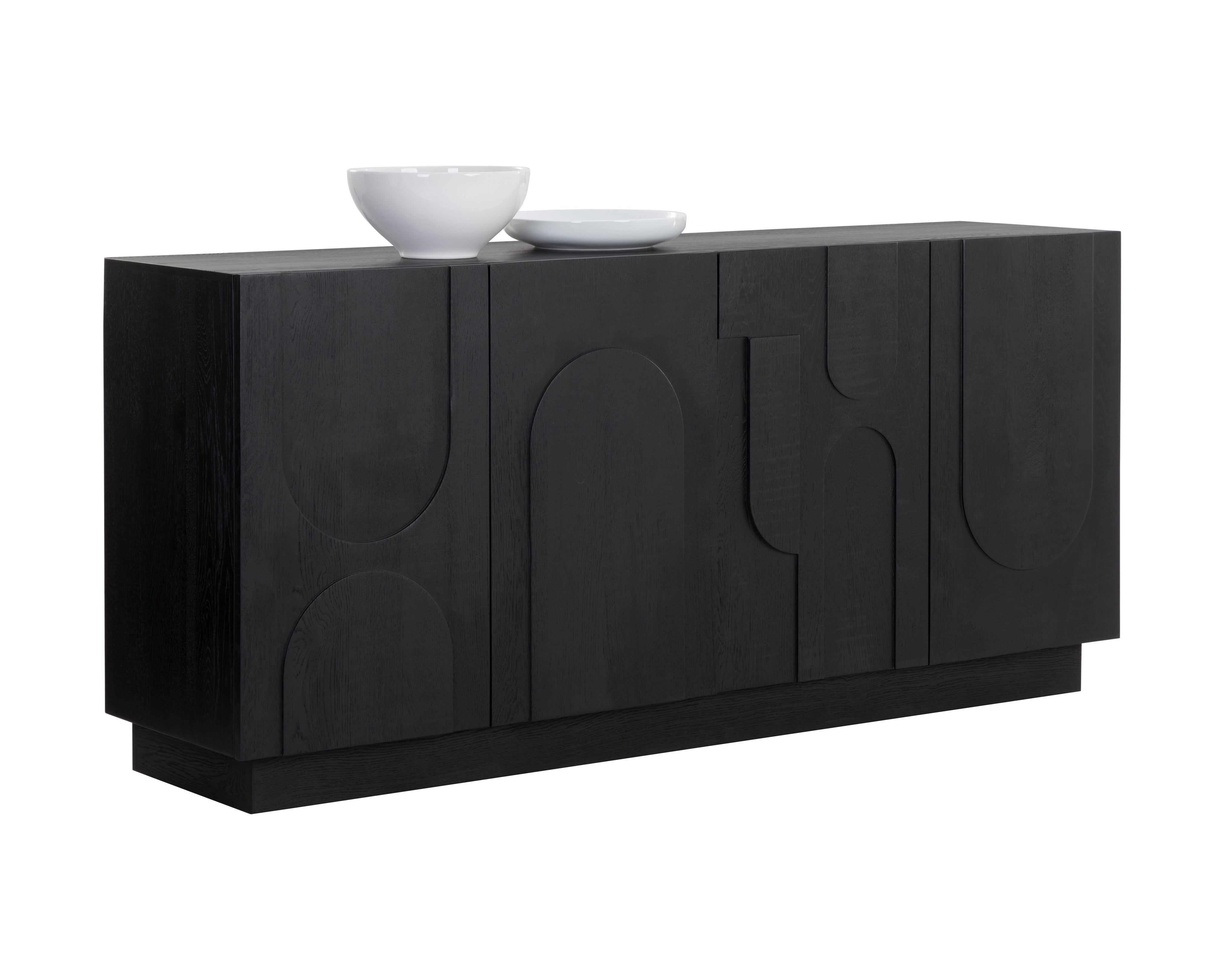 Taking cues from Scandinavian design, the Cove Sideboard is revitalized with beautiful wood patterning. Crafted from a black solid oak wood frame and completed with four cabinets for ample storage space. Anti-tipping kit included. As wood is an organic, porous material, these pieces will contain natural variation of texture and may also exhibit fine indentations and cracks. Wood pieces will also display a disparity of colour and grain, and visible knots and burls that add to the character of each piece. Made in India. With refined craftsmanship, this design was brought to life by skilled local artisans. Due to the nature of handcraftsmanship, unique imperfections such as fissures, markings and variations in colour and shape are welcomed and appreciated characteristics for a truly one-of-a-kind piece.