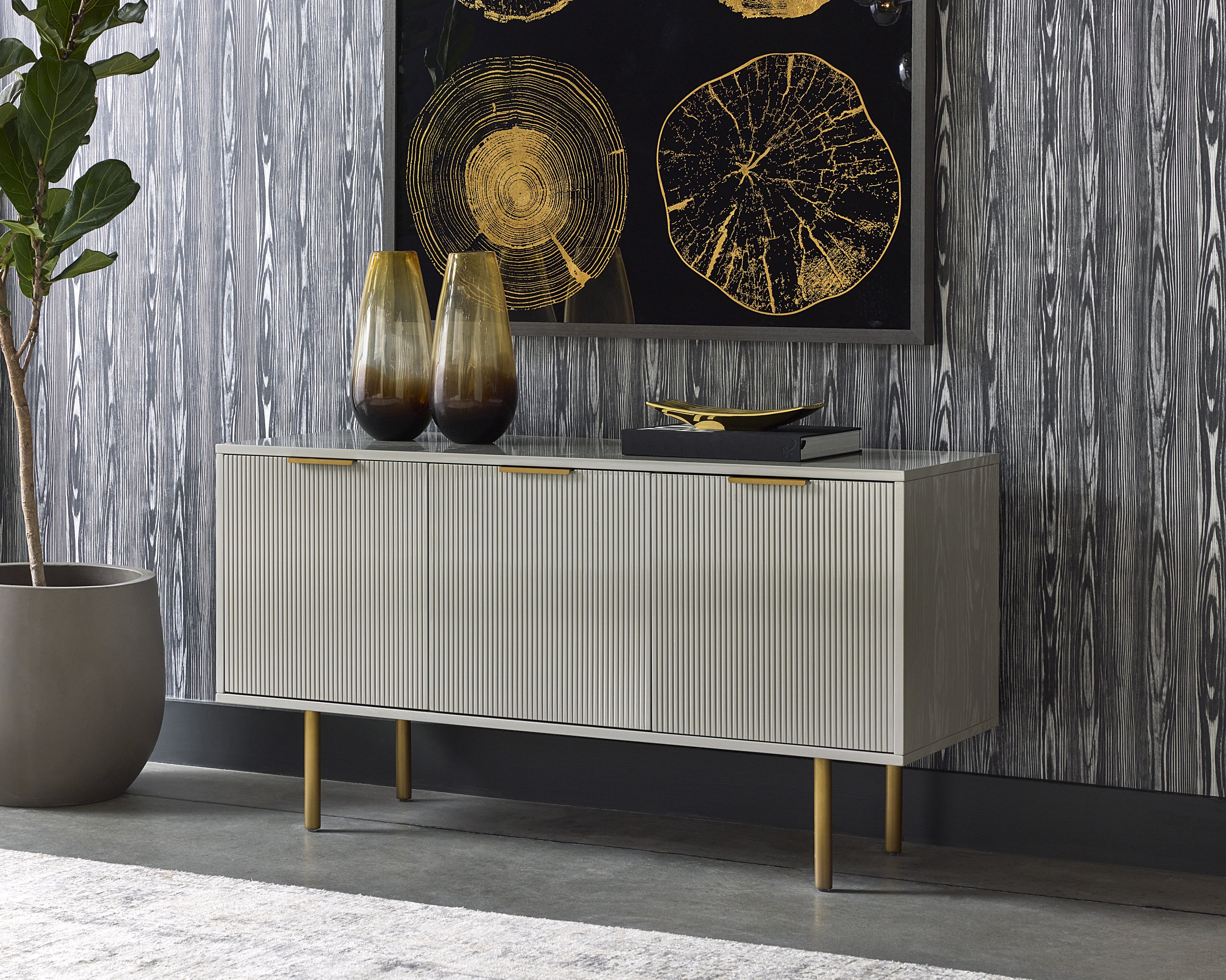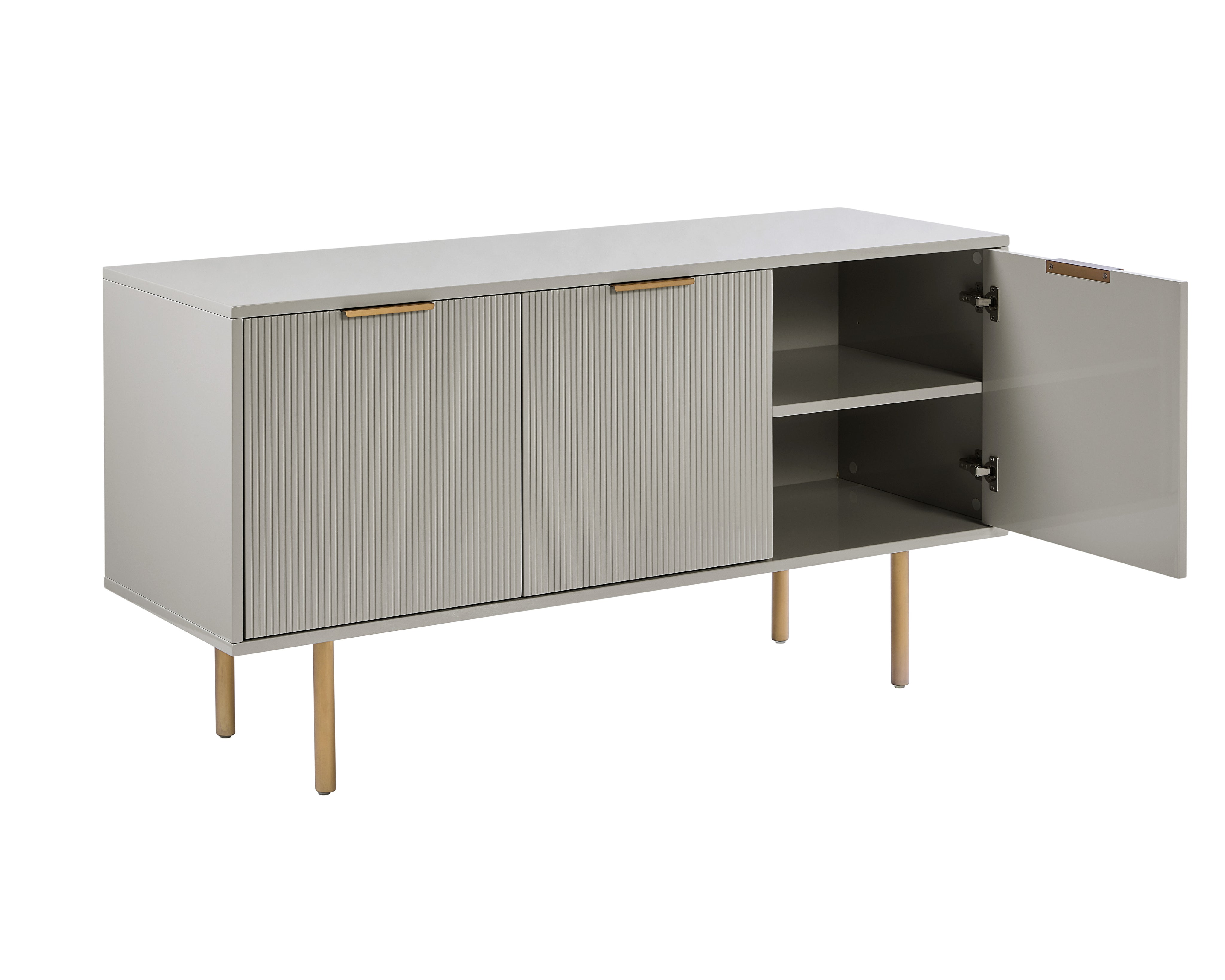 Effortlessly modern with a refined silhouette, this impressive sideboard will add style to any space. Crafted from a wood frame with a high gloss grey finish. Features three cabinets with a linear design. Completed with gold stainless steel hardware. As wood is an organic, porous material, these pieces will contain natural variation of texture and may also exhibit fine indentations and cracks. Wood pieces will also display a disparity of colour and grain, and visible knots and burls that add to the character of each piece.