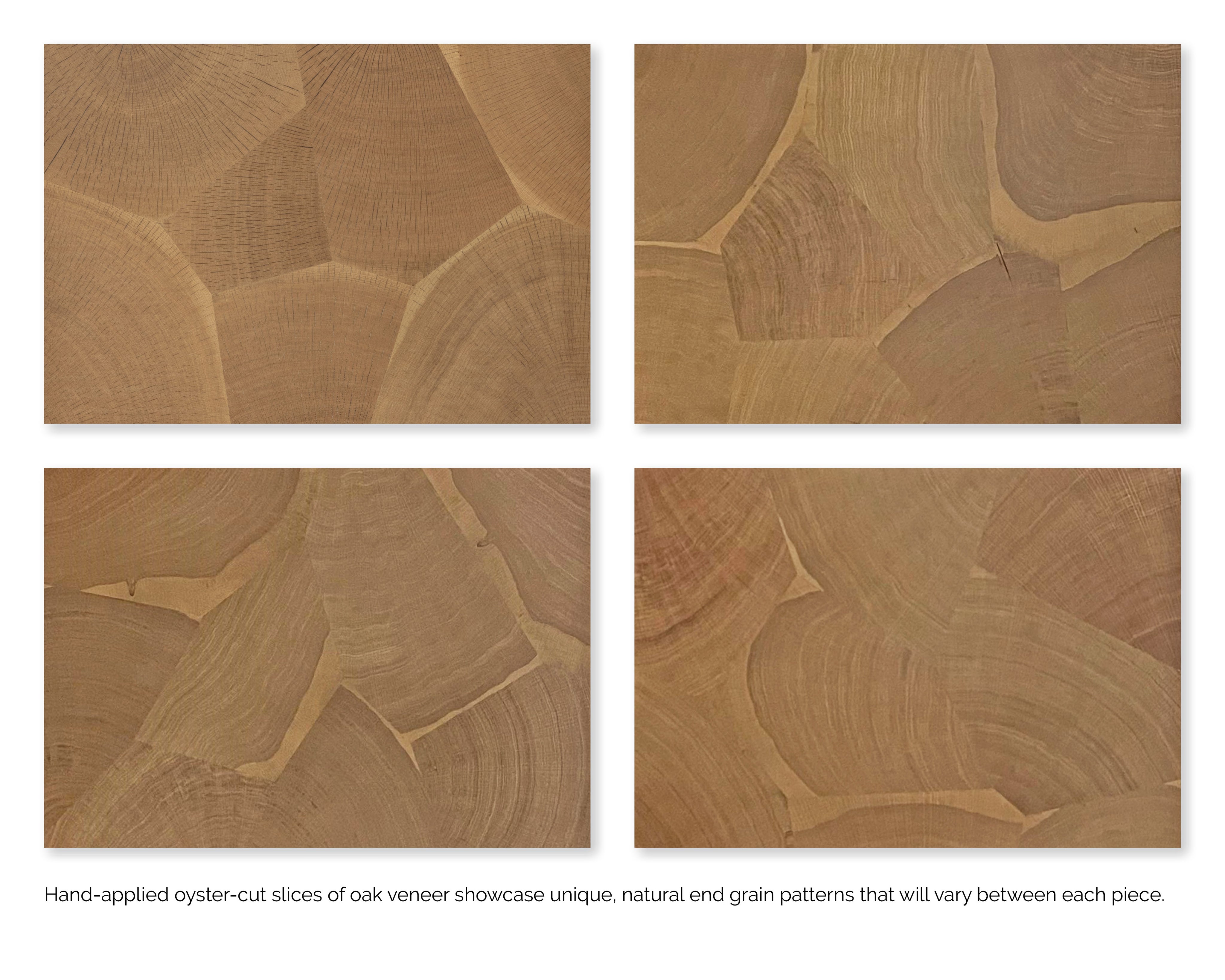 Magnificently crafted from solid oak wood, the Fauna Sideboard is an earthy delight. A stunning mosaic of oyster-cut oak veneer is beautifully pieced together on the cabinet fronts to create a distinct, eye-catching pattern.