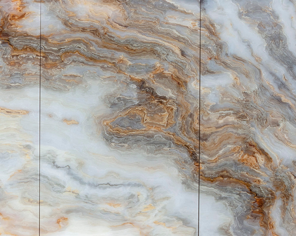 Incorporate a touch of extravagance to any dining space with this brilliant sideboard that is full of rich detail. Features a brown oak veener body with printed acrylic cabinets that share a likeness to mother of pearl. Ample storage is available inside the four cabinets that include soft close doors. Completed with a steel base in a brass finish. Anti-tip kit included.