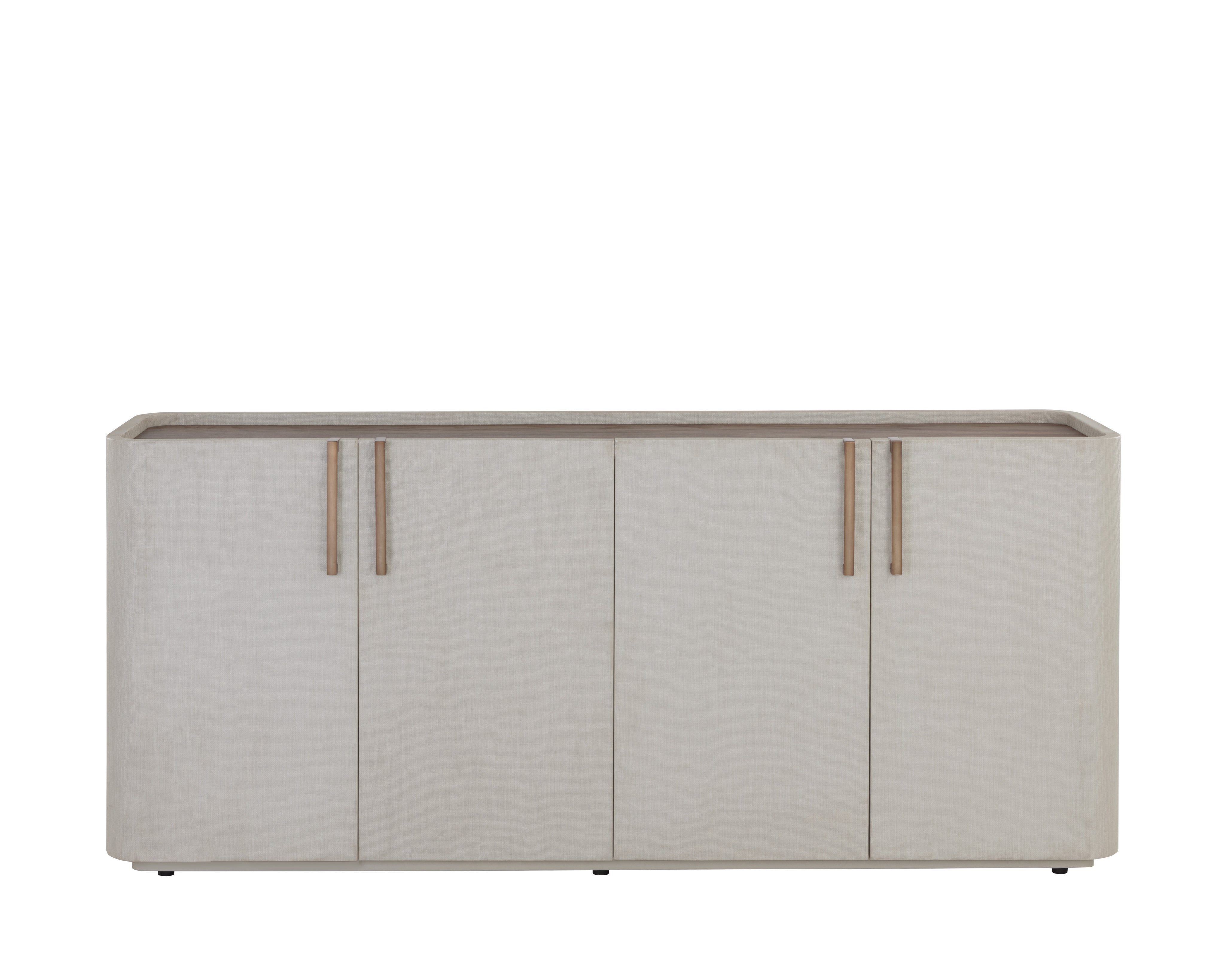 This contemporary sideboard is defined by its beautiful and gentle curves. Wrapped in cream faux leather with a brown oak veneer tabletop that is sure to impress. Includes four cabinets and completed with a solid acacia wood base. Handle With Care: This design has been crafted with faux leather. Faux leather is manufactured to reflect the natural characteristics of leather; as such, colour variations, markings wrinkles, grooves, and light scratches are appreciated characteristics. No two pieces will be alike. Visit our Product Care page for more information on how to ensure the lasting beauty of this piece.