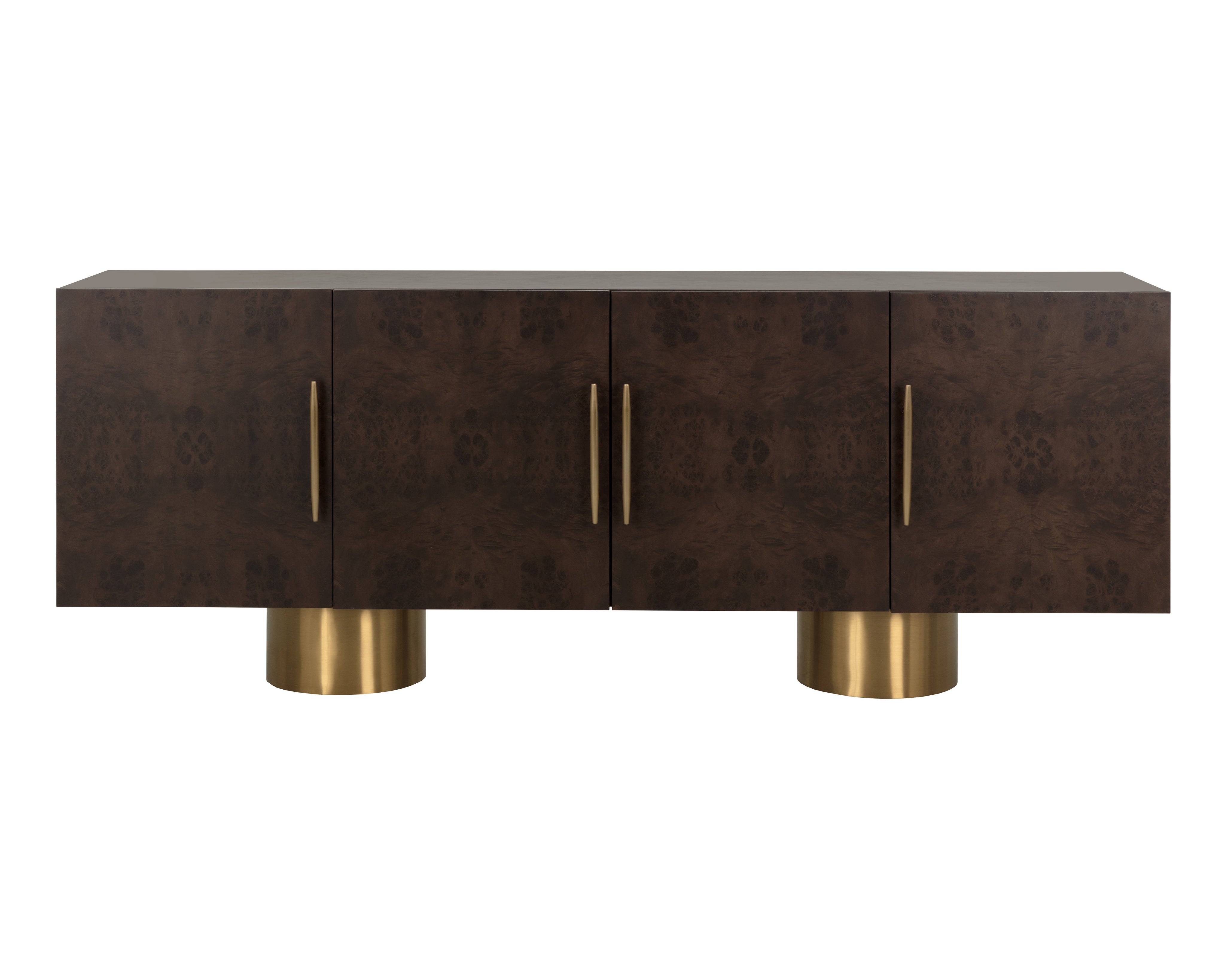 With rich brown hues and gold stainless steel accents, the Kresteven Sideboard imbues any space with an air of understated luxury. The intricate swirling patterns and distinct mottled shading of maple burl veneer emphasize quality craftsmanship and modern design.