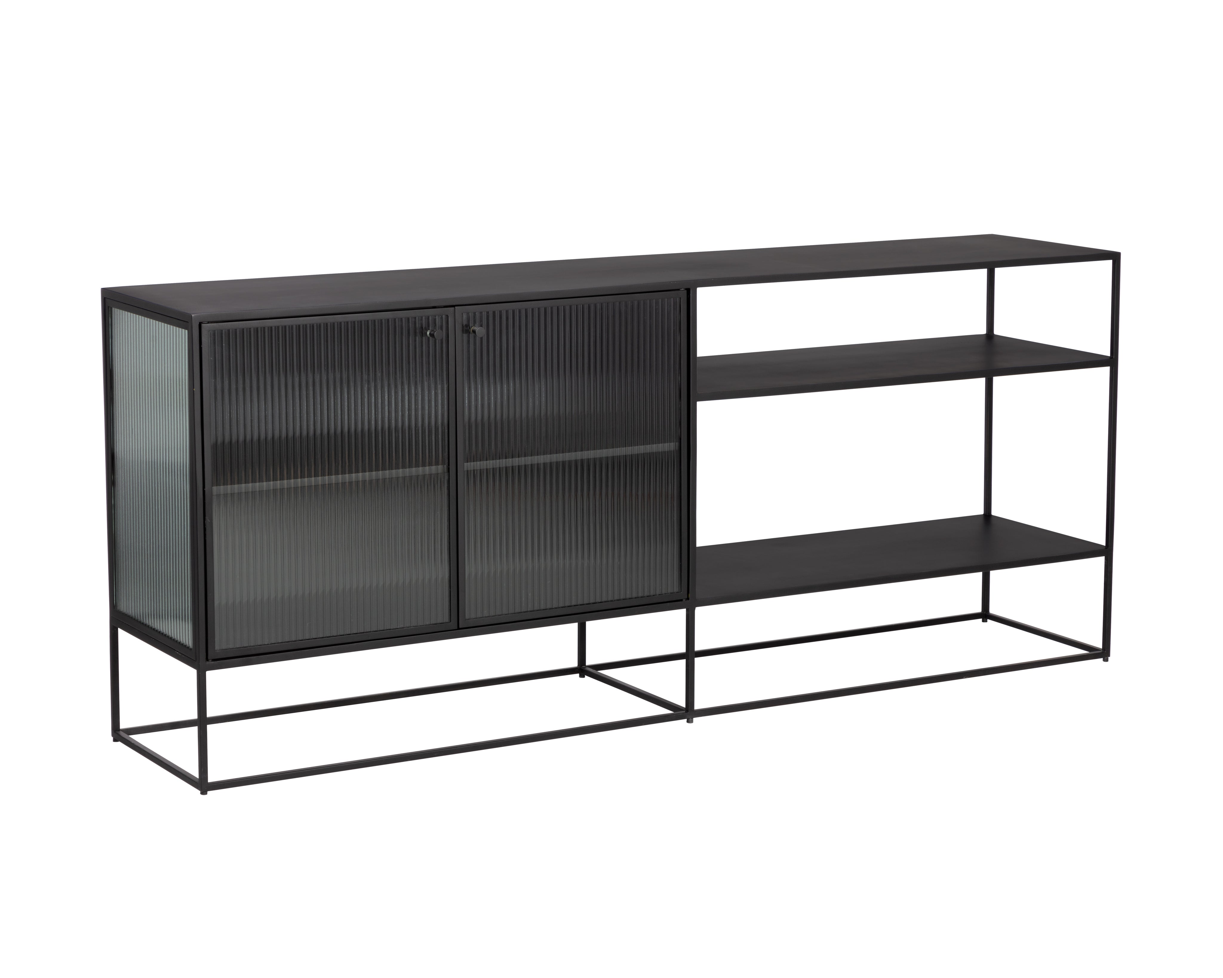 Inspired by mid-century modern designs, this large sideboard evokes a timeless and minimalist style. Crafted with a matte black iron frame and features fluted glass doors.