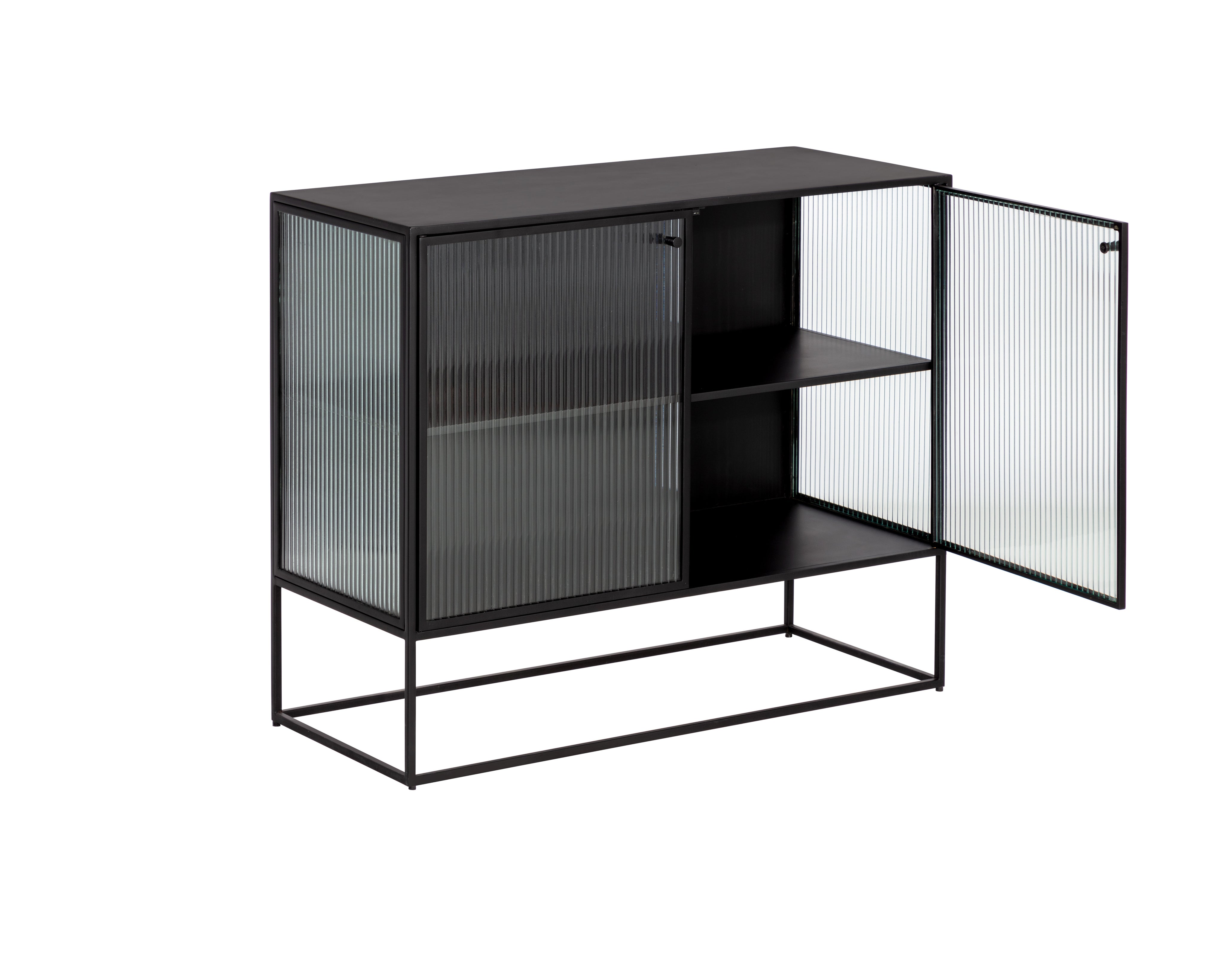 Inspired by mid-century modern designs, this small sideboard evokes a timeless and minimalist style. Crafted with a matte black iron frame and features fluted glass doors.