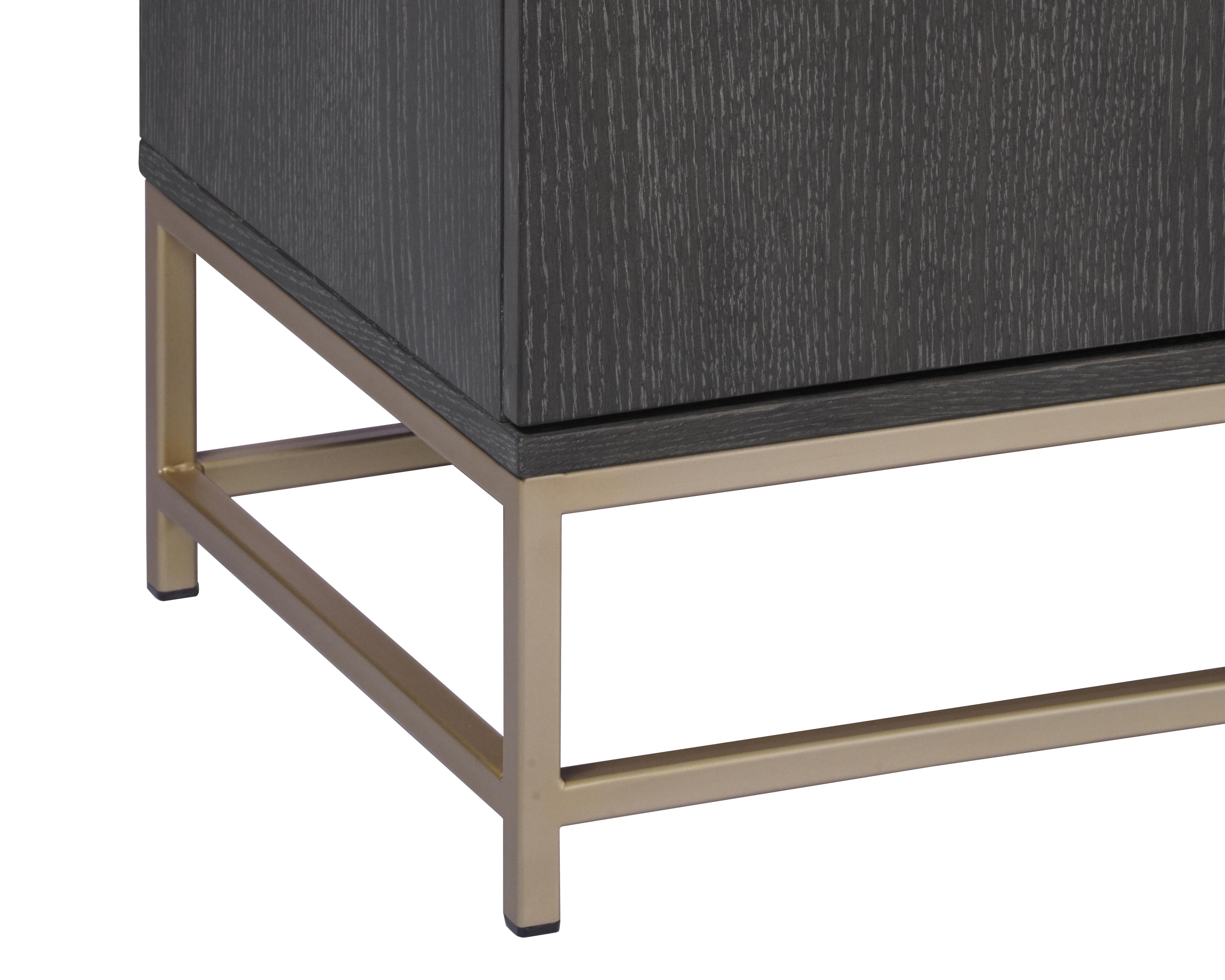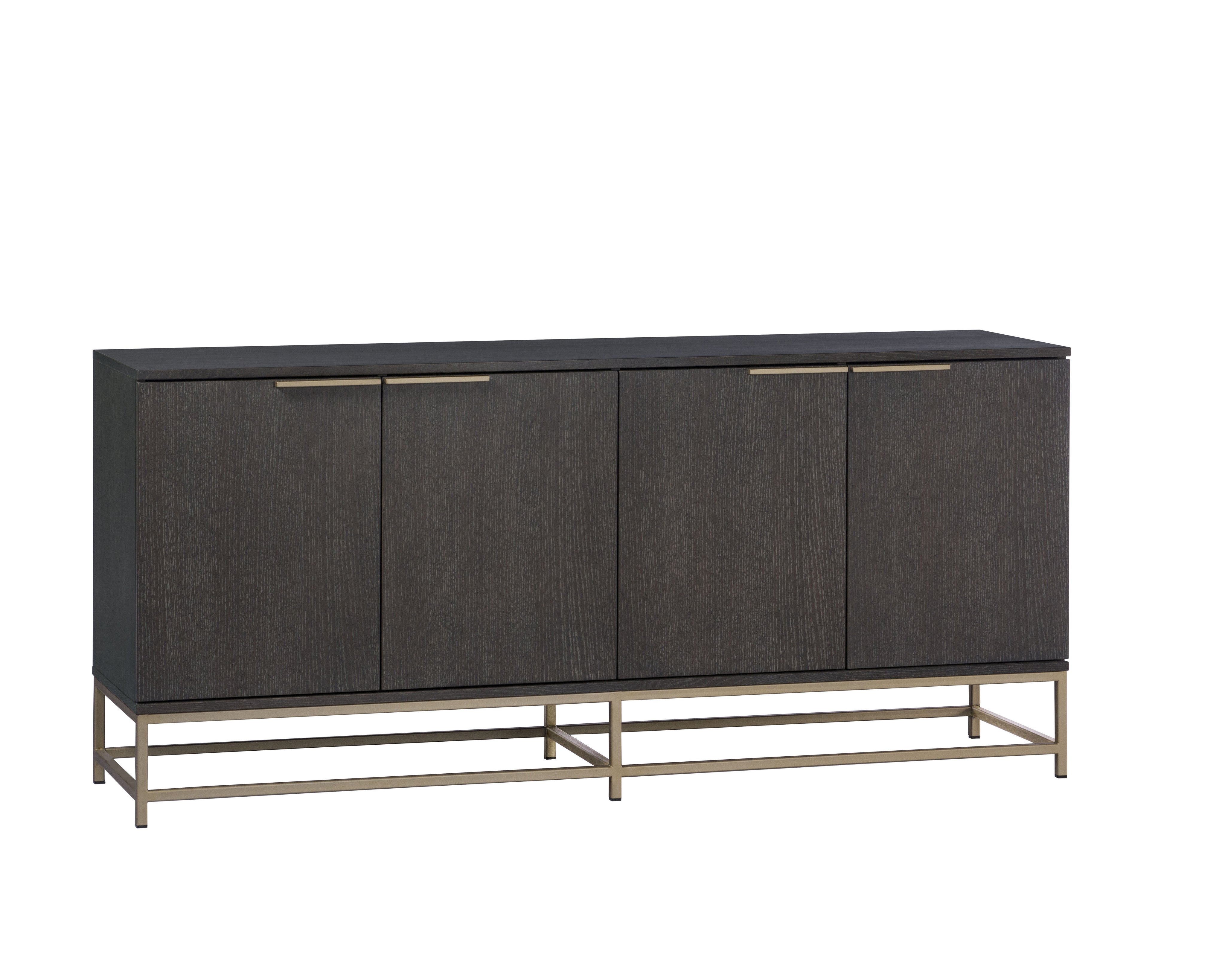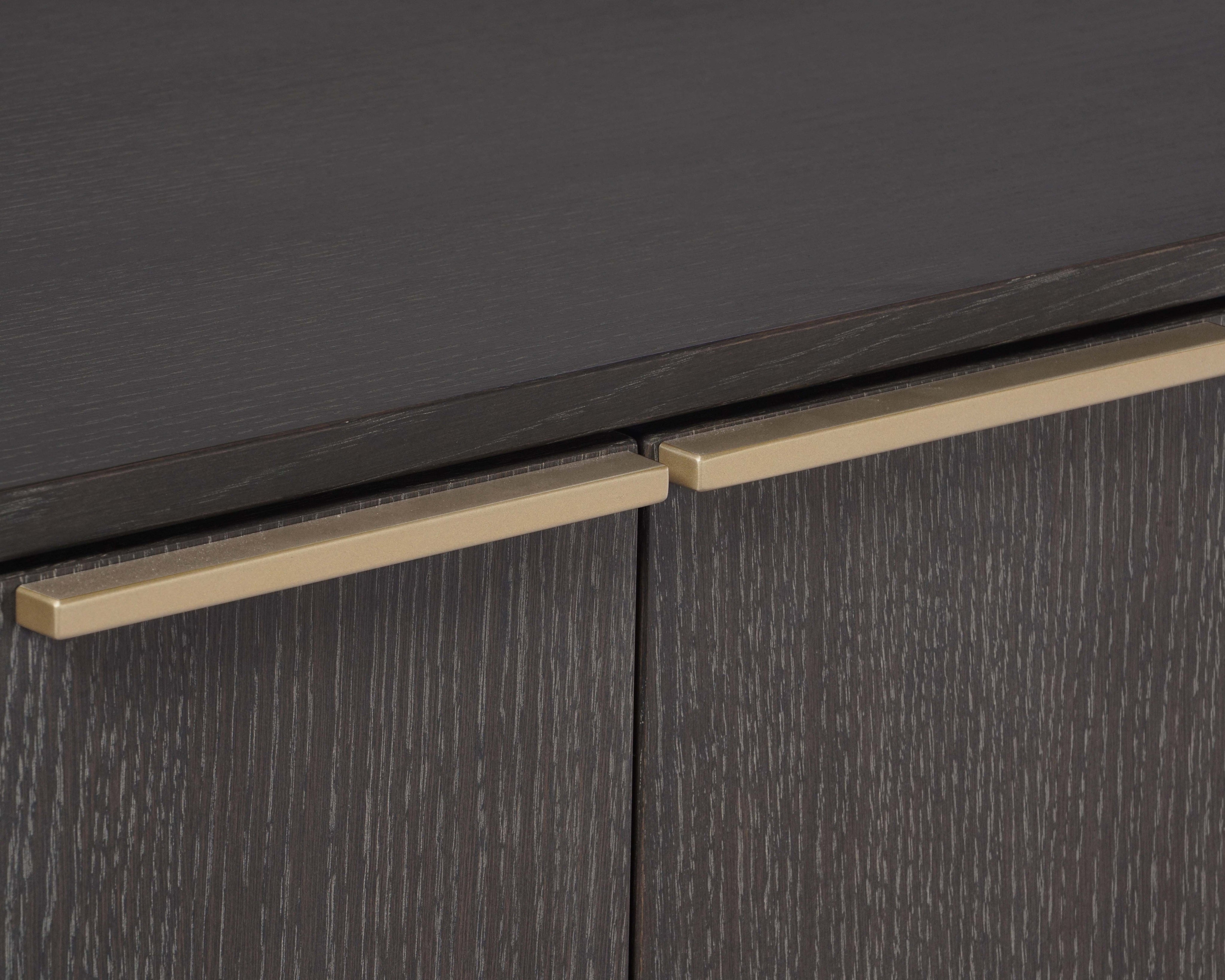 A modern sideboard designed to add a beautiful touch to the living, lounge, office and dining spaces. Crafted from charcoal grey oak veneer with four cabinets and shelves for added storage. Brushed gold iron hardware completes the look. As wood is an organic, porous material, these pieces will contain natural variation of texture and may also exhibit fine indentations and cracks. Wood pieces will also display a disparity of colour and grain, and visible knots and burls that add to the character of each piece.