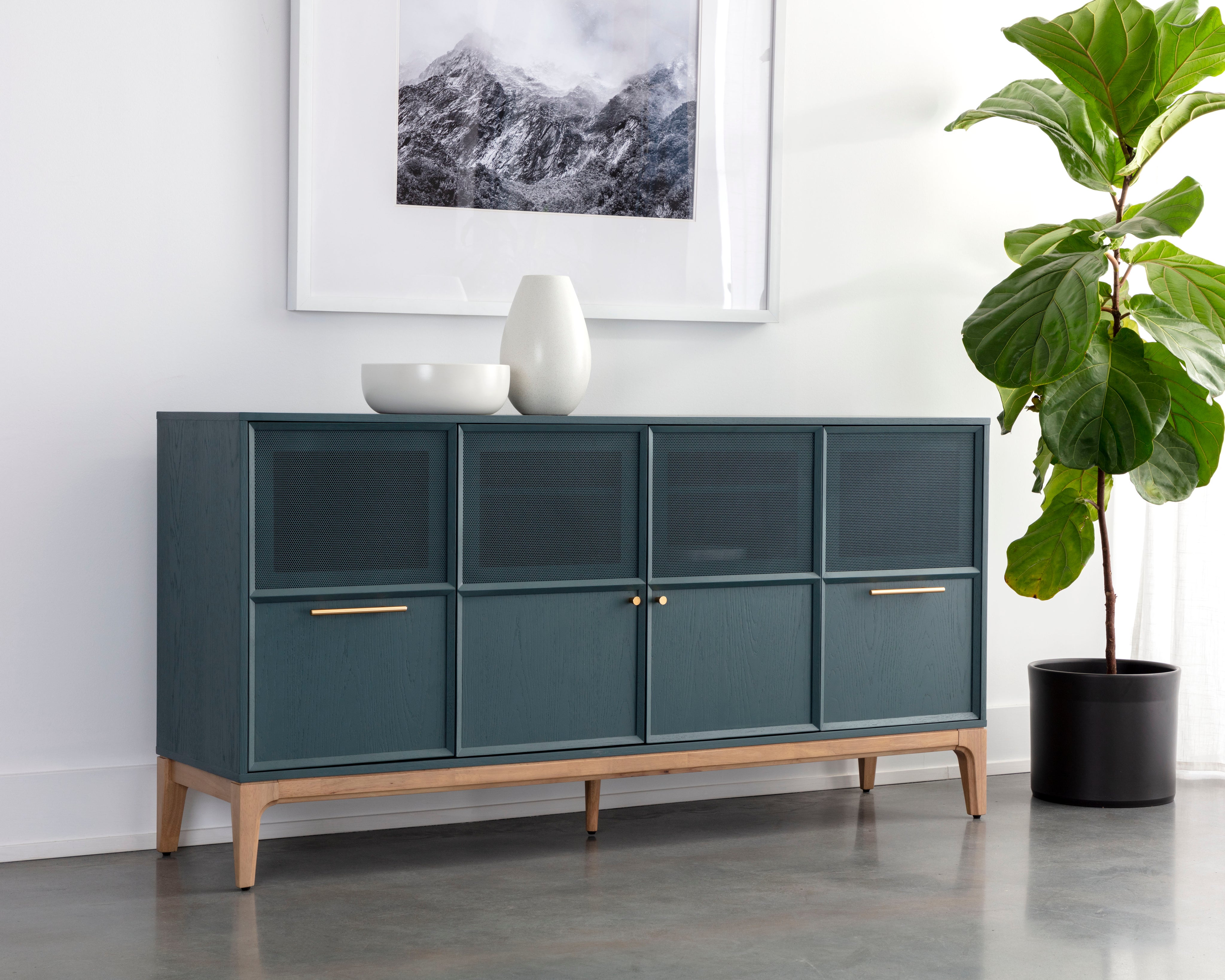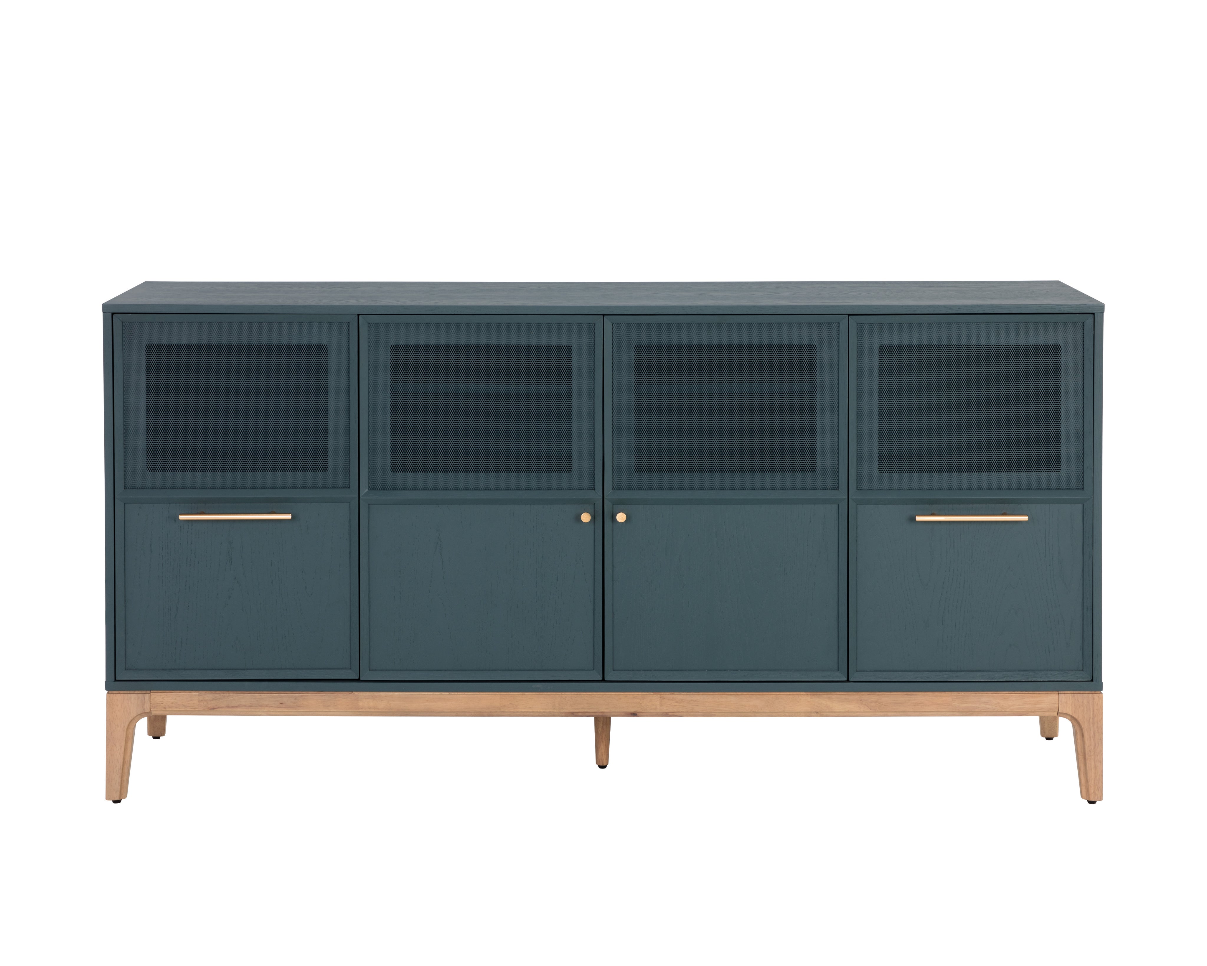 With a timeless design, the Rivero Sideboard is a delightful addition to any space. Crafted with a teal oak veneer for a subtle pop of colour, and complemented with a light wash rubberwood base. Includes ample storage with metal hardware in a gold finish. As wood is an organic, porous material, these pieces will contain natural variation of texture and may also exhibit fine indentations and cracks. Wood pieces will also display a disparity of colour and grain, and visible knots and burls that add to the character of each piece.