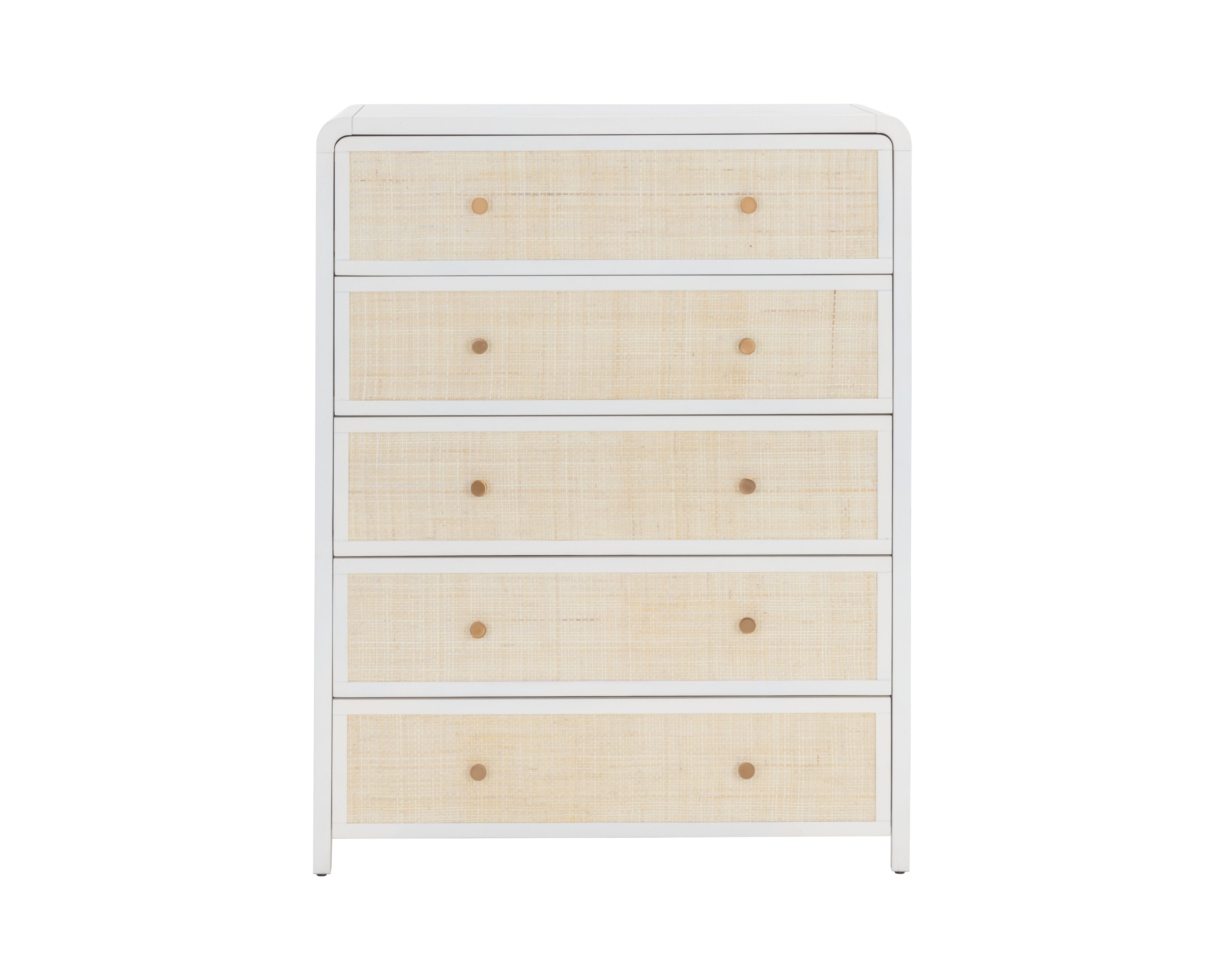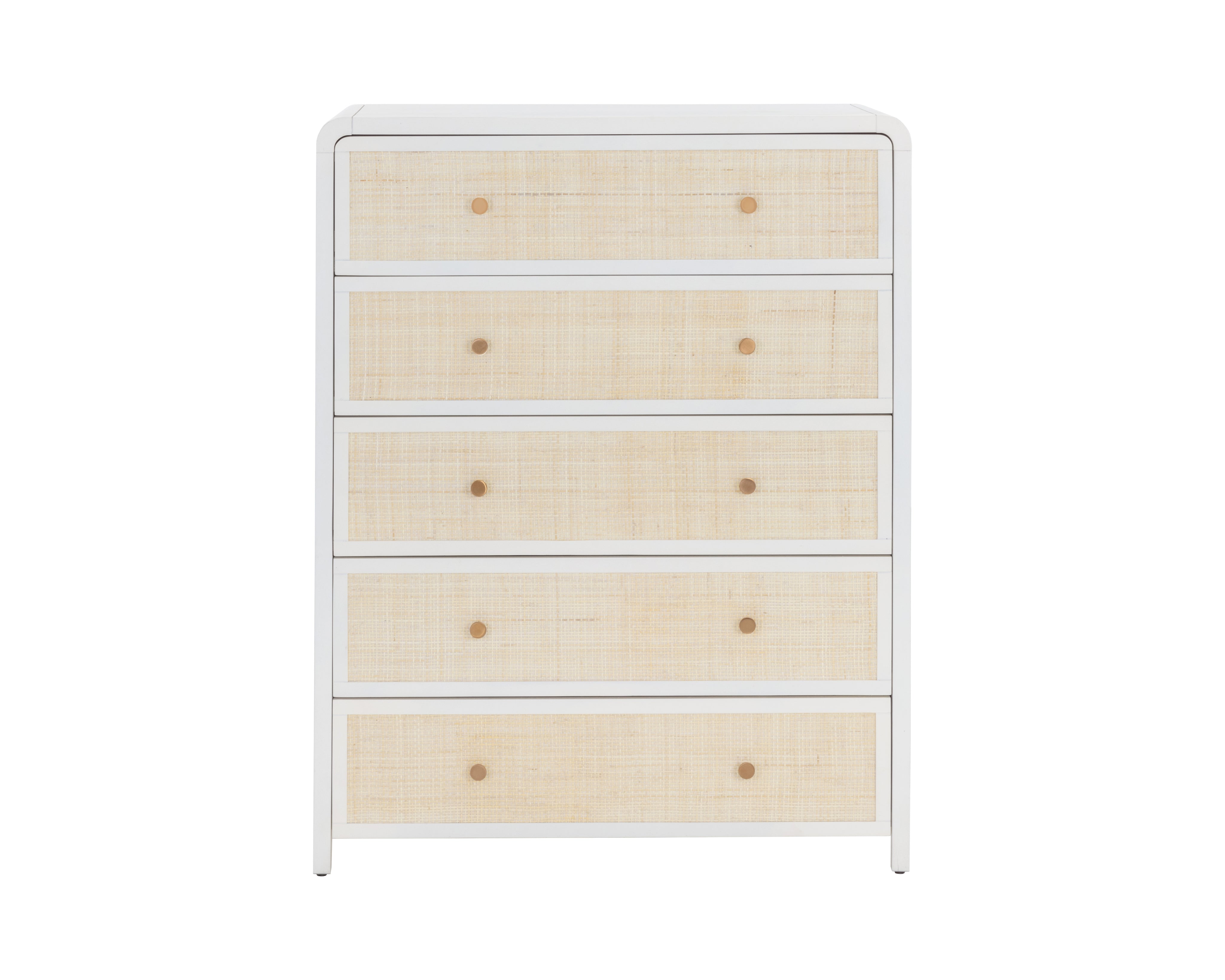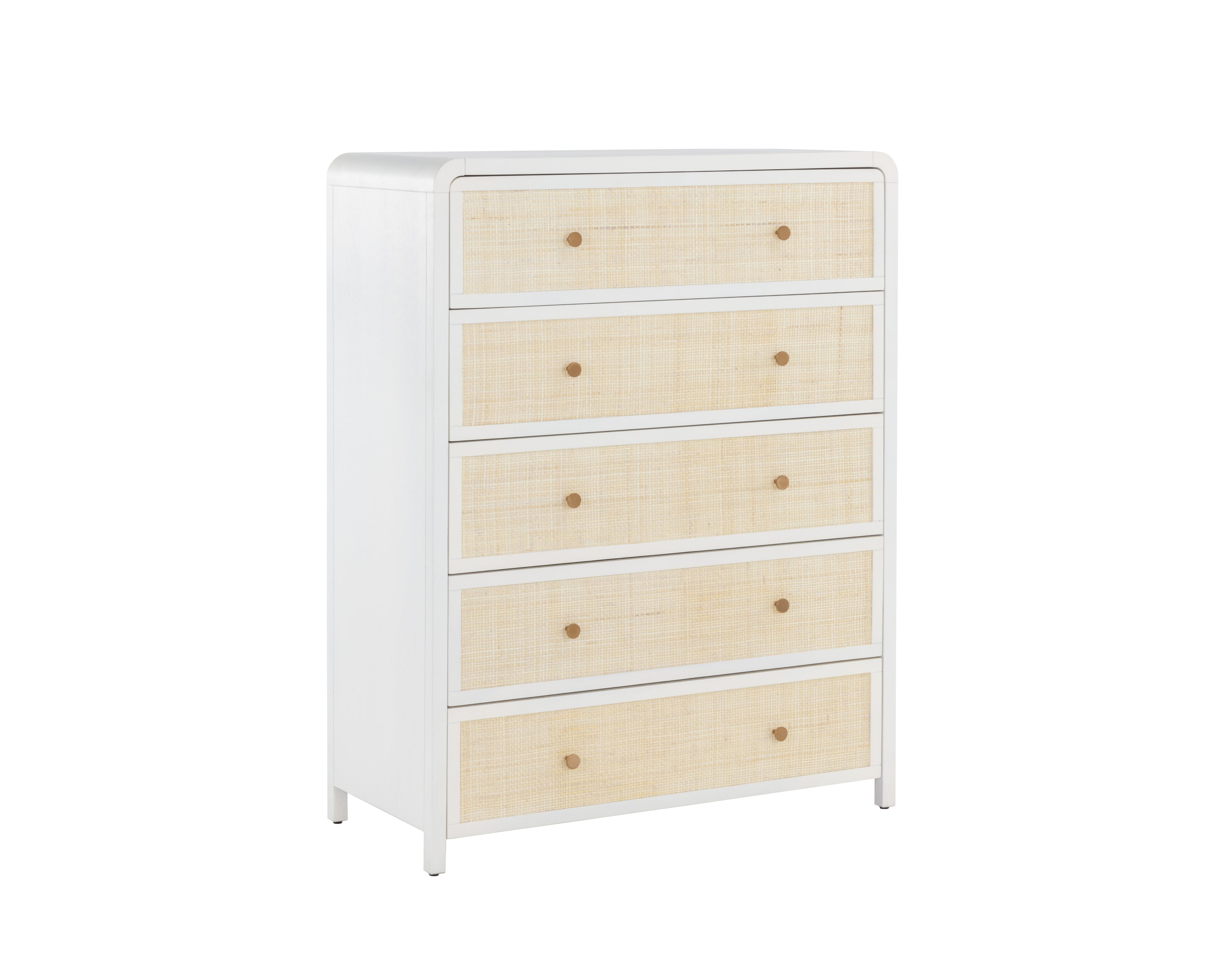 Boasting a stylish design with coastal influence, this beautiful chest features a clean-cut silhouette. Features an antique white wood frame with natural rattan detailing on five spacious drawers. Completed with minted copper steel hardware. Handle With Care: This design has been crafted with rattan. This artisan-crafted material features intricate weaving that results in natural variations where no two pieces are alike. Colour and texture differences are to be expected and embraced with this natural material. Due to the weaving process used, the fibres in this material may display shorter or longer lengths where the weaving ends. Visit our Product Care page for more information on how to ensure the lasting beauty of this piece. As wood is an organic, porous material, these pieces will contain natural variation of texture and may also exhibit fine indentations and cracks. Wood pieces will also display a disparity of colour and grain, and visible knots and burls that add to the character of each piece.