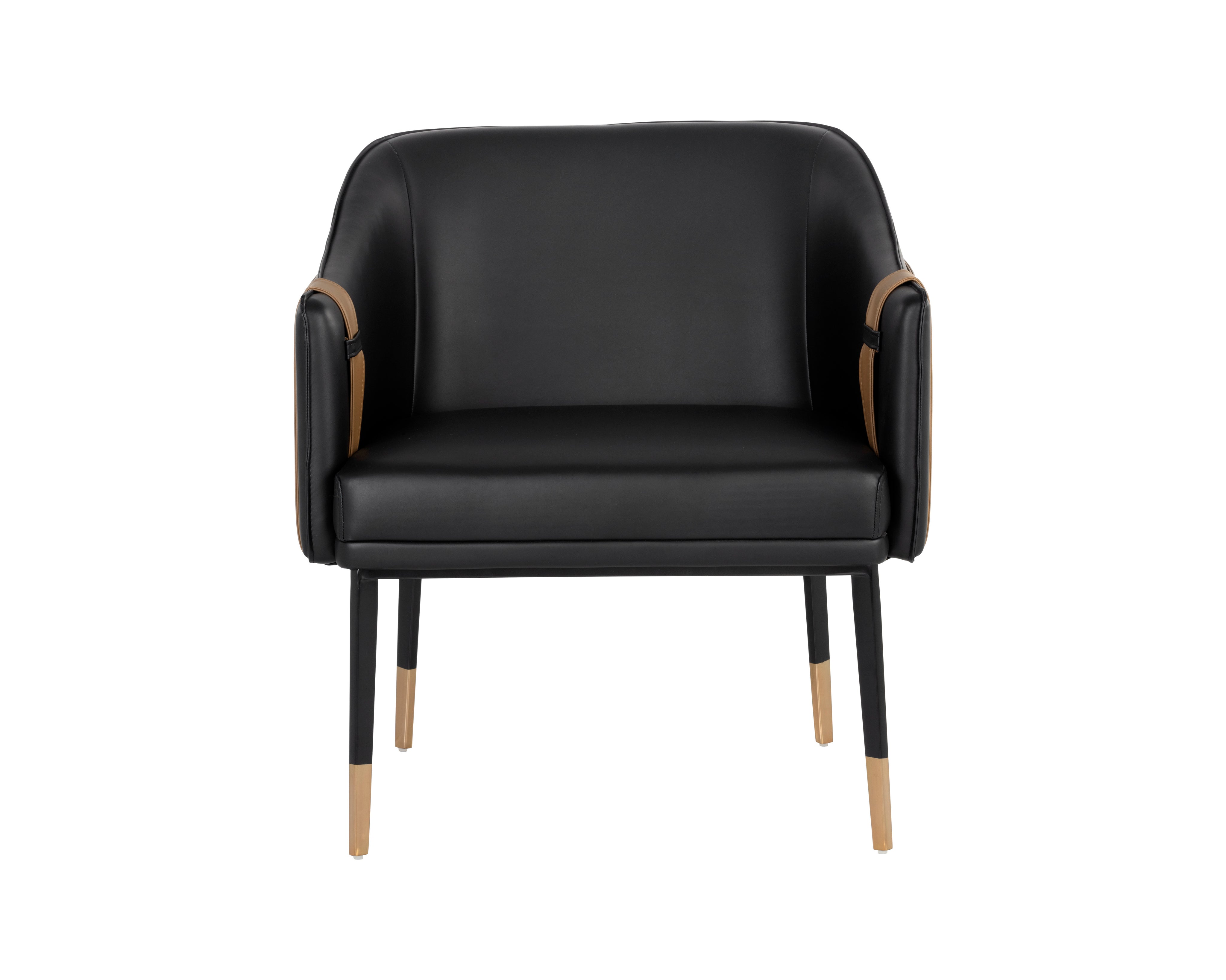 A unique barrel back lounge chair upholstered in supple napa beige and black faux leather and accented with a contrasting exterior in napa tan and cognac faux leather. Finished with black steel legs and copper foot caps. Suitable for residential and commercial spaces. Handle With Care: This design has been crafted with faux leather. Faux leather is manufactured to reflect the natural characteristics of leather; as such, colour variations, markings wrinkles, grooves, and light scratches are appreciated characteristics. No two pieces will be alike. Visit our Product Care page for more information on how to ensure the lasting beauty of this piece.
