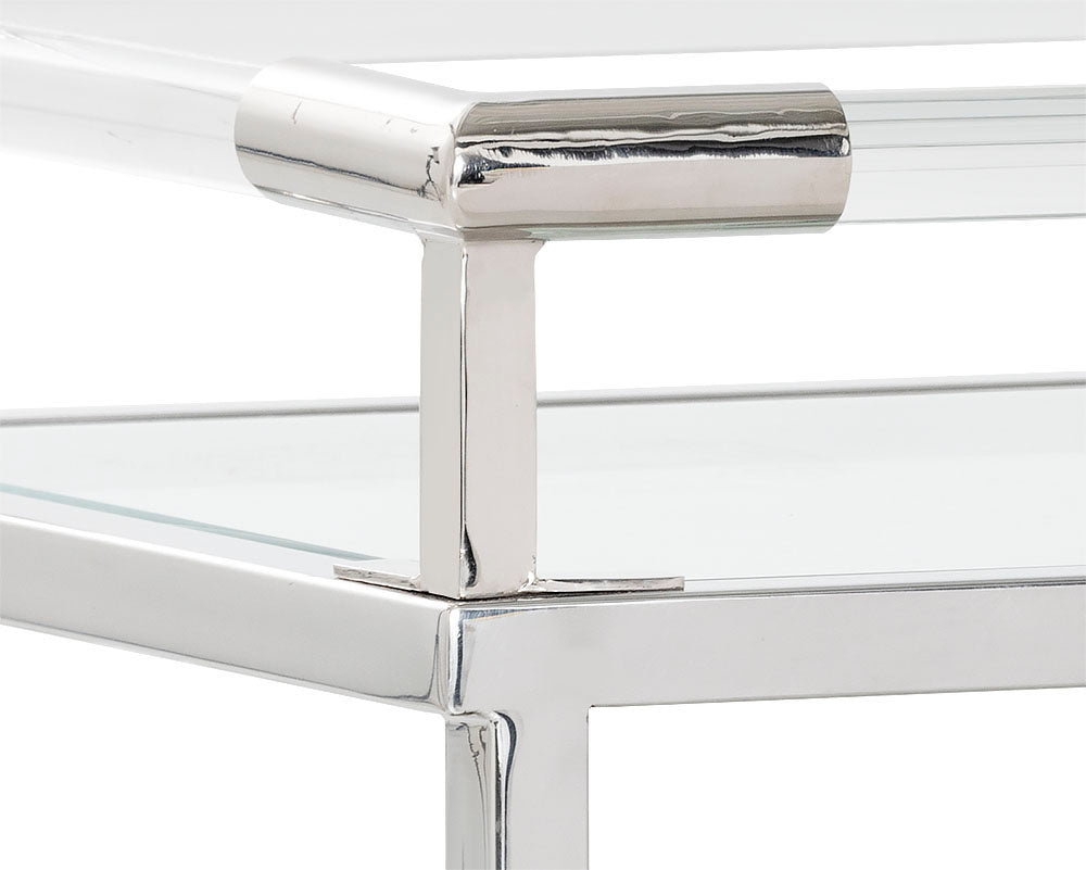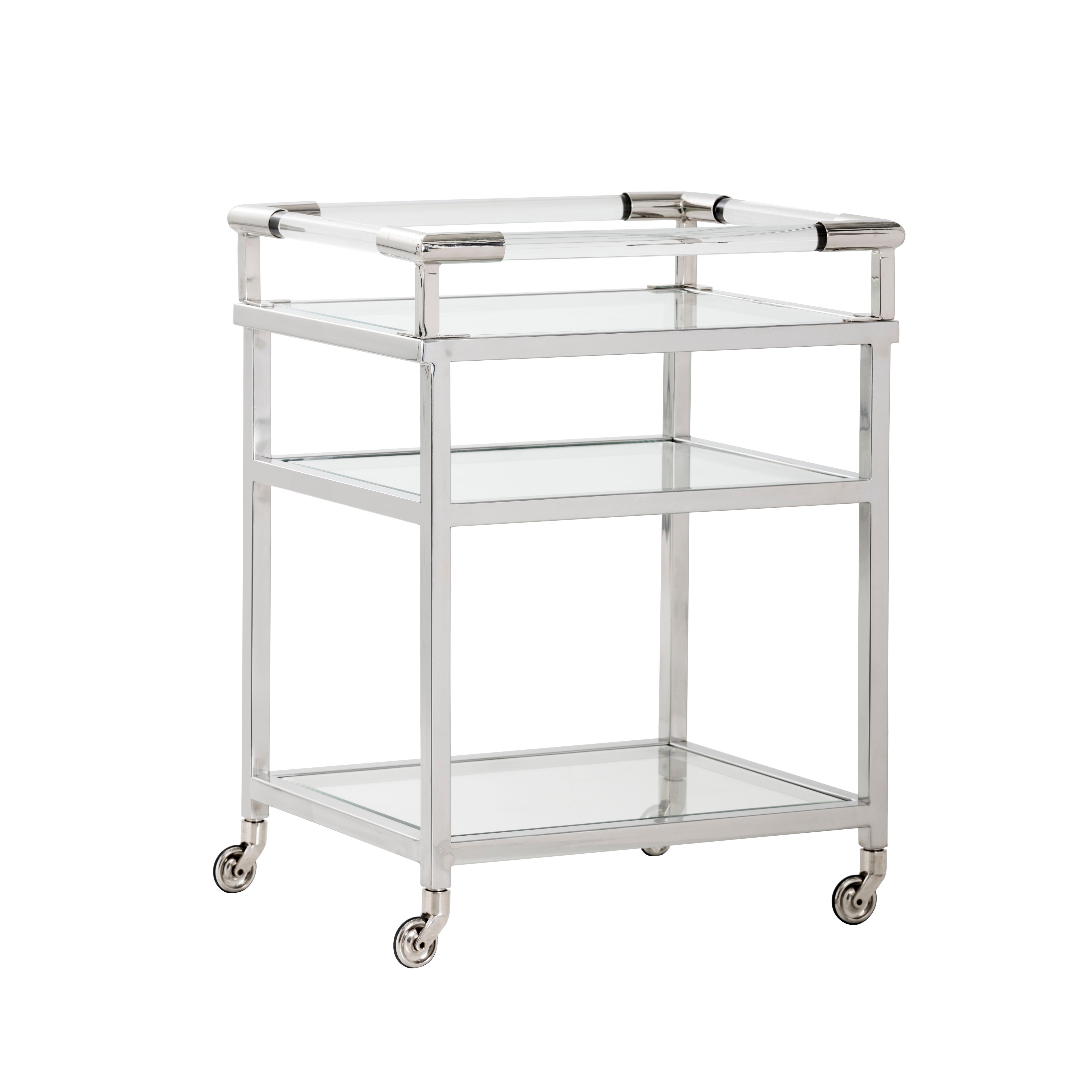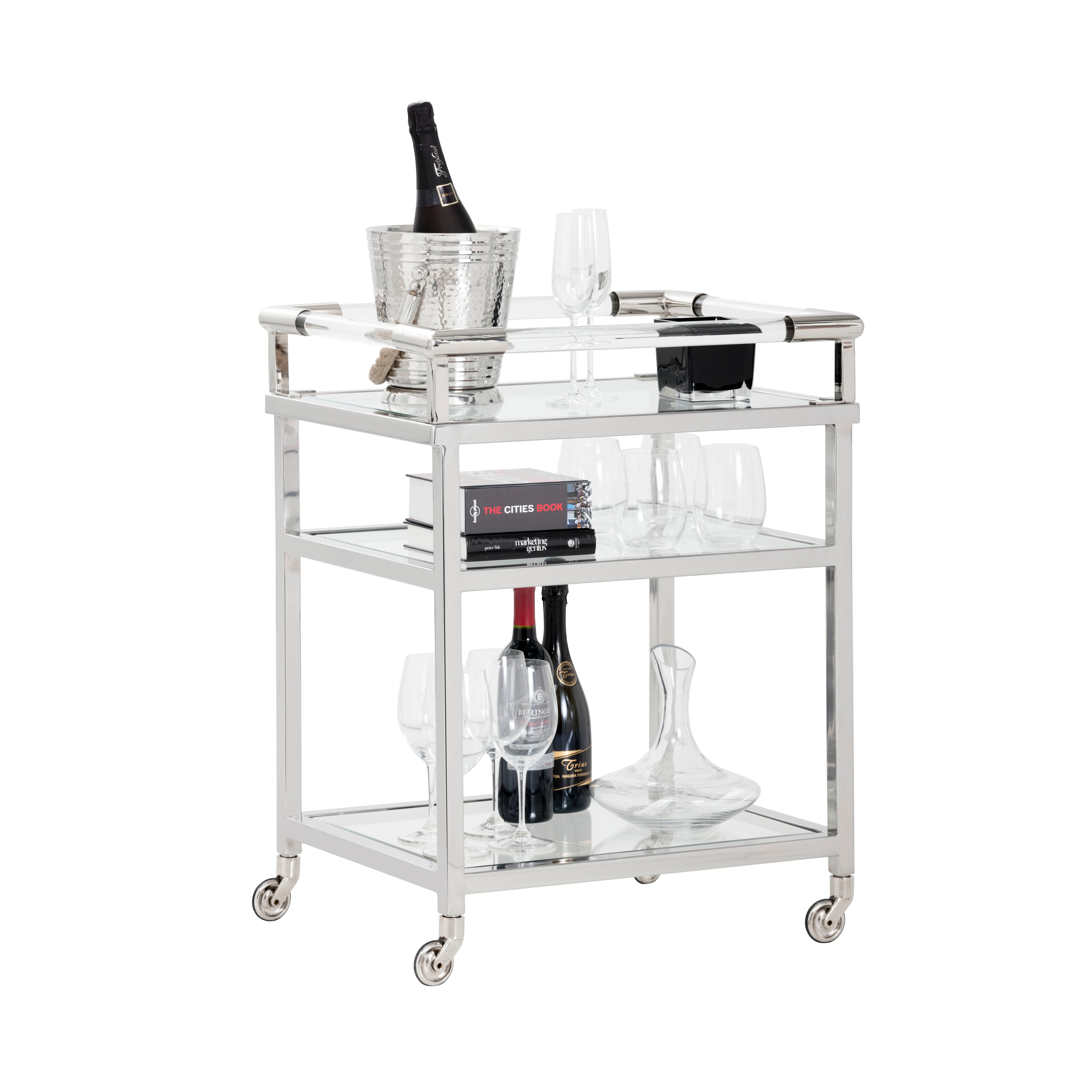 A stylish and functional bar cart designed to showcase barware and accessories. Constructed of polished stainless steel with tempered glass shelving and acrylic handles. Castors allow for easy movement.