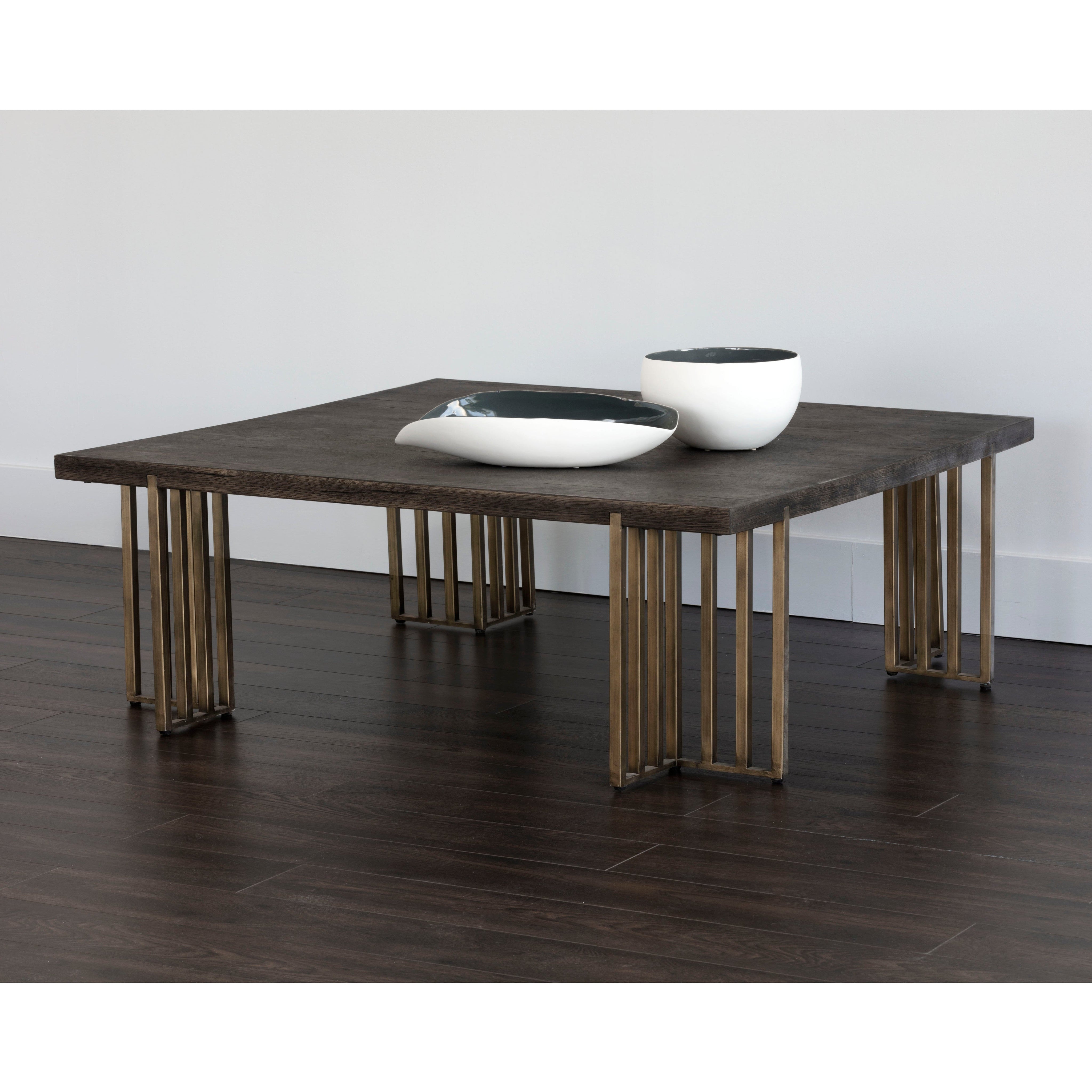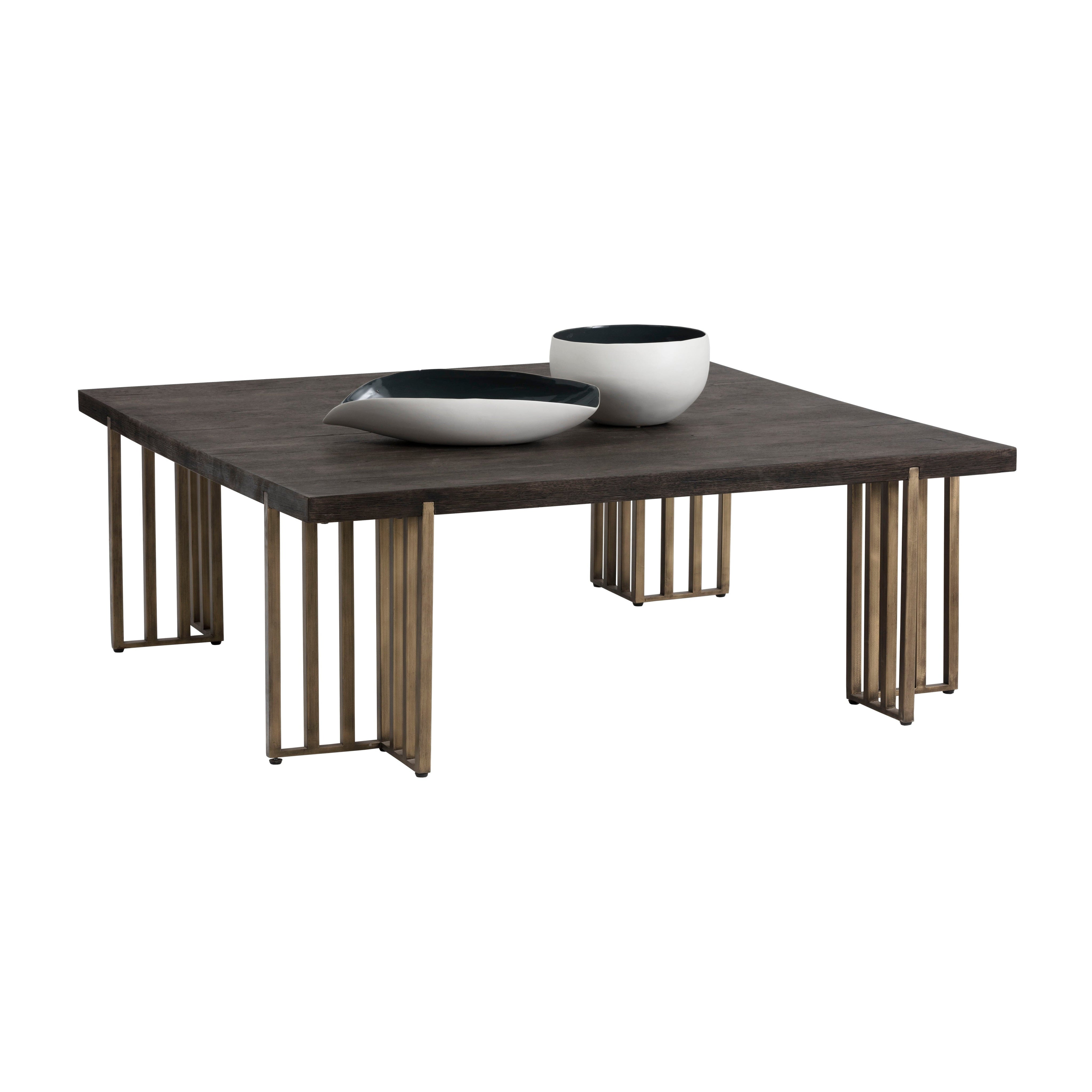 This square coffee table will bring warmth and style to various living and lounge spaces. The distressed oak wood veneer top is complemented with architectural antique brass iron legs for added appeal. Cracks and deep lines in finish are part of the distressed look. Suitable for residential and contract environments.