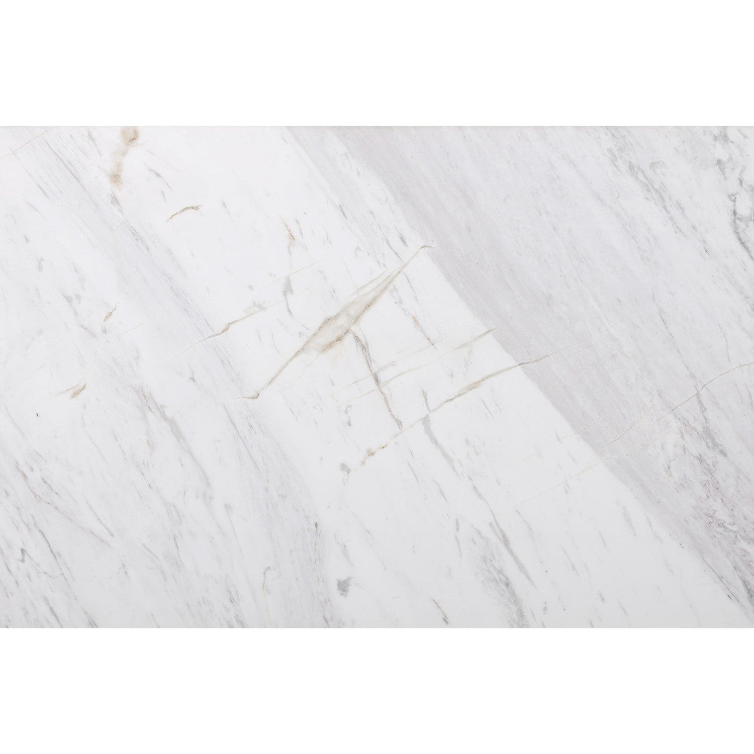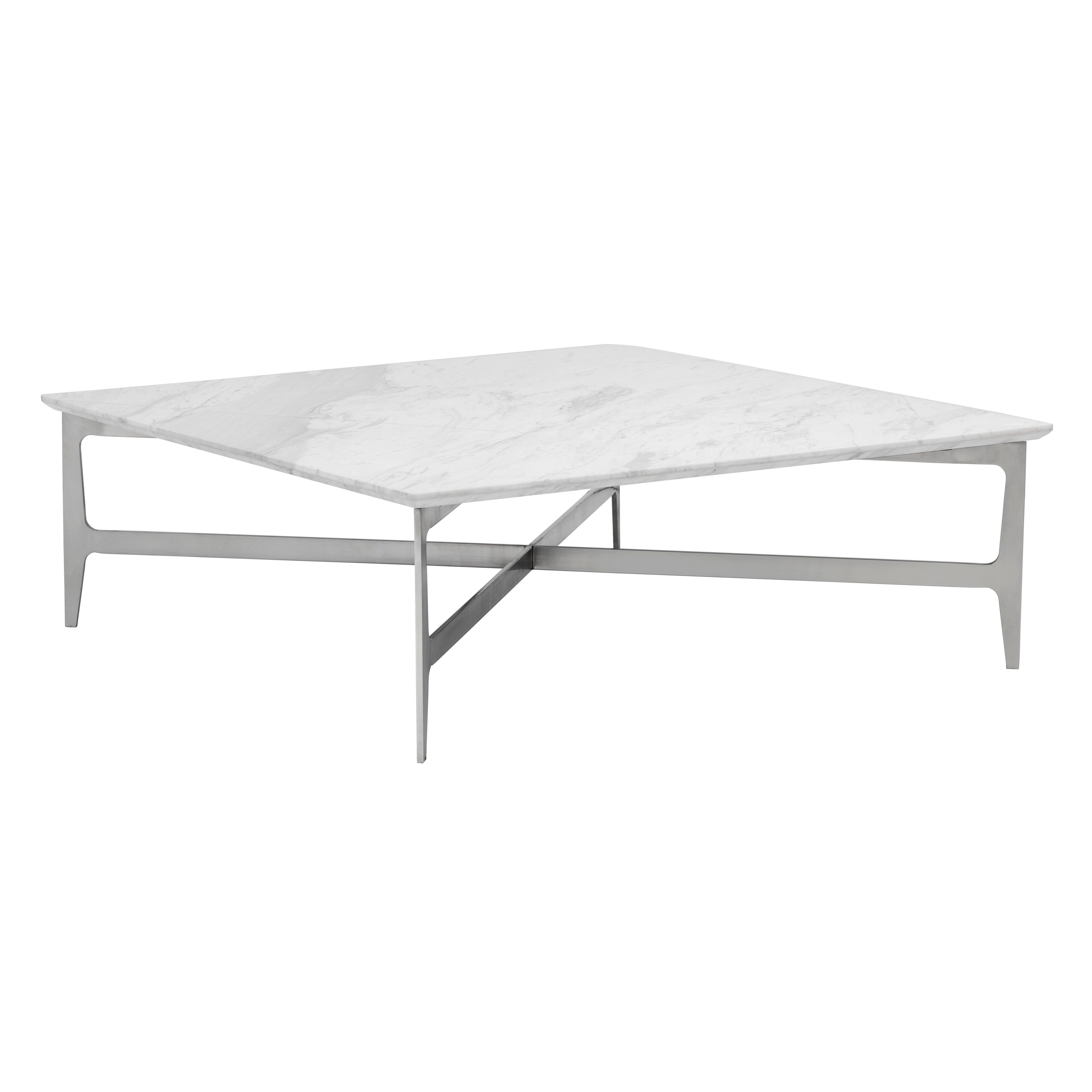 Chic and elegant, this spectacular coffee table features a brushed stainless steel base with a beveled white marble layer top. Each piece is uniquely marked with grey veining. As marble is a natural material, unique veining, pitting, fissures, micro-cracks and colour variations are all characteristics that add to the uniqueness and beauty of each piece.