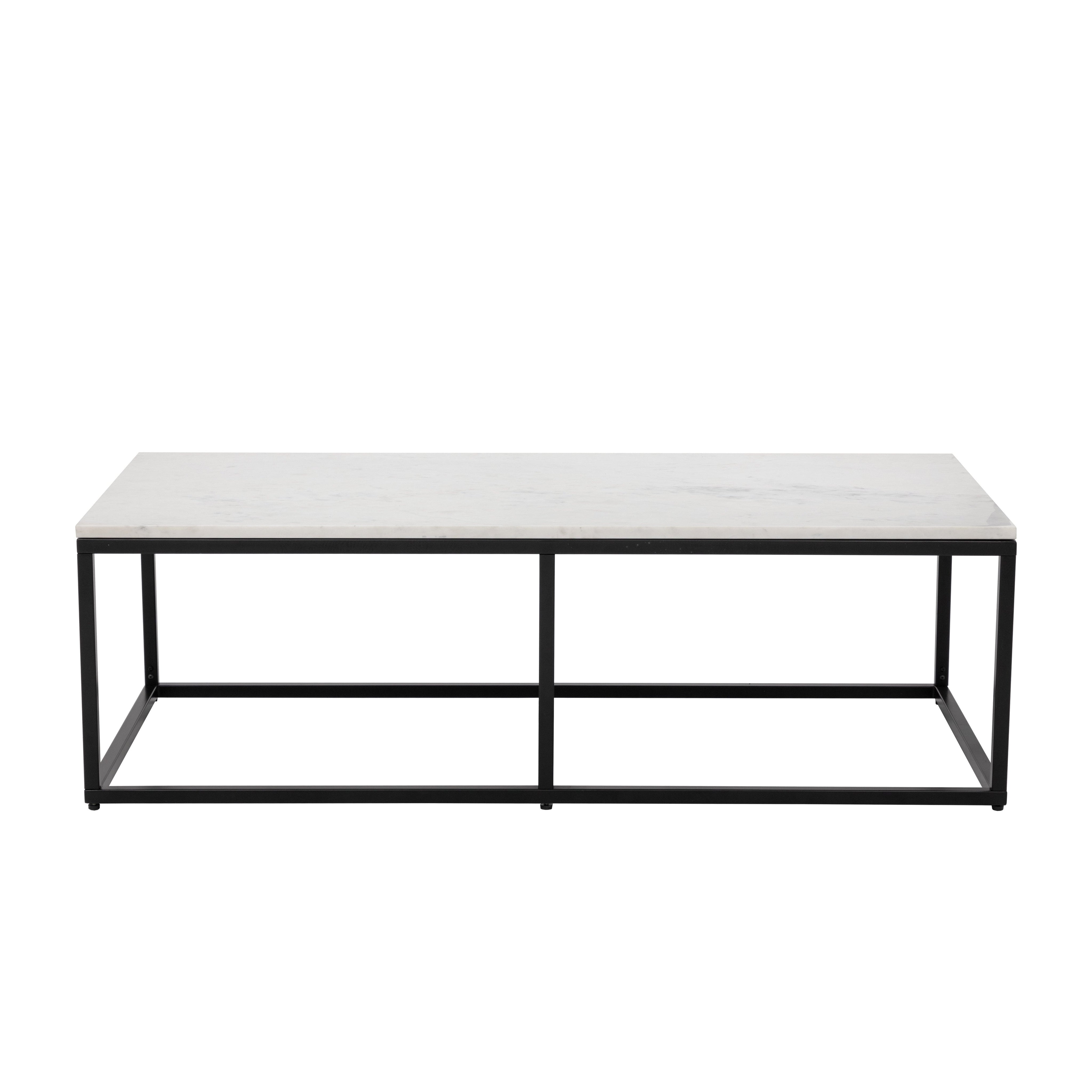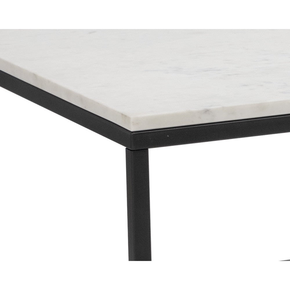 With an understated design, this modern coffee table is made distinct by clean lines. Features a white polished natural marble table top with a matte black powder coated steel base. Coordinating console and end tables also available. As marble is a natural material, unique veining, pitting, fissures, micro-cracks and colour variations are all characteristics that add to the uniqueness and beauty of each piece. Made in India. With refined craftsmanship, this design was brought to life by skilled local artisans. Due to the nature of handcraftsmanship, unique imperfections such as fissures, markings and variations in colour and shape are welcomed and appreciated characteristics for a truly one-of-a-kind piece.