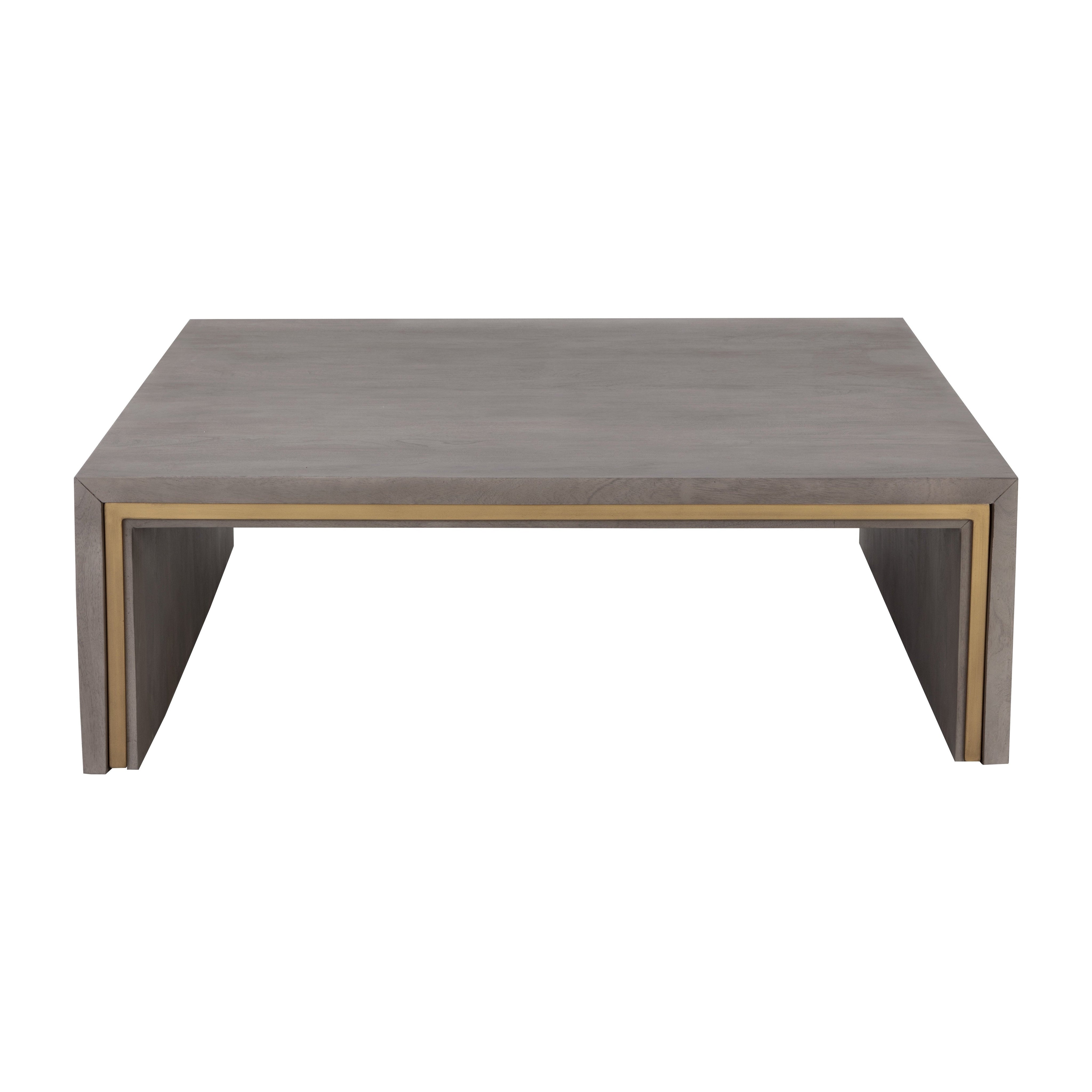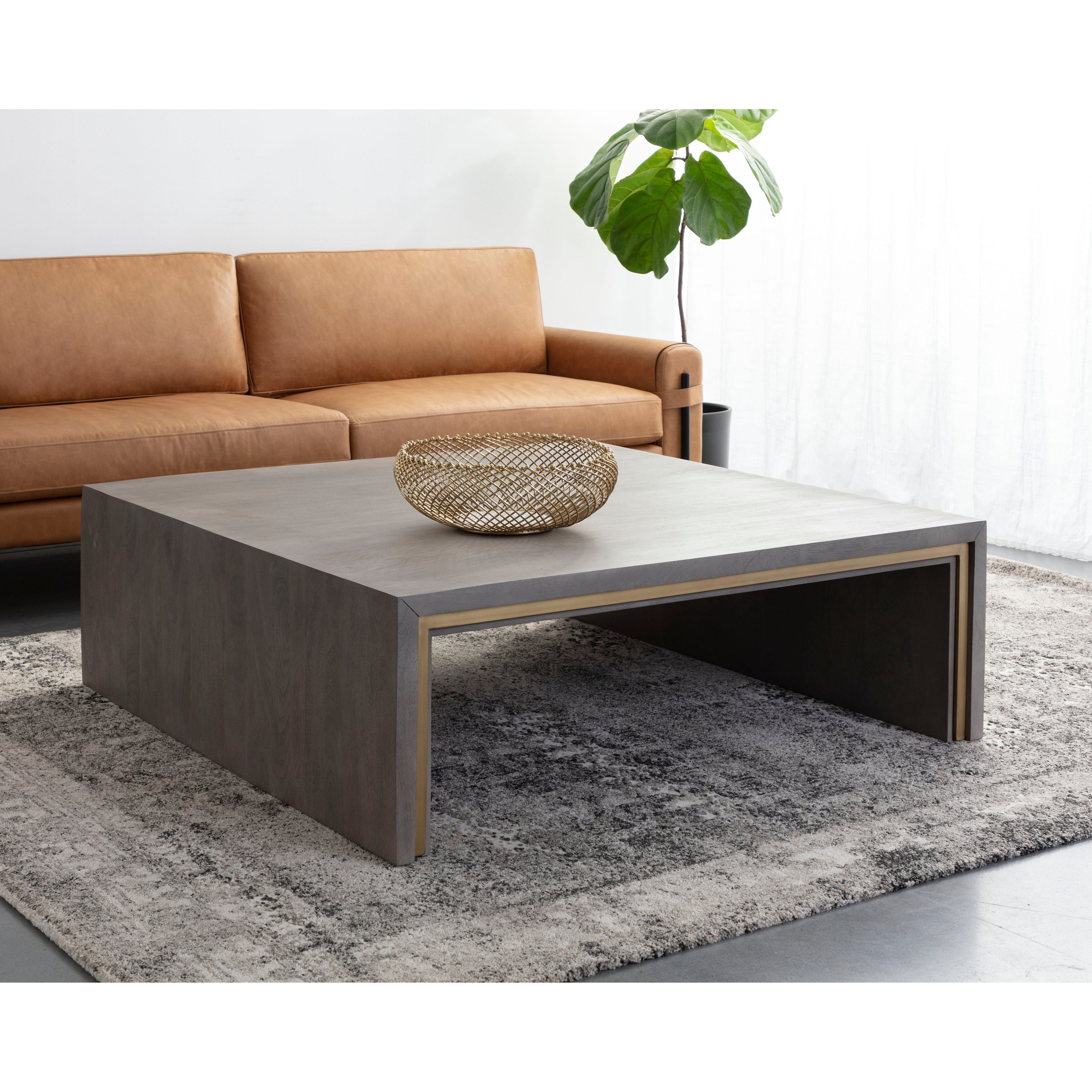 The Hilbert Coffee Table is grounded in a functional modern design. Crafted from grey acacia wood, this console table features a sharp linear silhouette. A brass iron trim on the front and the back of the piece provides added dimension and intrigue to the overall look. As wood is an organic, porous material, these pieces will contain natural variations of texture and may also exhibit fine indentations and cracks. Wood pieces will also display a disparity of colour and grain, and visible knots and burls that add to the character of each piece. Made in India. With refined craftsmanship, this design was brought to life by skilled local artisans. Due to the nature of handcraftsmanship, unique imperfections such as fissures, markings and variations in colour and shape are welcomed and appreciated characteristics for a truly one-of-a-kind piece.